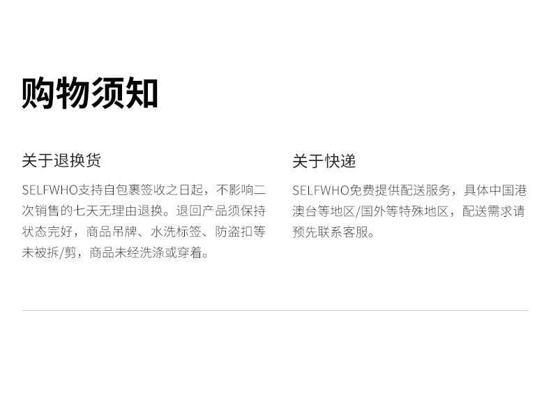 - SELFWHO——将街头文化融入高级成衣,以服装为载体,用廓形、解构设计和艺术意象探寻极致的生活方式。特立独行,知行合一,TO BE YOURSELF。