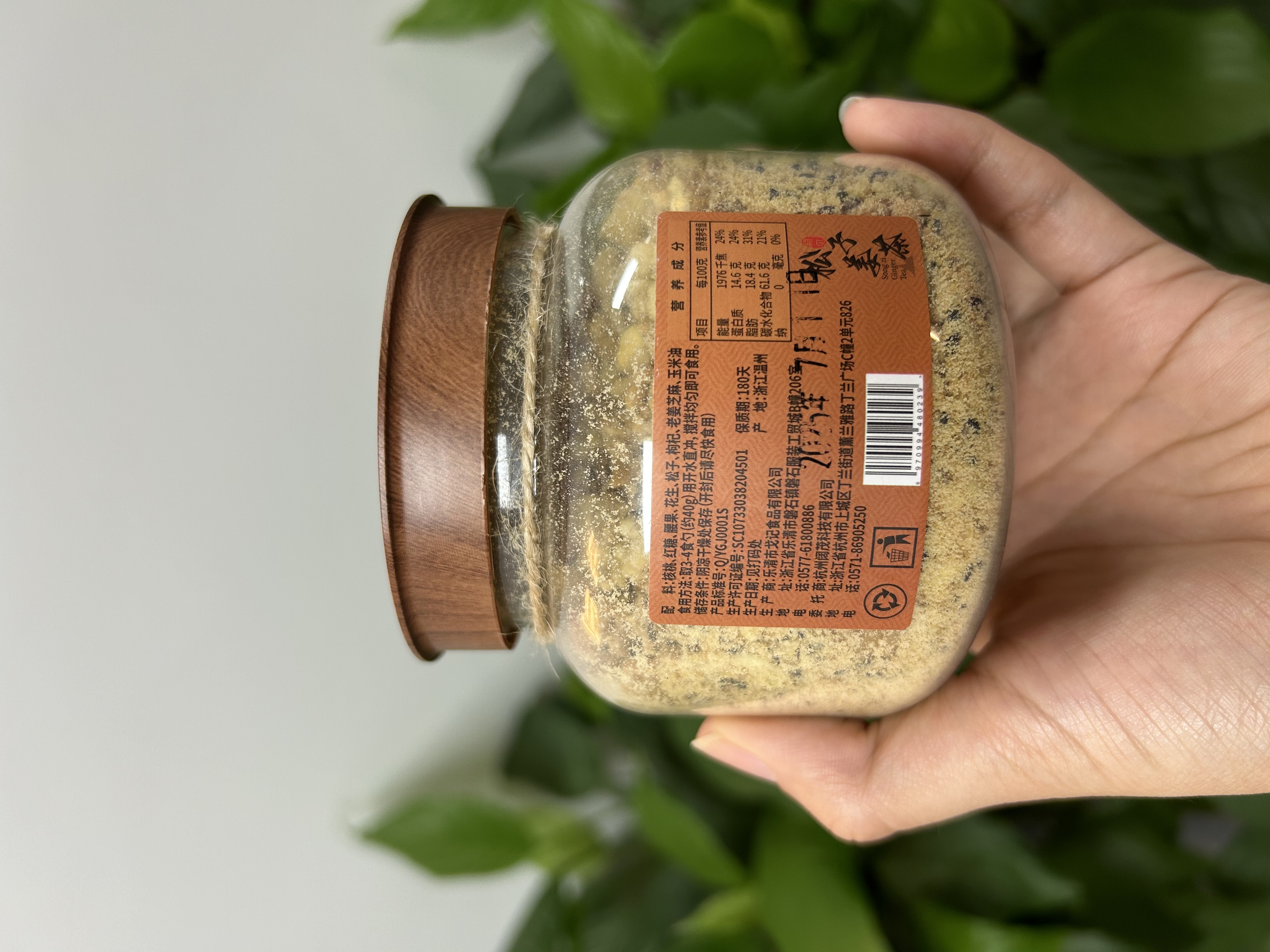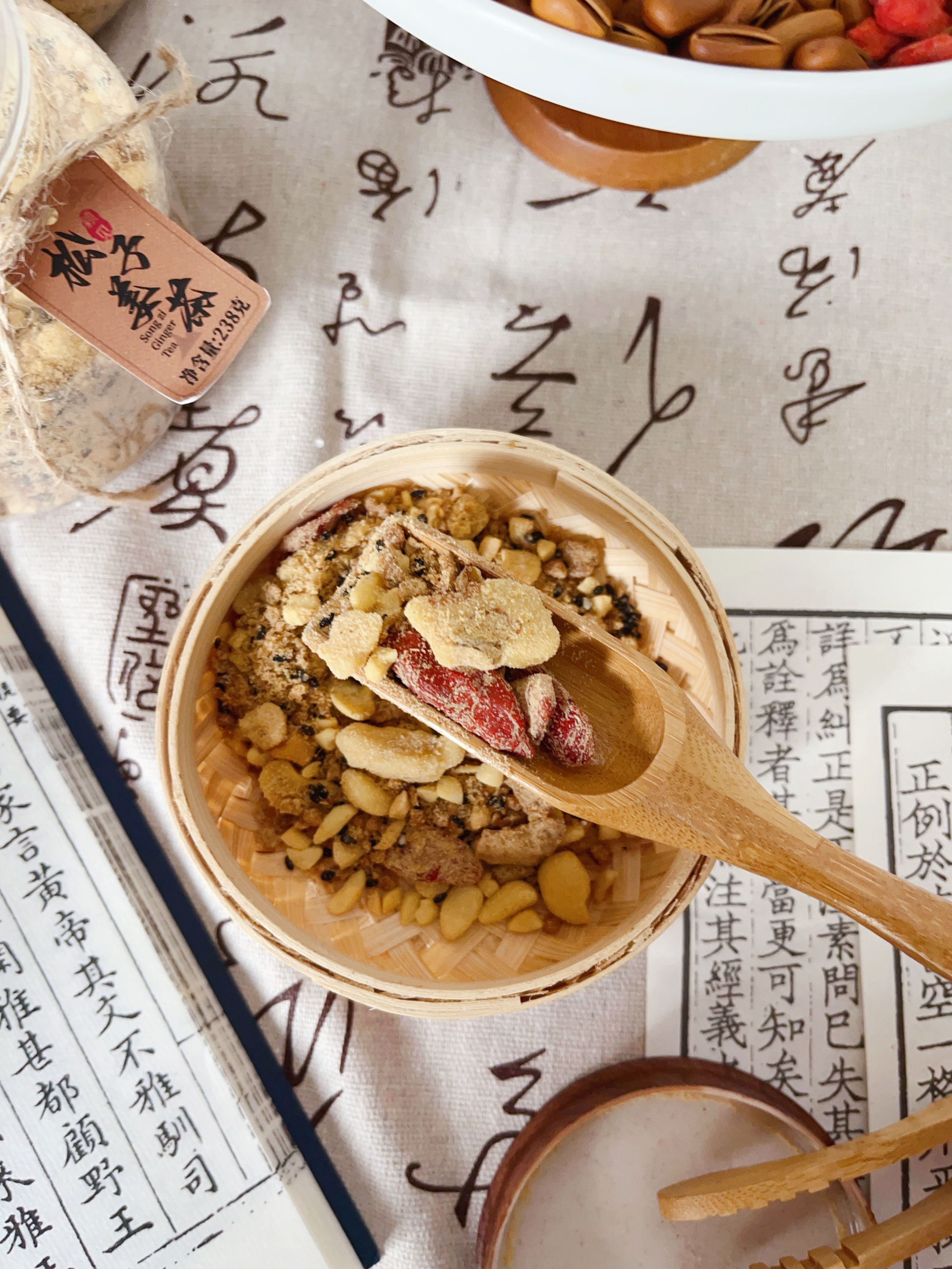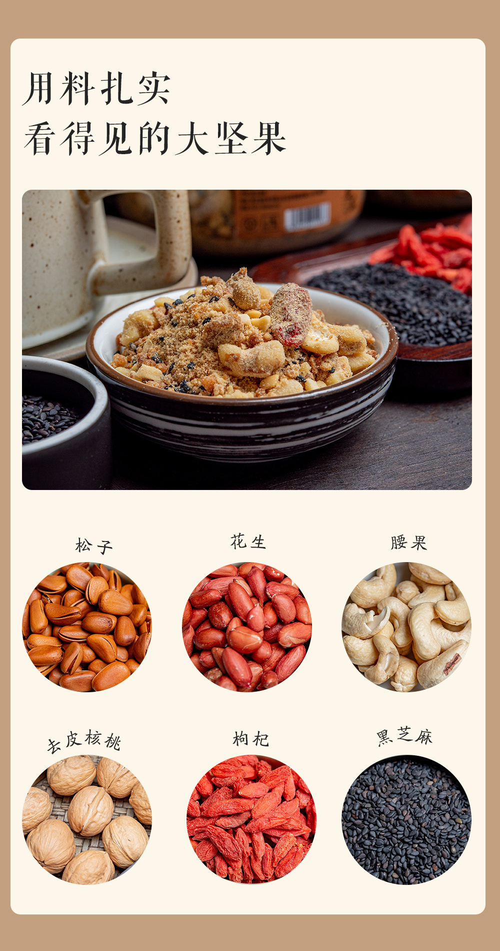 ❗料超级多:腰果 核桃、红糖、花生、松子、枸杞、老姜、芝麻再加入玉米油,经过低温烘焙和柴火翻炒,嚼起来更香了~