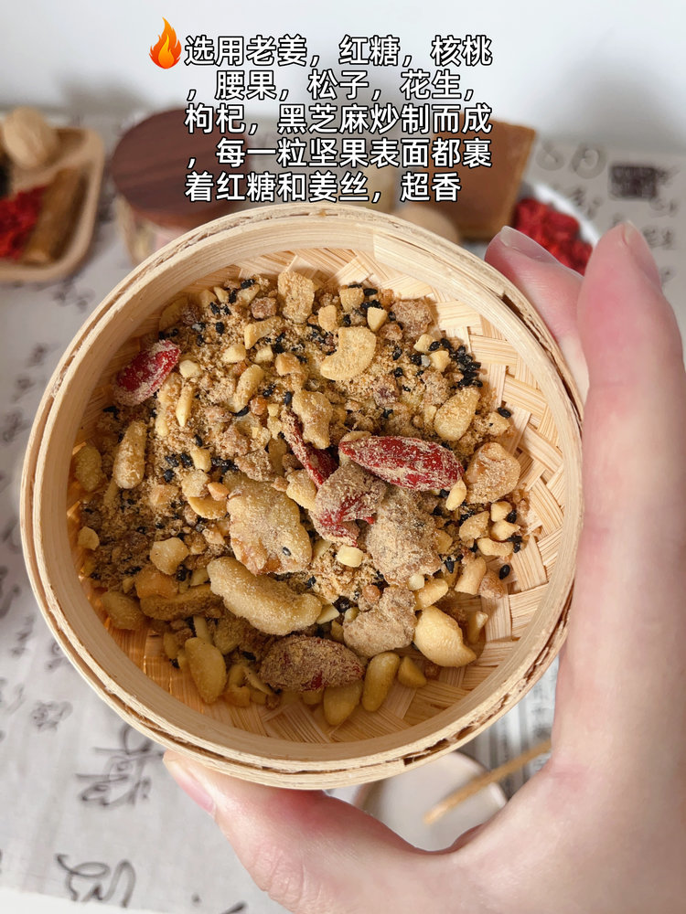 配料:腰果 核桃、红糖、花生、松子、枸杞、老姜、芝麻、玉米油