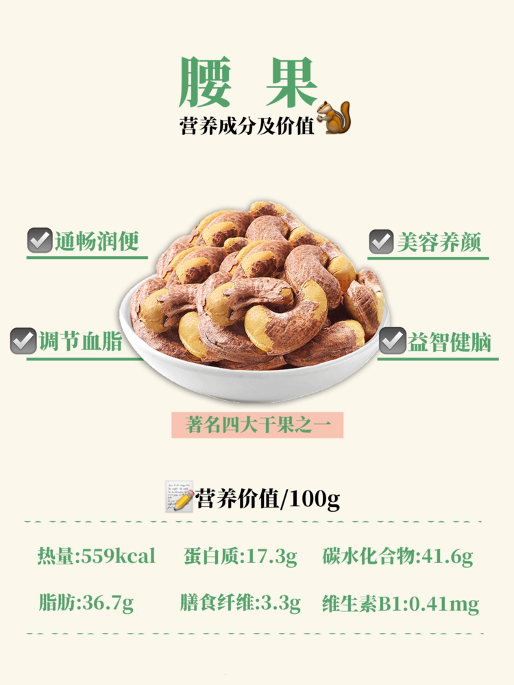 ✅美容养颜:腰果营养丰富,含有维生素A、维生素C、维生素E等,这些成分能够为皮肤细胞提供营养,还具有抗氧化的作用,有美容养颜的效果