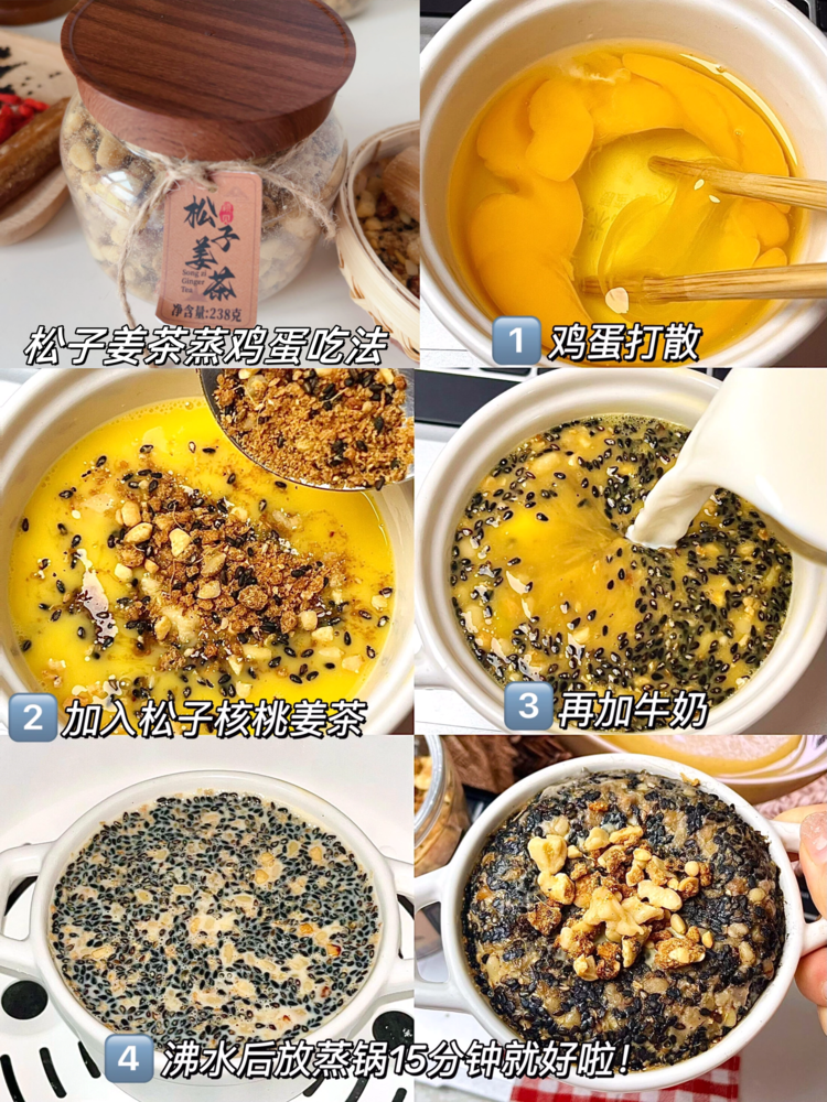 鸡蛋嫩嫩滑滑,松子核桃香香脆脆的,混合着红糖和牛乳的香甜,太好吃了!