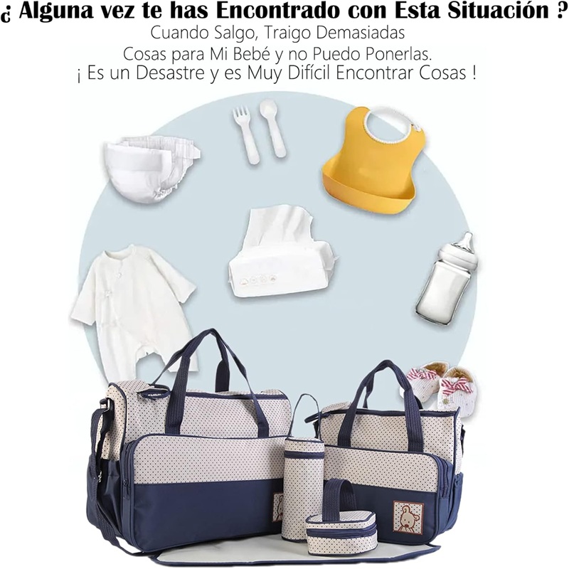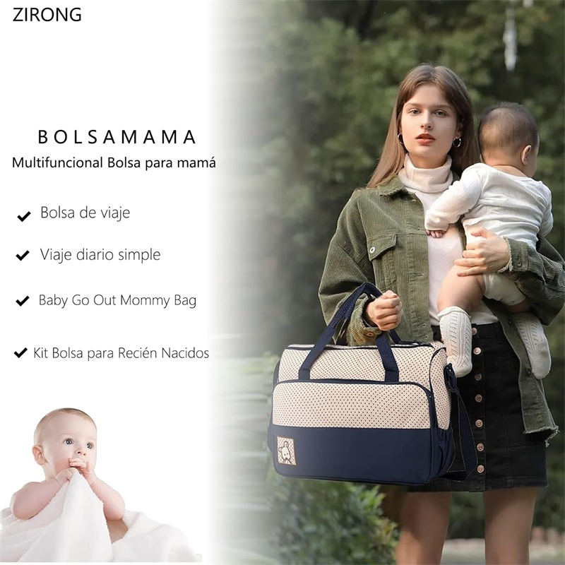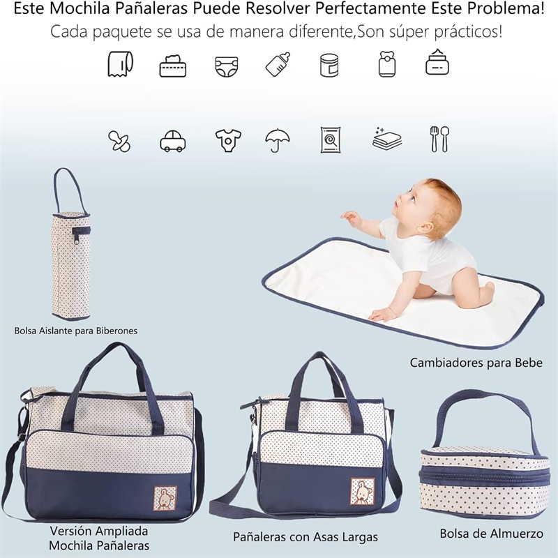 五件套包含:1个大号收纳包,1个小号收纳包,1个奶瓶保温包,1个尿布袋和1个婴儿换尿布垫; 只需把你需要的一切放进这个一体化尿布包里,你就可以开始了!