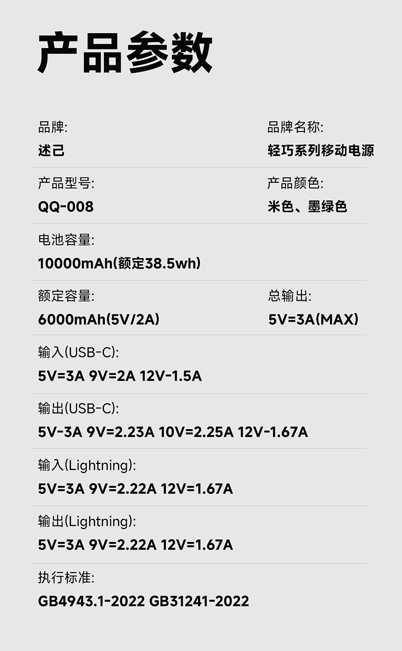 【电池容量】10000mAh(额定38.5Wh)【额定容量】6000mAh(5V/2A)