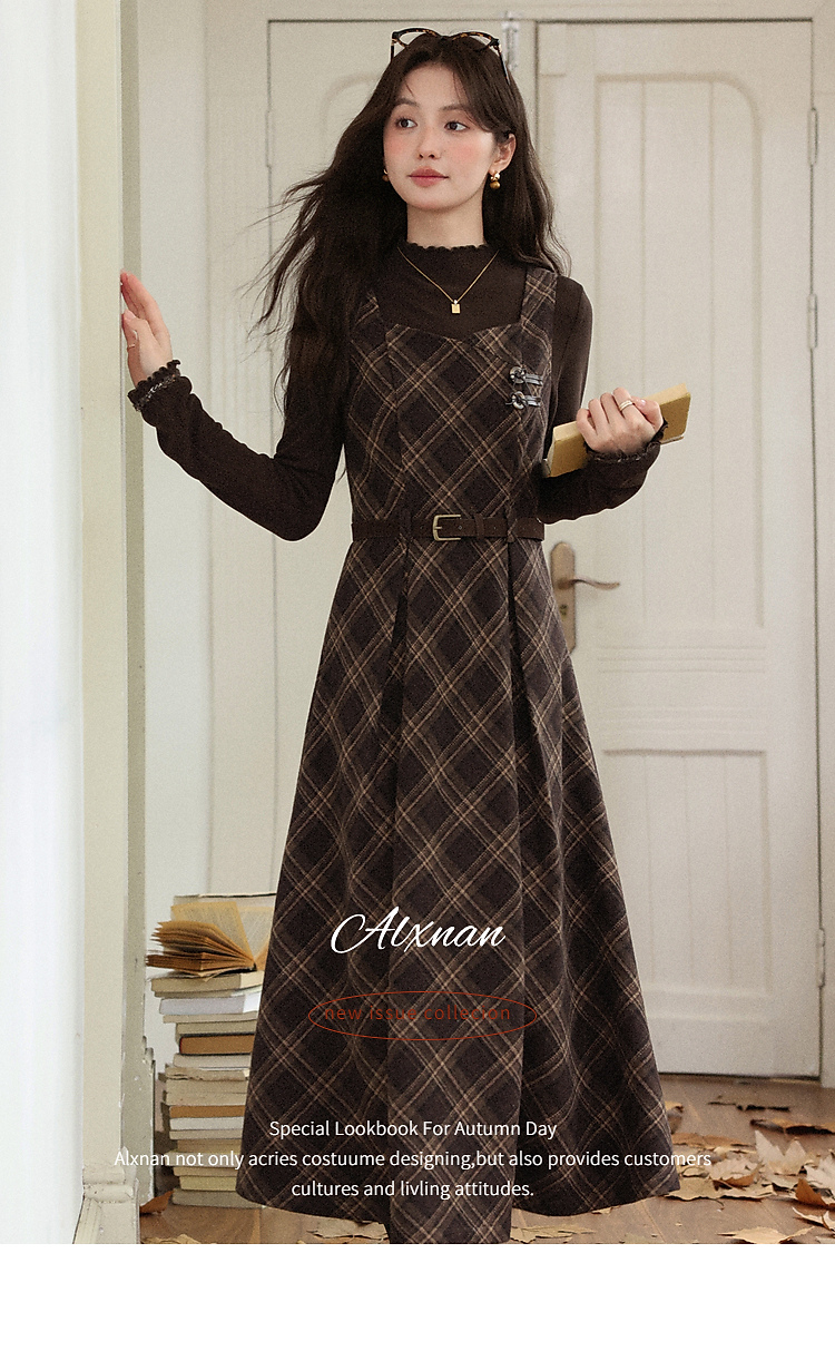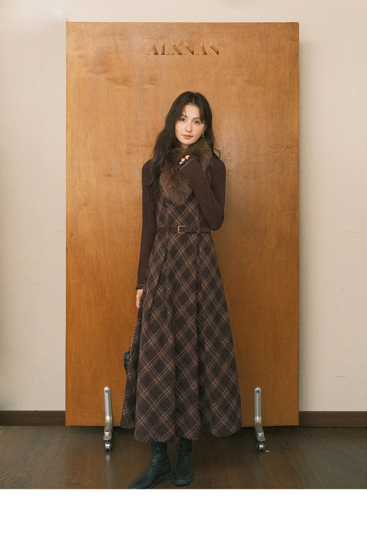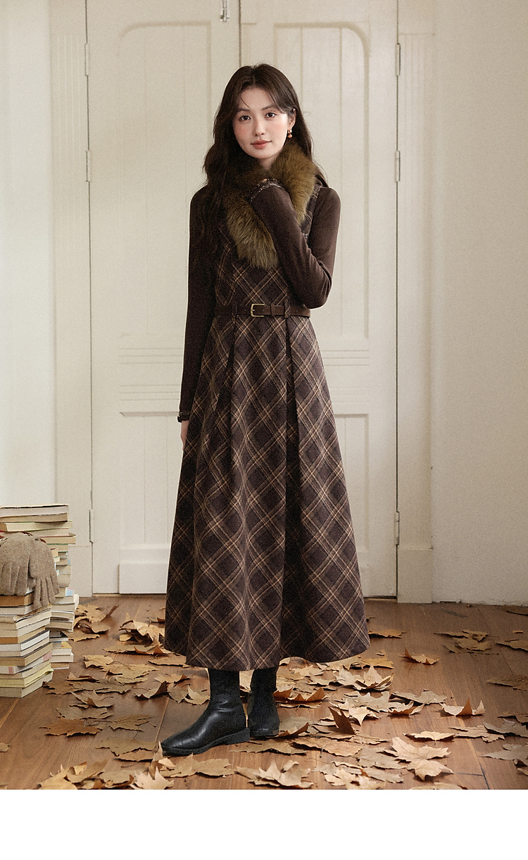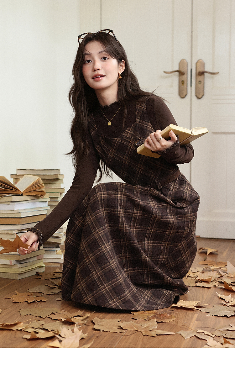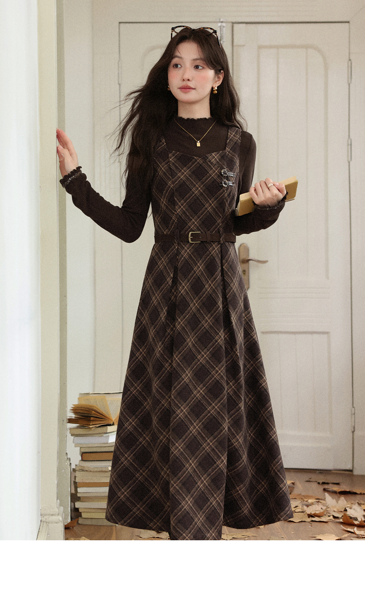 鹿向南「苏黎落叶」棕色格子背带连衣裙女秋季高级感显瘦长款裙子