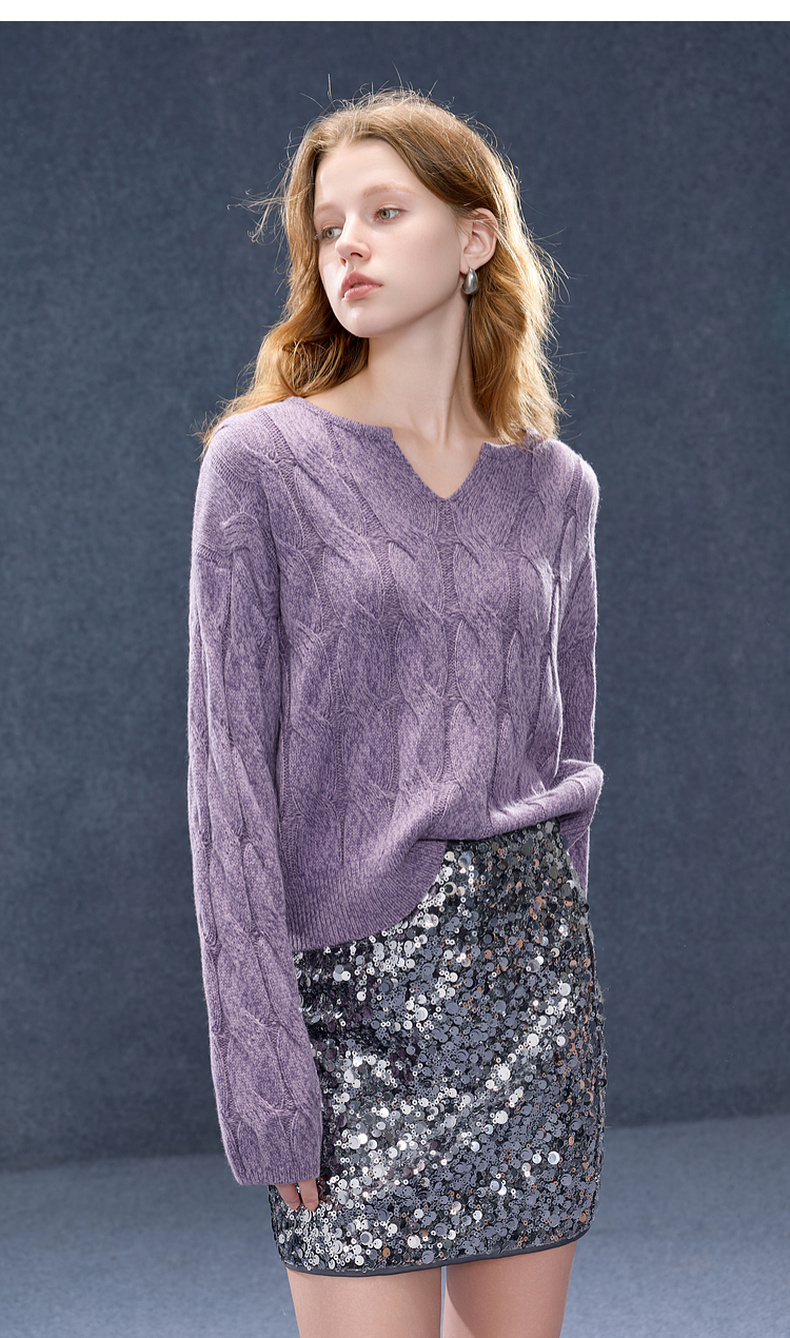 三彩2025秋季新款小V领绞花针织衫显瘦落肩袖毛衫上衣设计感M