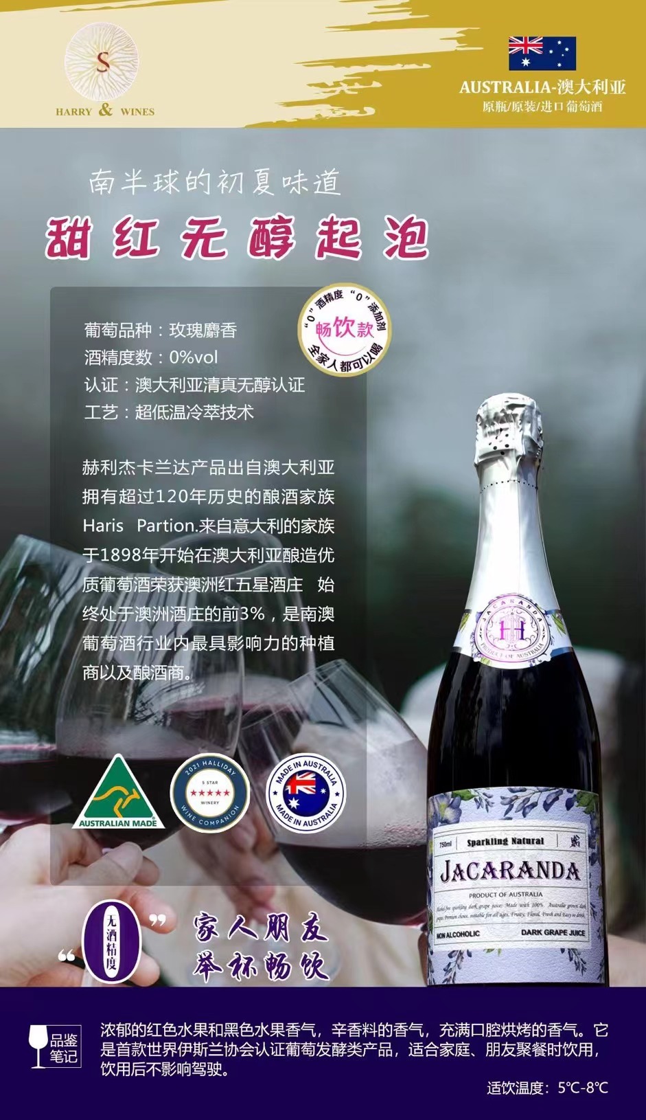 ✦无酒精!无添加!获澳大利亚清真无醇认证,也是首款世界伊斯兰协会认证的葡萄发酵类产品