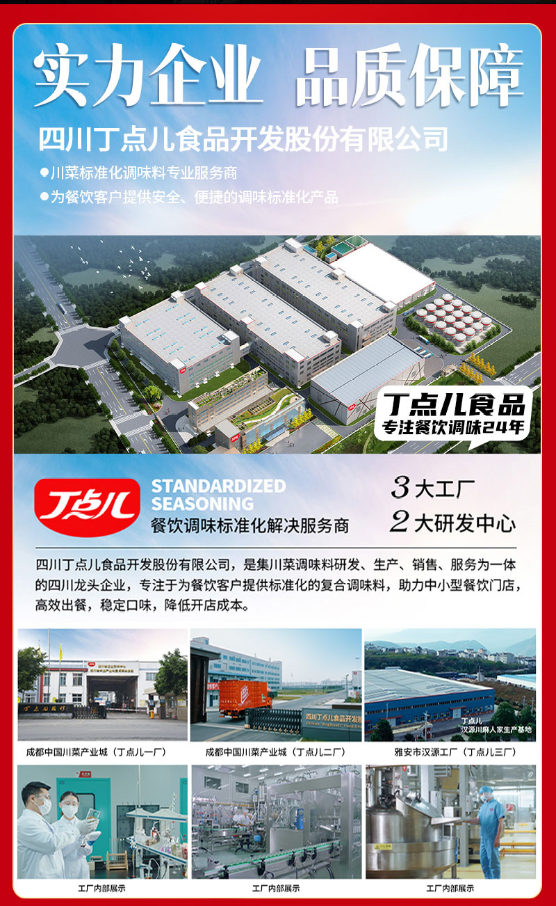 四川丁点儿食品开发股份有限公司,是集川菜调味料研发、生产、销售、服务为一体的现代化企业,专注为餐饮客户提供川菜调味解决方案。公司成立至今,服务了超百万家的餐饮门店以及连锁品牌。