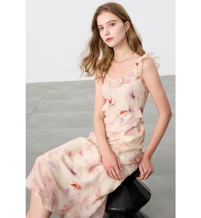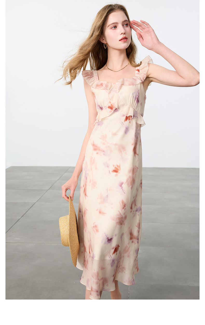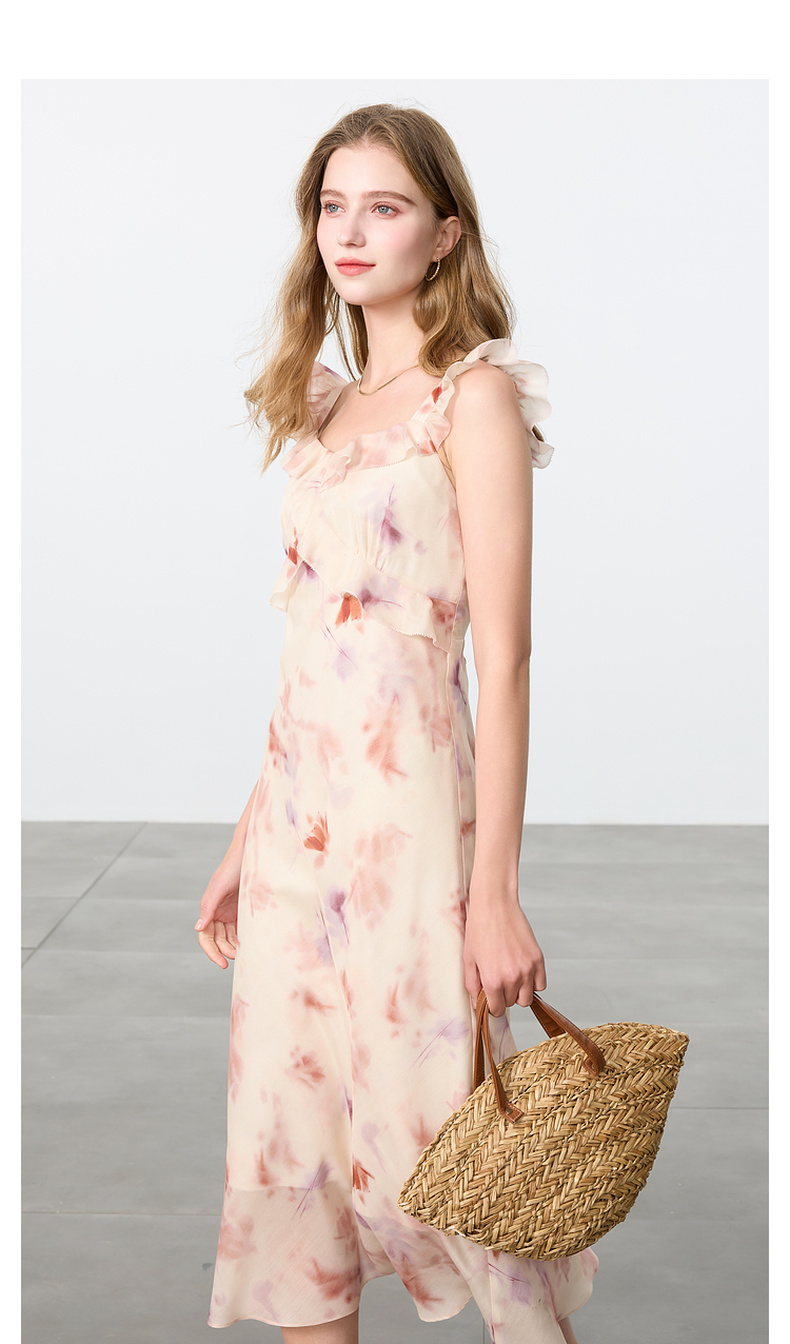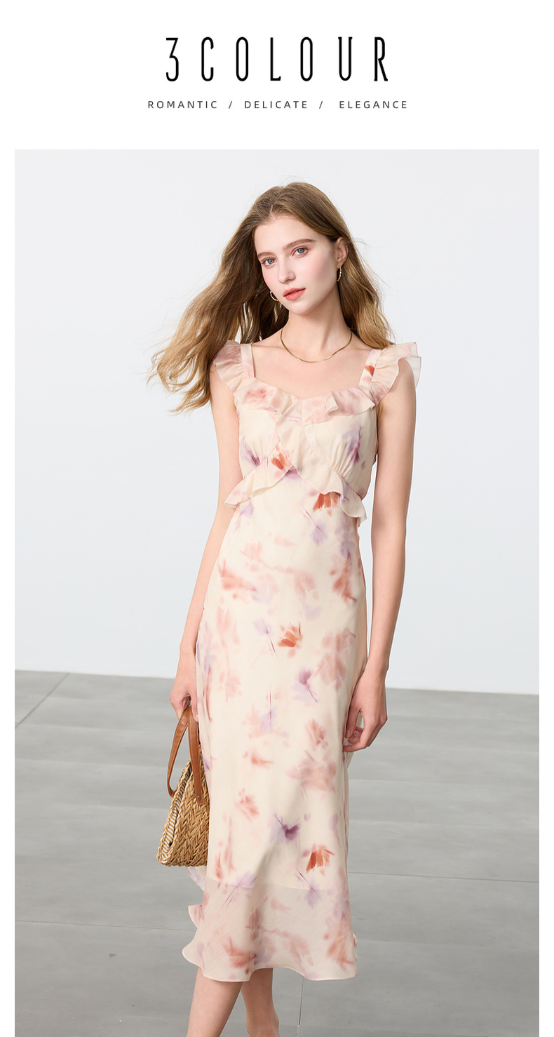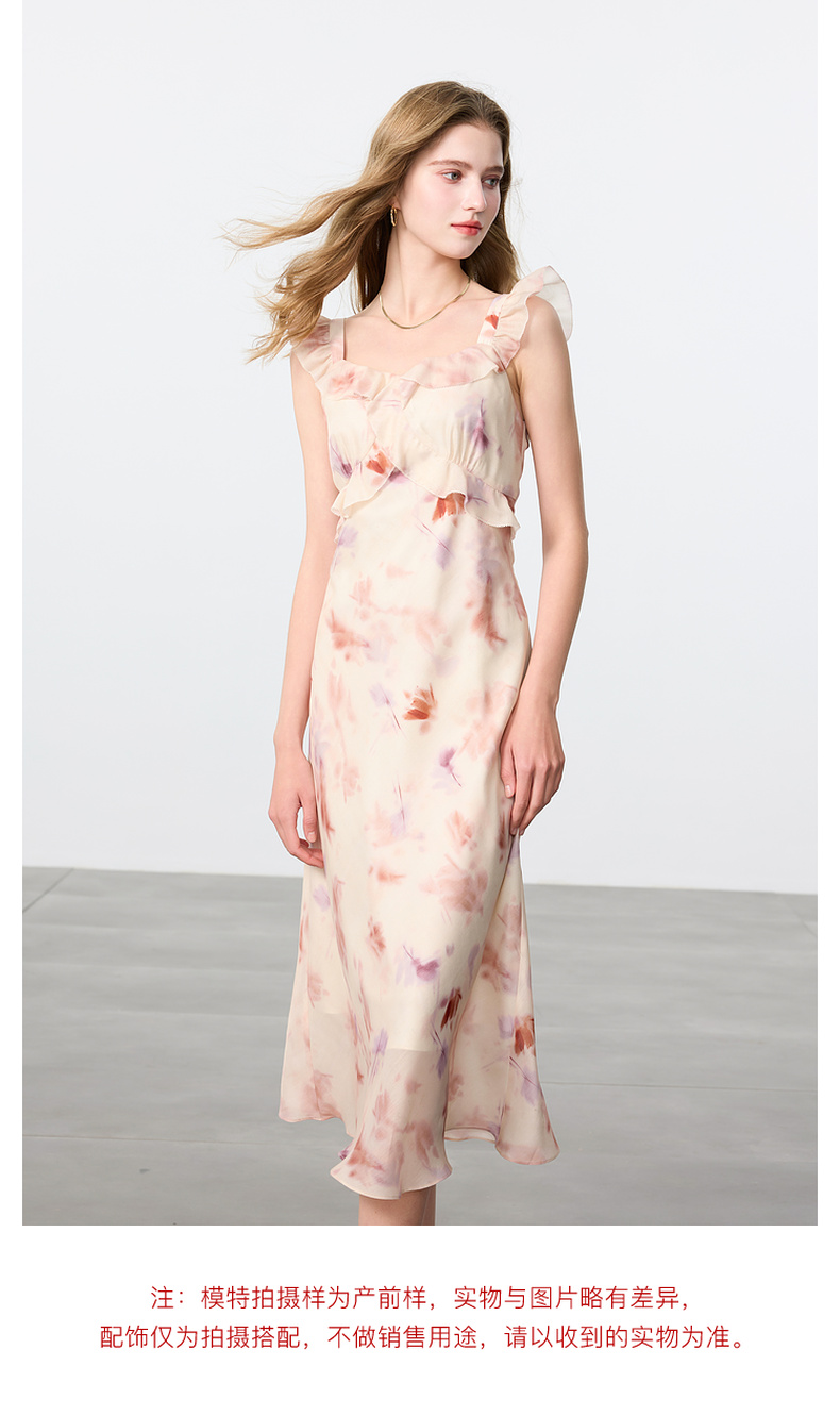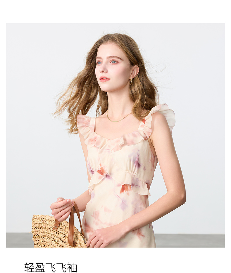 三彩2025春季新款晕染印花连衣裙飞飞袖方领收腰A字裙长裙M