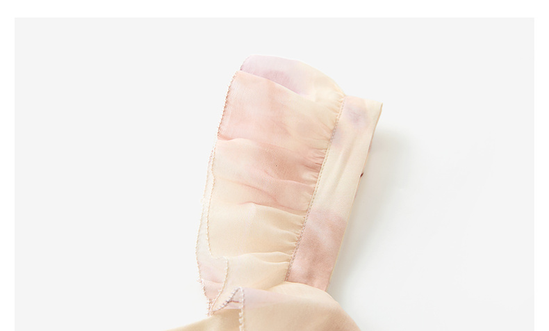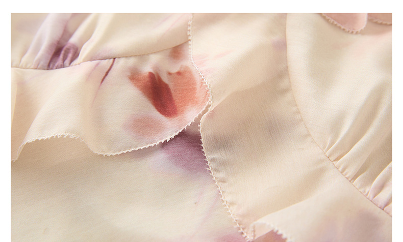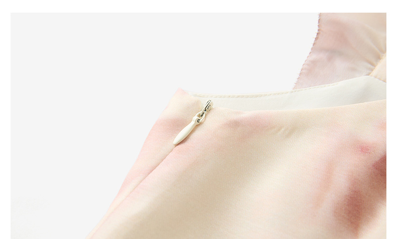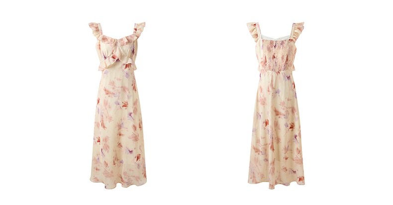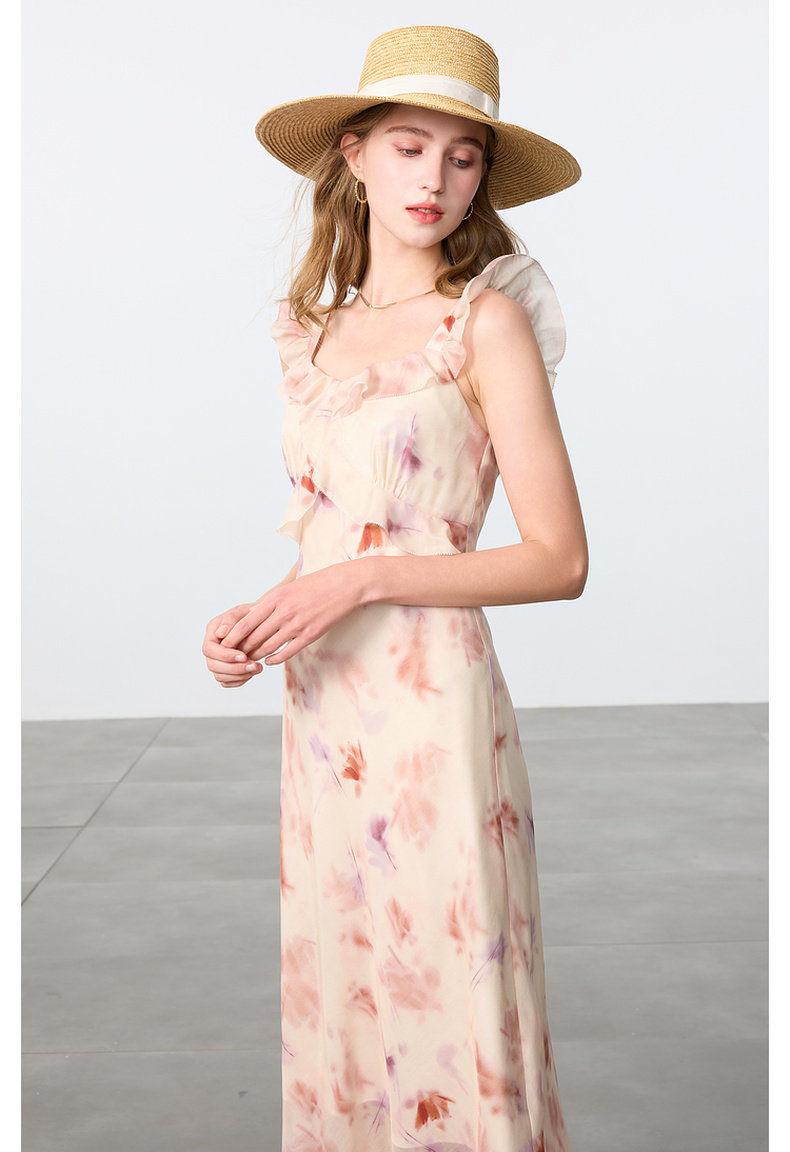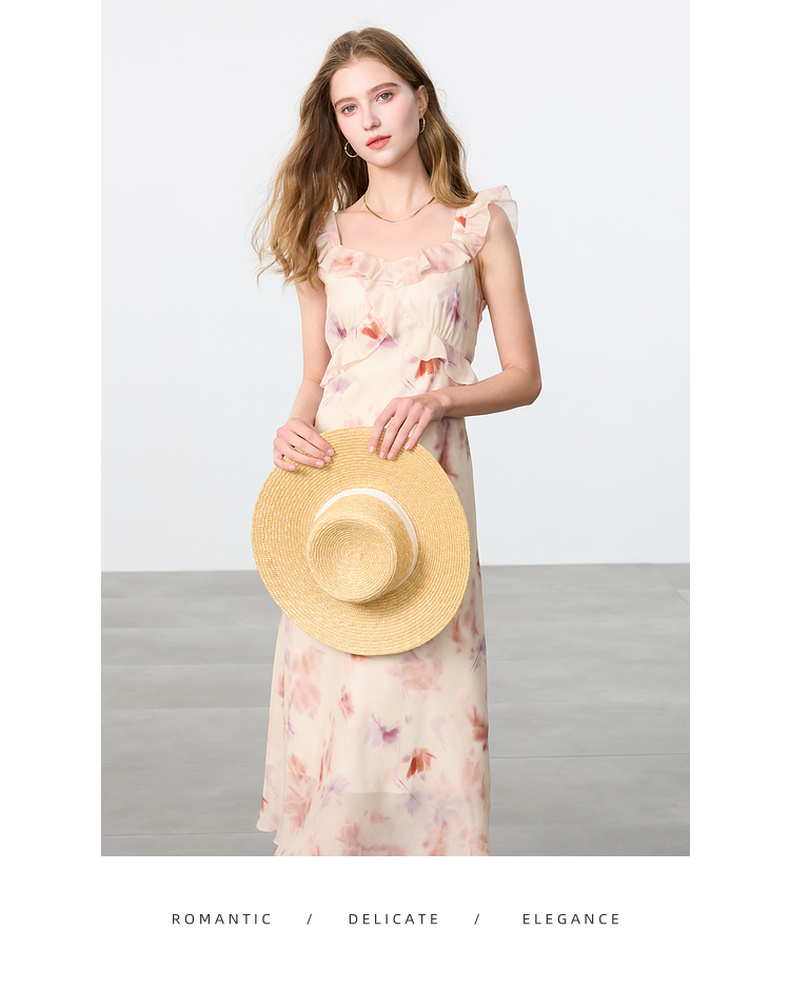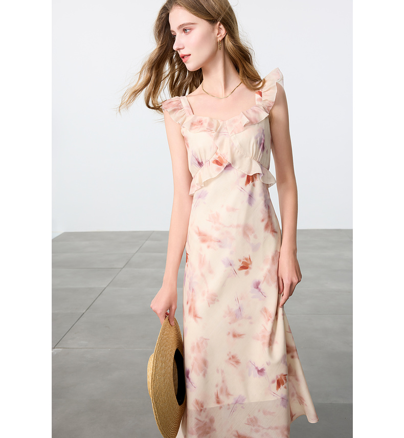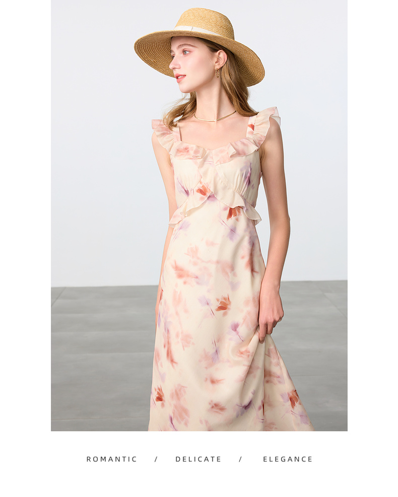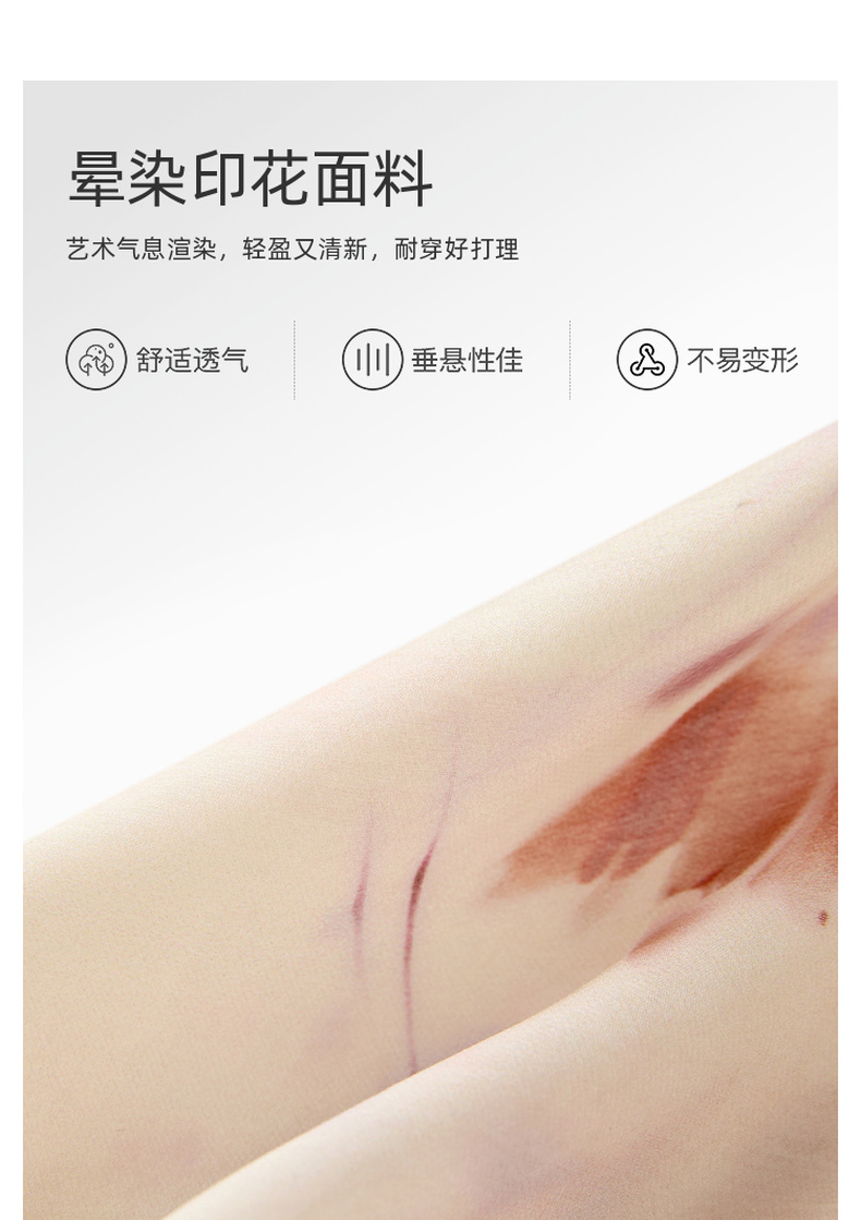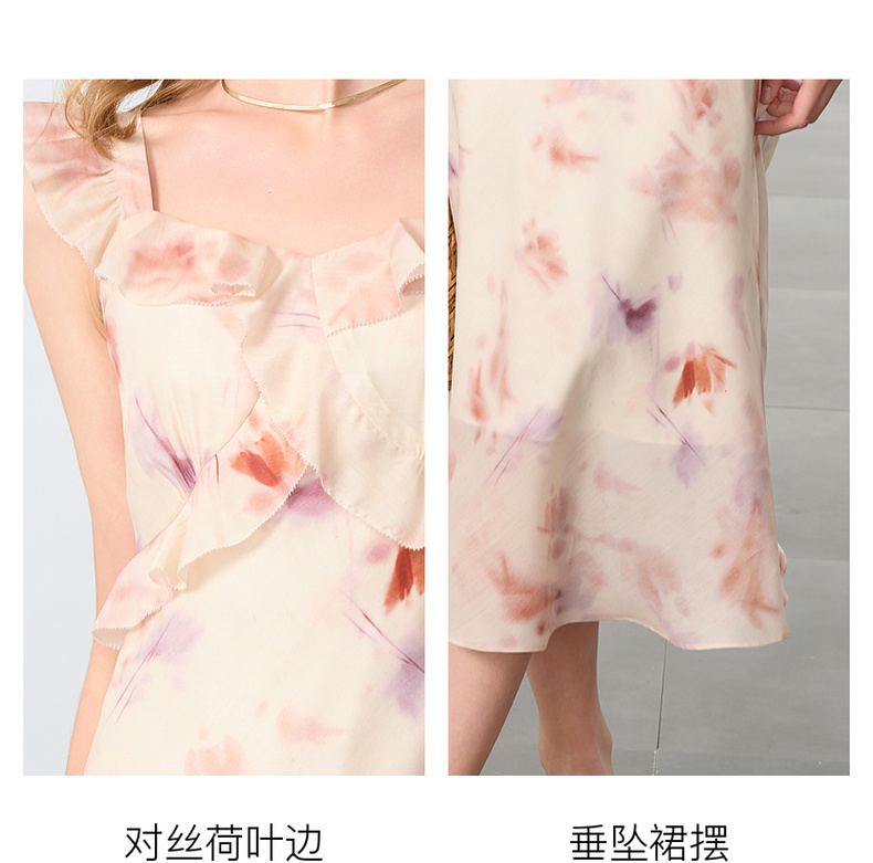 三彩2025春季新款晕染印花连衣裙飞飞袖方领收腰A字裙长裙M