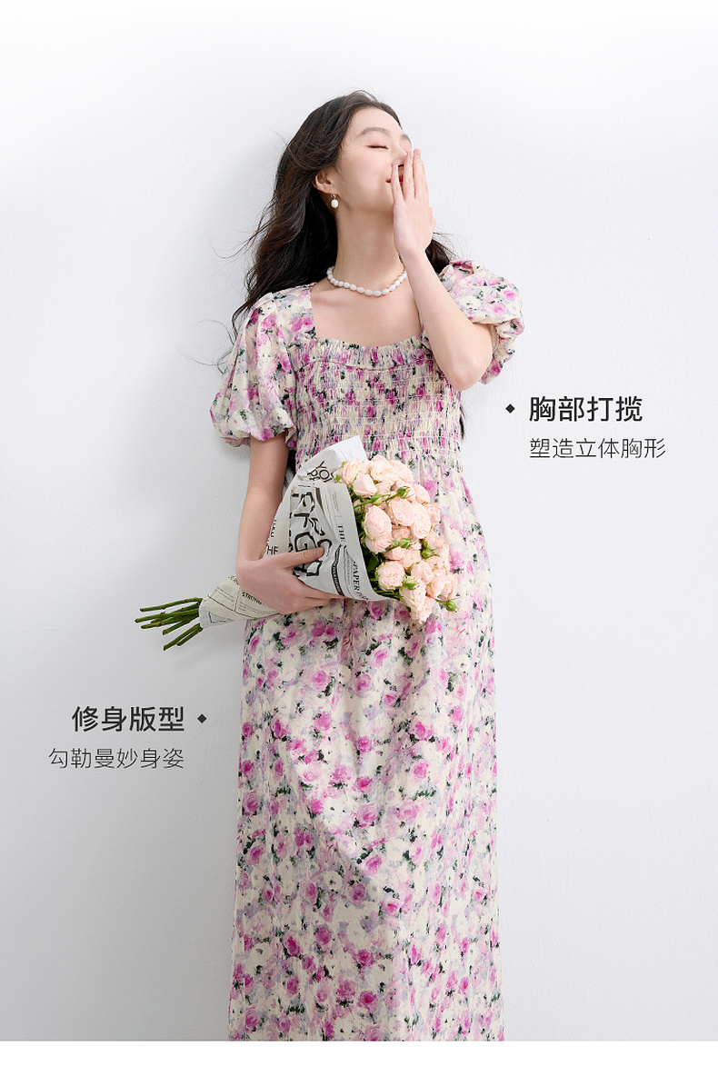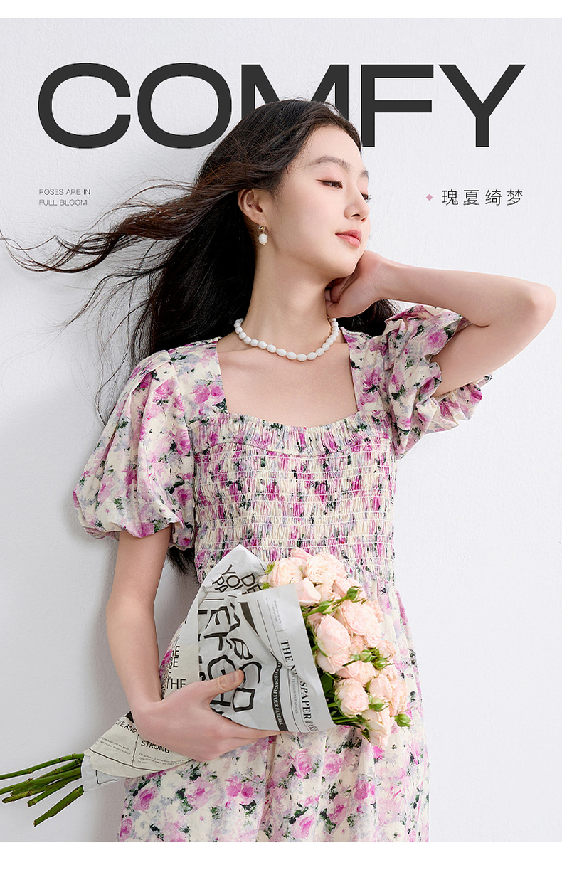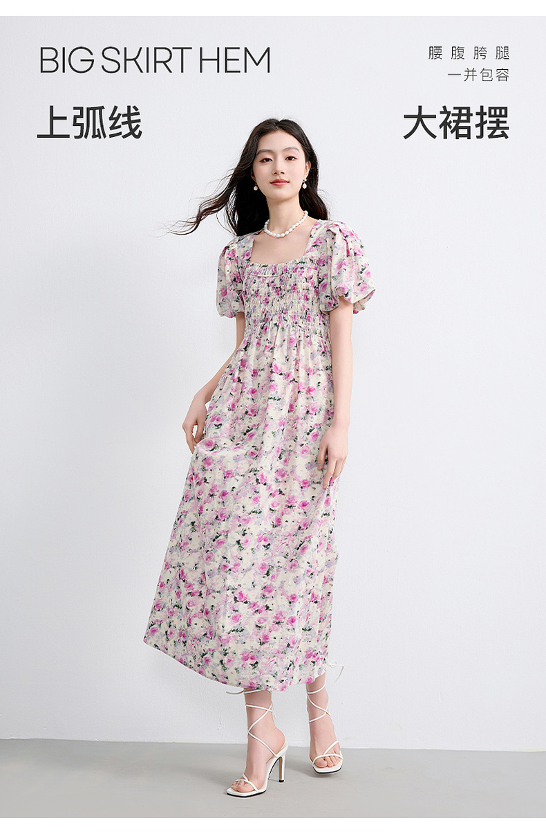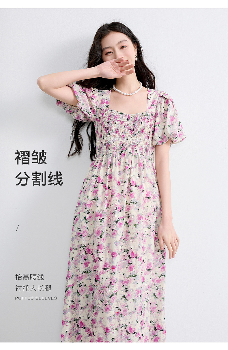 三彩2025夏季新款碎花连衣裙法式方领收腰A字裙泡泡袖长裙S