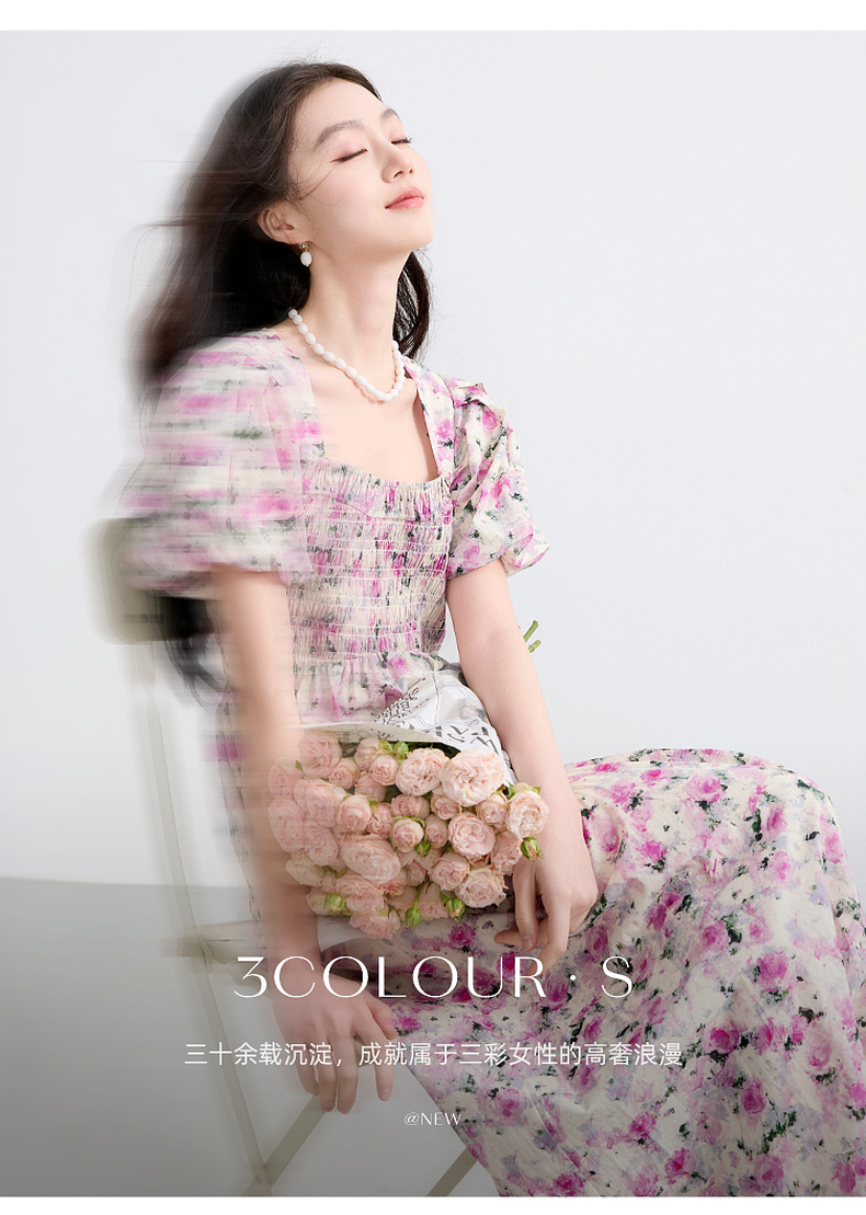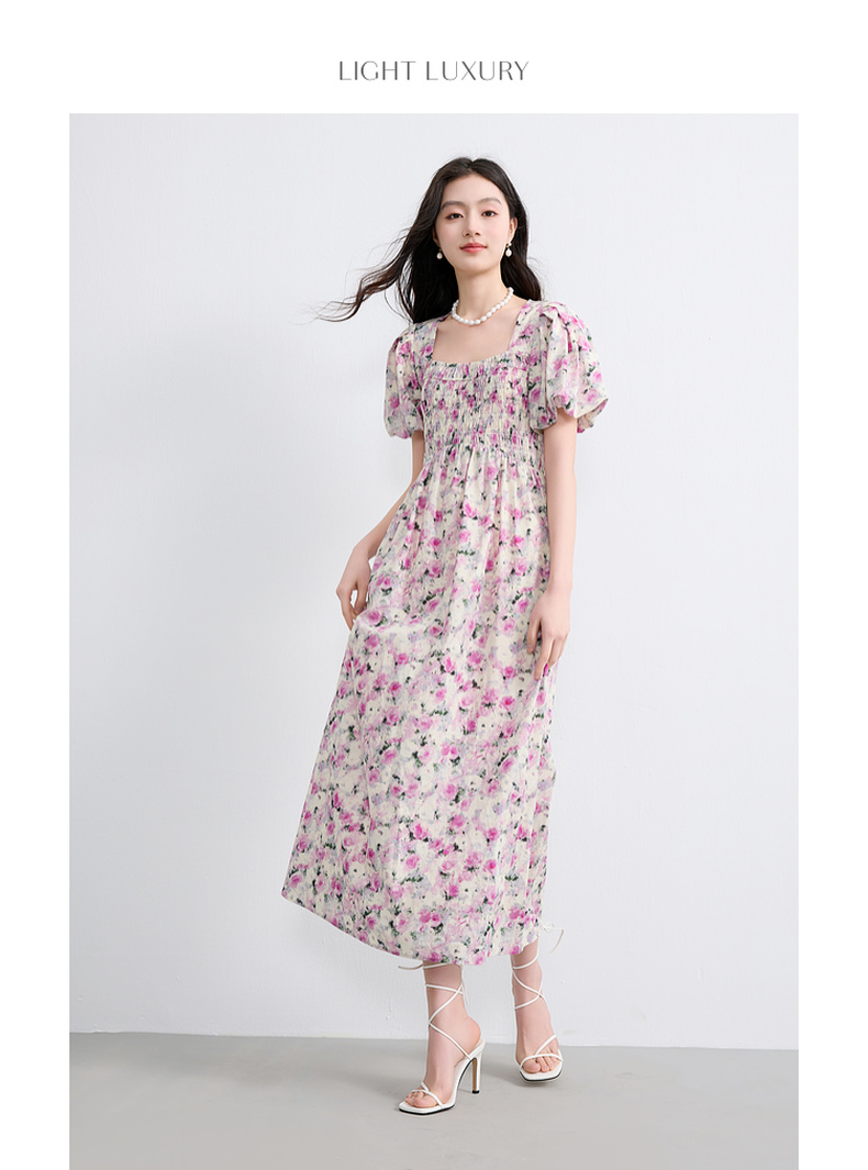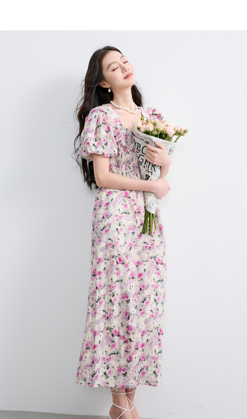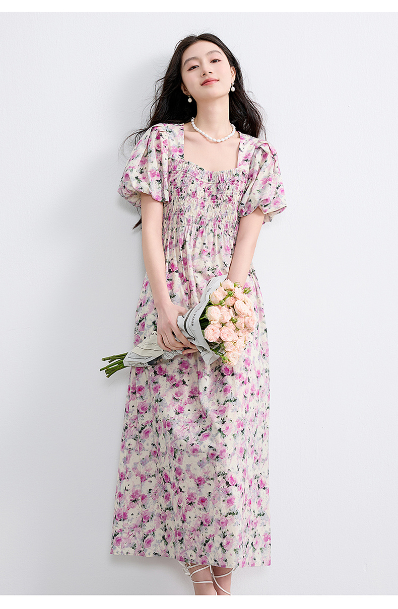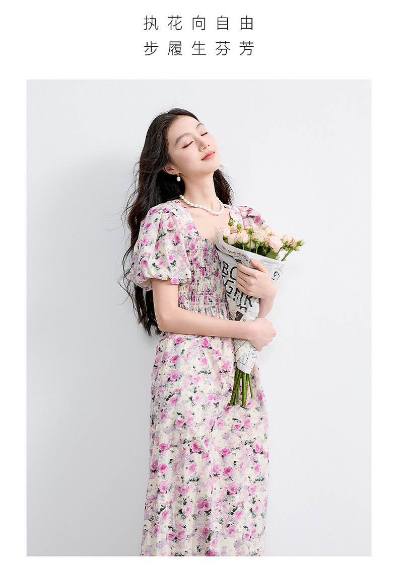 三彩2025夏季新款碎花连衣裙法式方领收腰A字裙泡泡袖长裙S