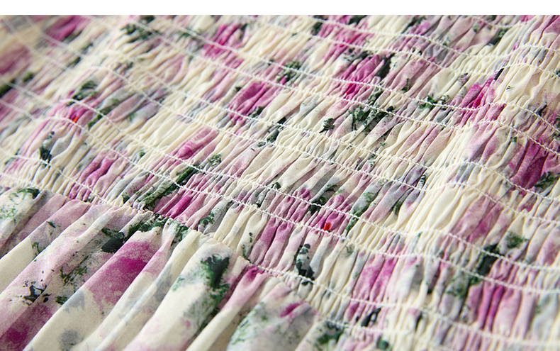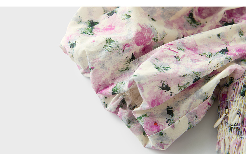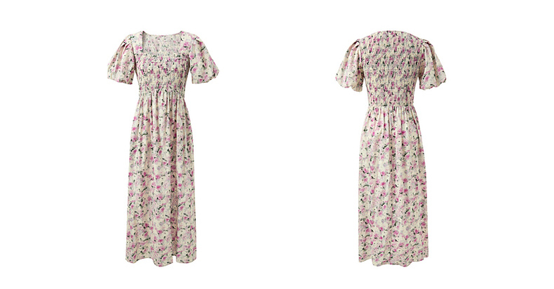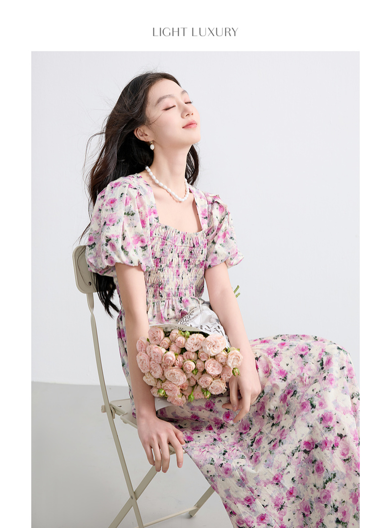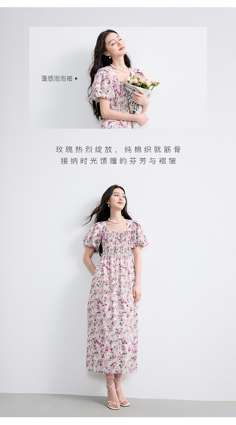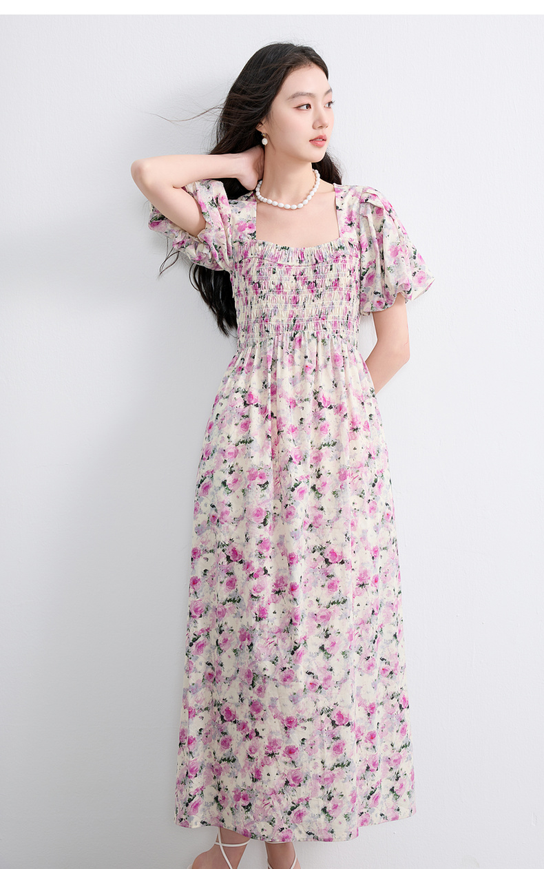 三彩2025夏季新款碎花连衣裙法式方领收腰A字裙泡泡袖长裙S