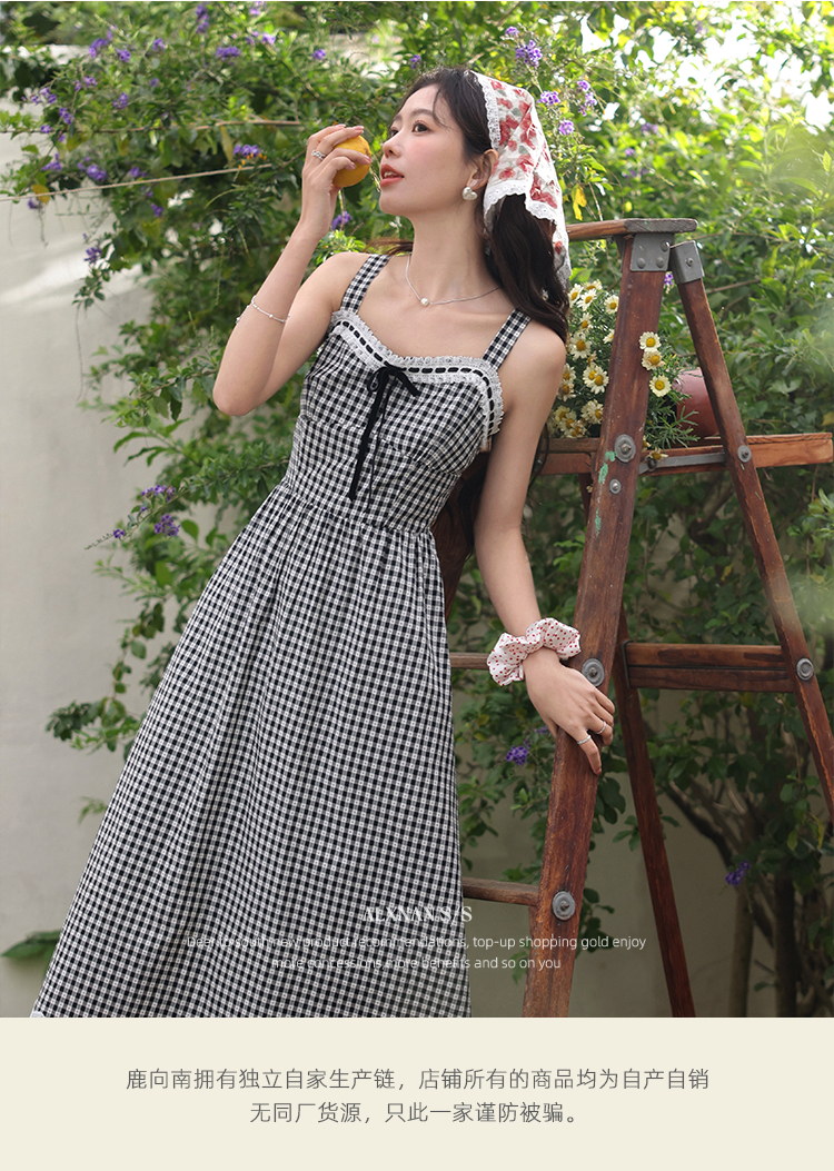 鹿向南「格调旧梦」黑白格纹复古吊带长裙夏季新款气质通勤连衣裙