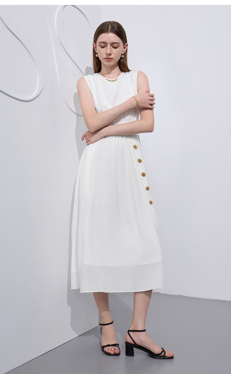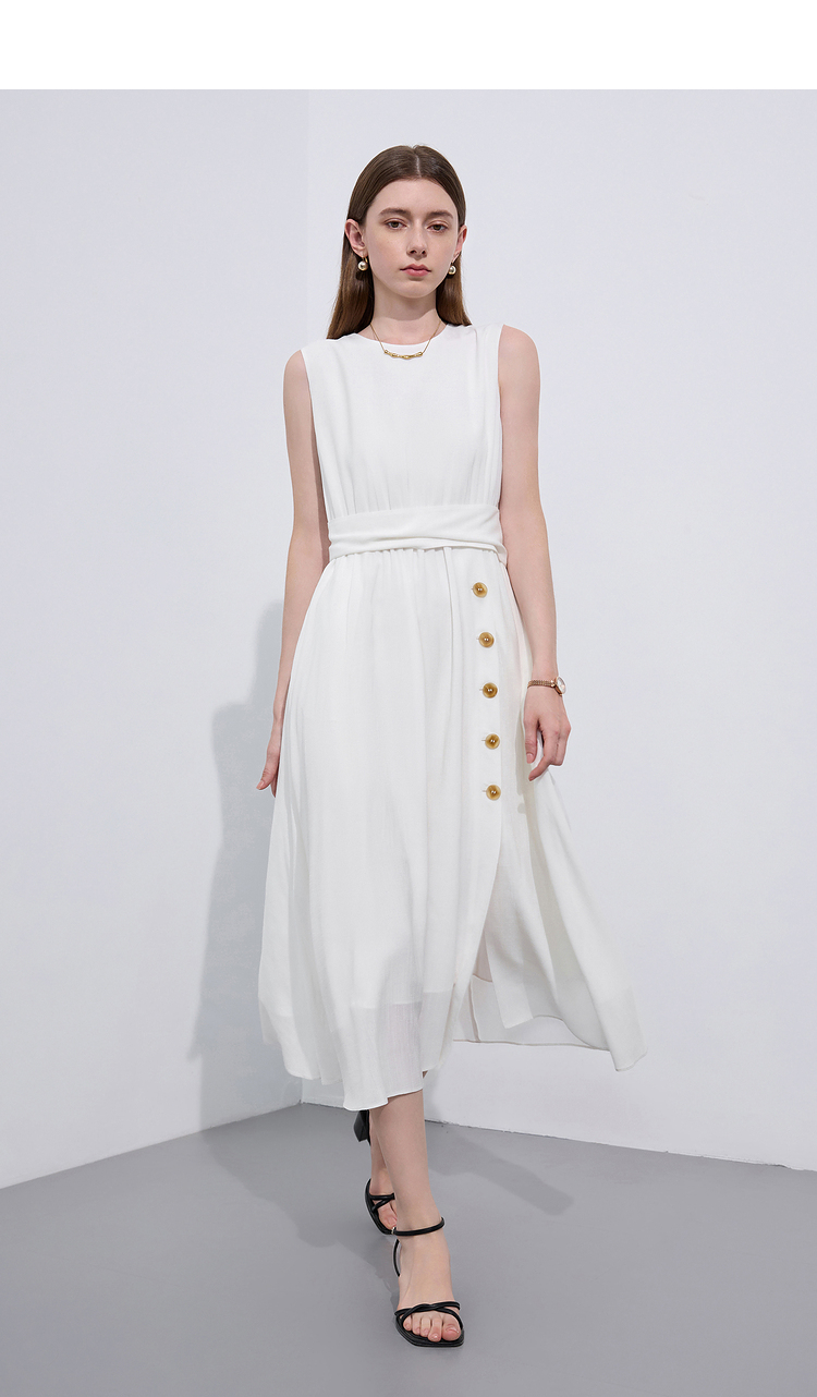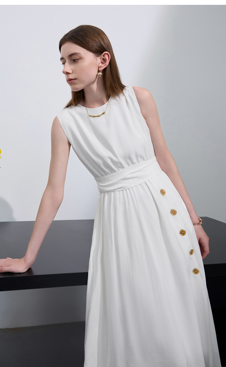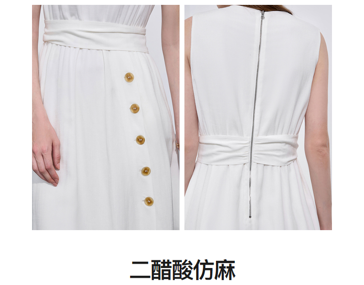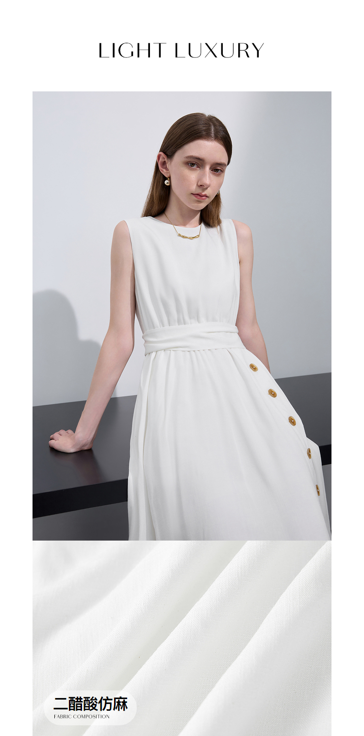 三彩2024夏季新款二醋酸仿麻小白裙无袖收腰A字裙极简风长裙优雅S
