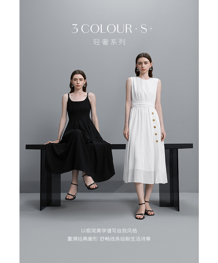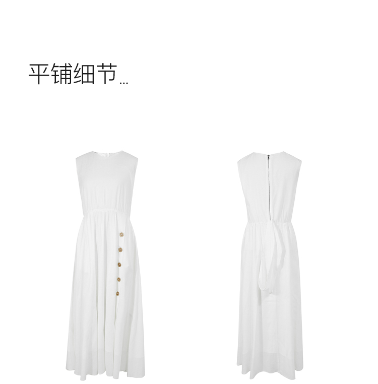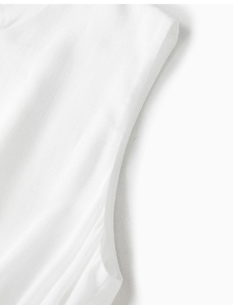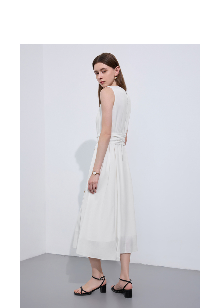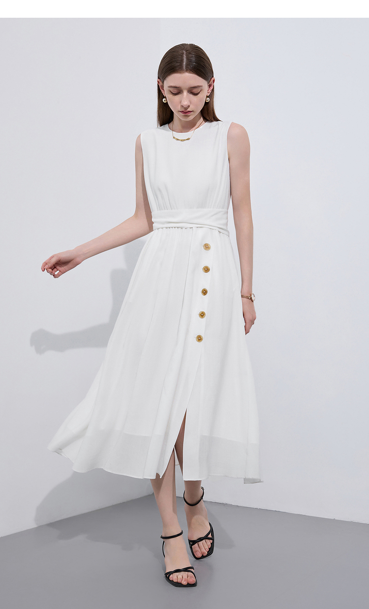 三彩2024夏季新款二醋酸仿麻小白裙无袖收腰A字裙极简风长裙优雅S