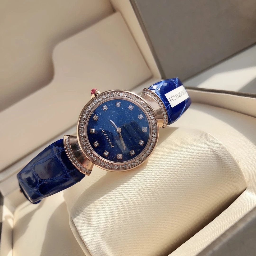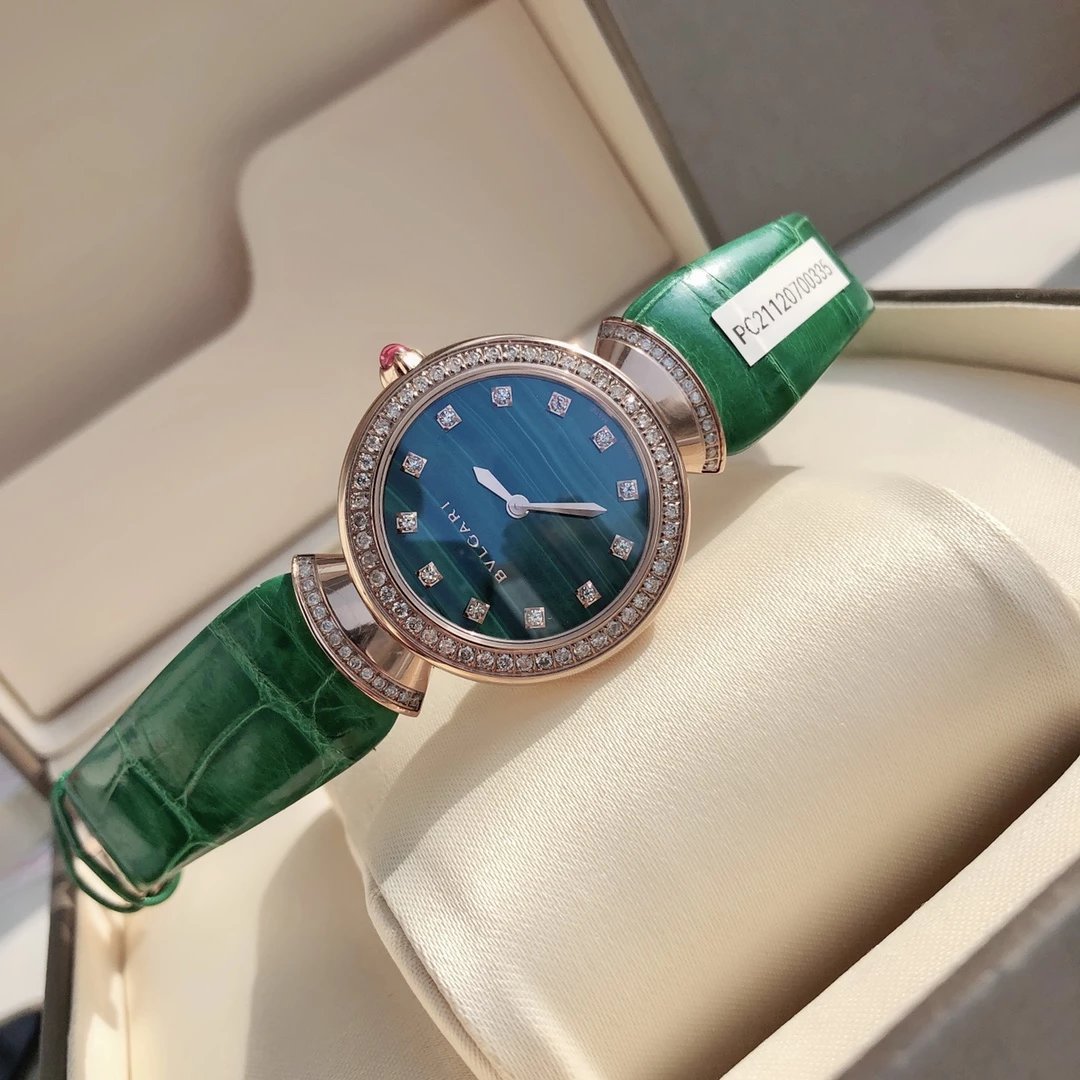 宝格丽DIVAS’DREAM系列103119女士石英镶钻腕表,DIVAS’DREAM腕表采用天然孔雀石青金石表盘与经典别致的扇形图案相融合,加上整表90粒天然真钻镶嵌,散发优雅气质和永恒之城的迷人