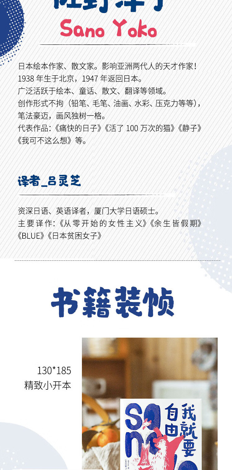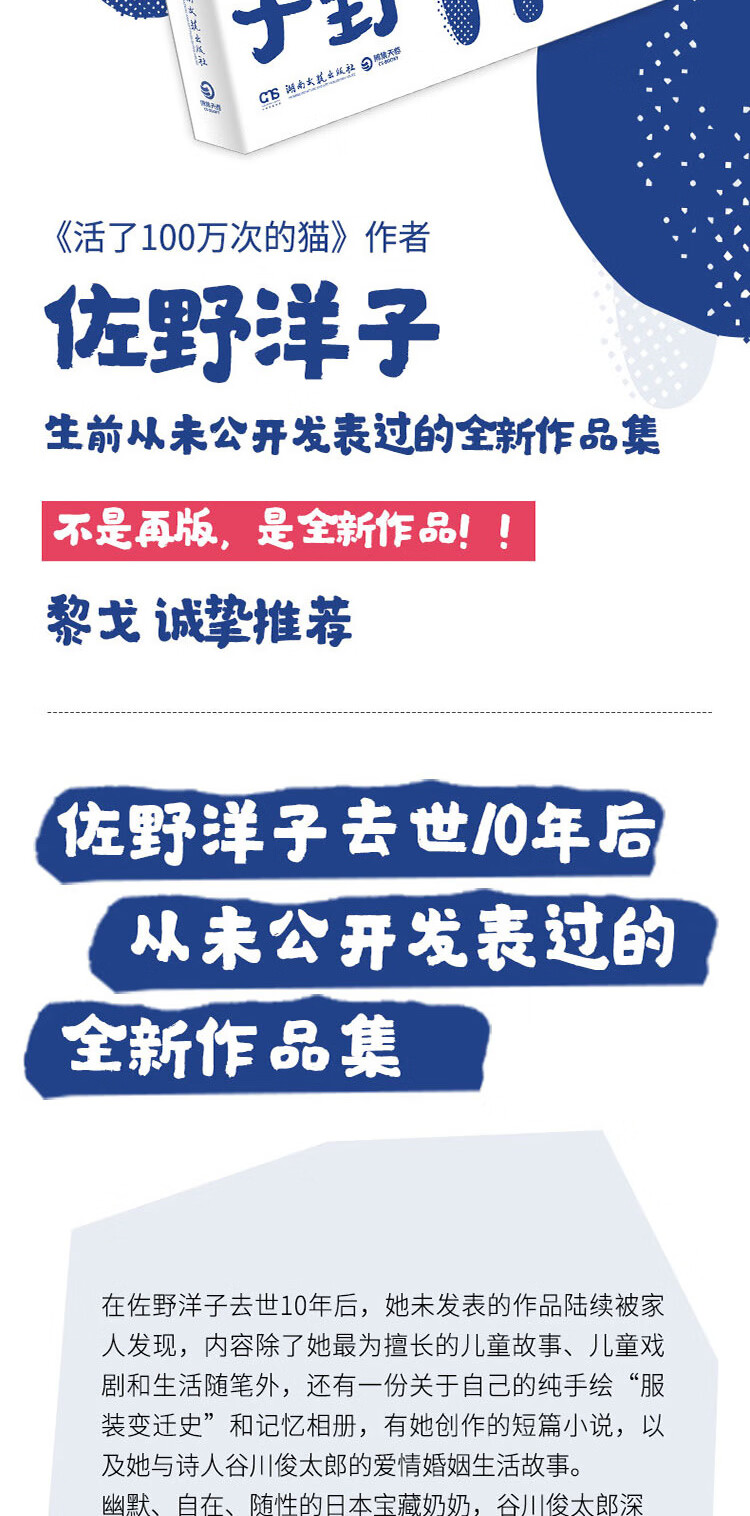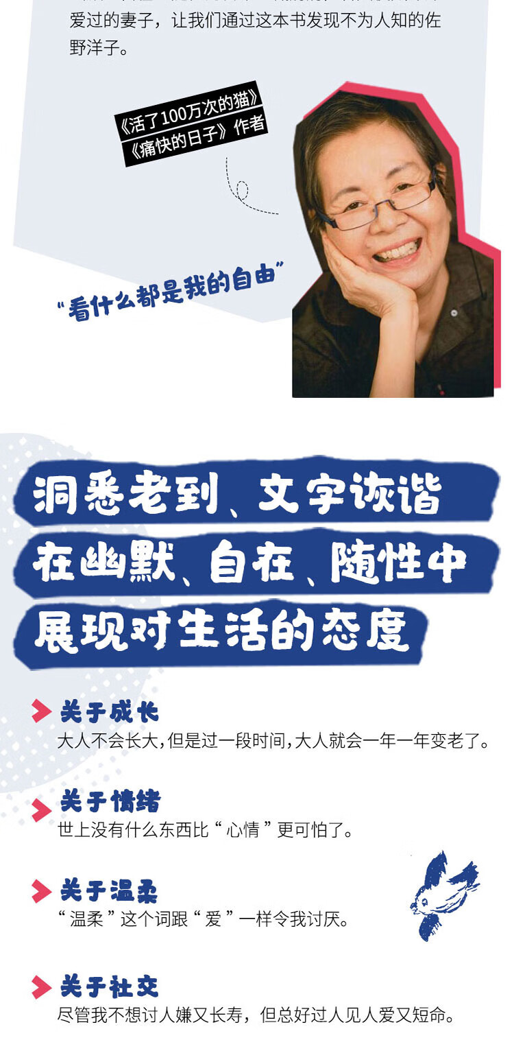 1.畅销书《活了100万次的猫》作者佐野洋子生前从未公开发表过的作品合集,发现不为人知的佐野洋子。 不是再版,是全新作品!!这些作品是作者去世后,陆续被发现的,很多100%未公开的作品,洋子不为人知的杰作集于一册! ! 2.“看什么都是我的自由!”佐野洋子文字诙谐,在幽默自嘲中展现对人生的释然。包含她最为擅长的儿童故事、儿童戏剧和生活随笔。 3.私人生活大公开:与诗人谷川俊太郎的爱情婚姻生活。 4.超有意思的关于自己的手绘服装变迁史和记忆相册。 5.作家黎戈诚意推荐——她学美术出身,她是绘本作者,她也写散文,这些工种都定义不了她心灵的无疆,说到底,表达形式不过是各种生命流质的容器。她从未失却那儿童式的通灵妖邪,她一言道破生命的荒芜与破败,这时你才发现:面前坐着洞悉一切的老奶奶,巫气十足。