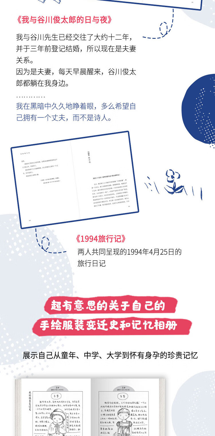 佐野洋子的全新作品集,在这本书中,几乎所有作品都是她生前从未公开发表过的。 在佐野洋子去世10年后,她未发表的作品陆续被家人发现,内容除了她最为擅长的儿童故事、儿童戏剧和生活随笔外,还有一份关于自己的纯手绘的“服装变迁史”和记忆相册,有她创作的剧本,以及她与诗人谷川俊太郎的爱情婚姻生活故事。 幽默、自在、随性的日本宝藏奶奶,谷川俊太郎深爱过的妻子,让我们通过这本书发现不为人知的佐野洋子。