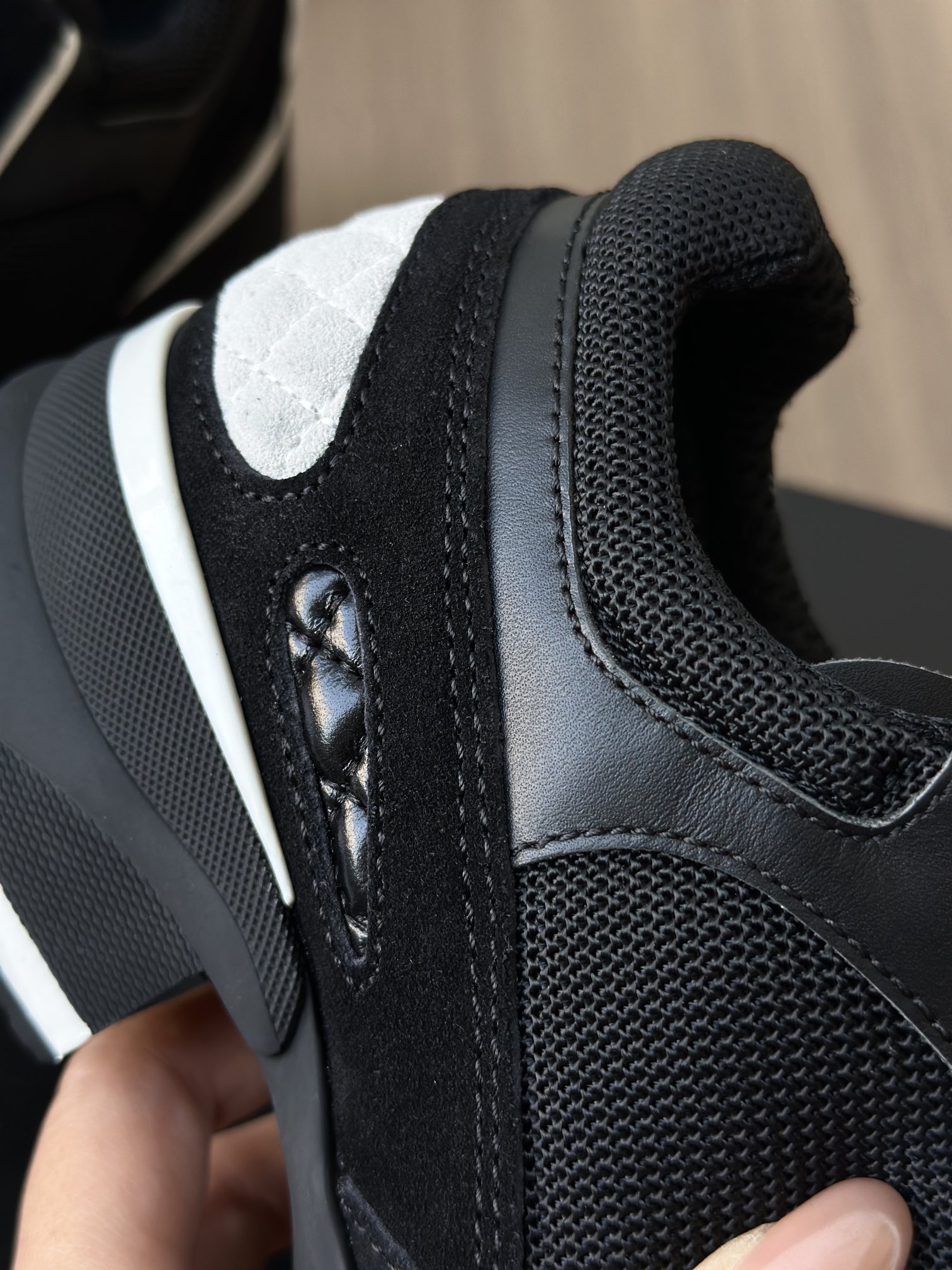 亮光小牛皮+小牛皮+牛绒+进口涤纶网布鞋面 柔软舒适 层次感无敌!! 鞋身走线细腻 针距一致 一边靠皮革撑住质感显档次,一边靠网面透气不闷汗,实用和颜值都占了!