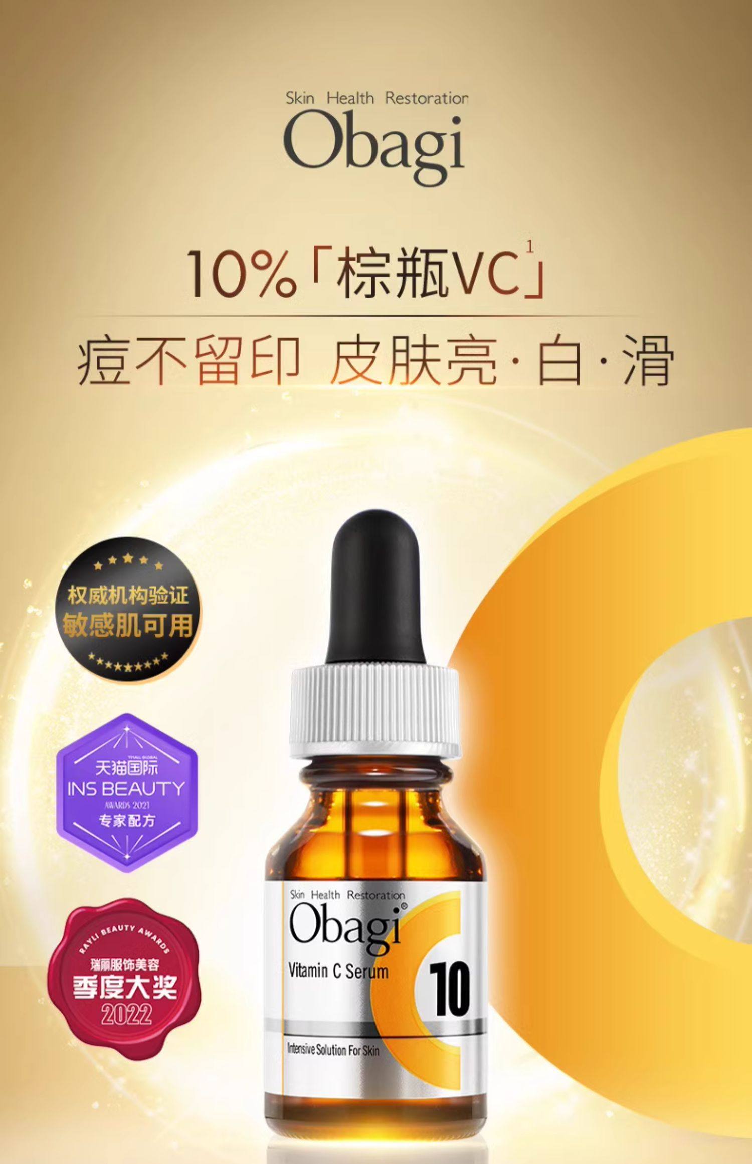 【跨境进口】OBAGI 左旋vc精华液温和焕亮淡印C10敏感肌12ml