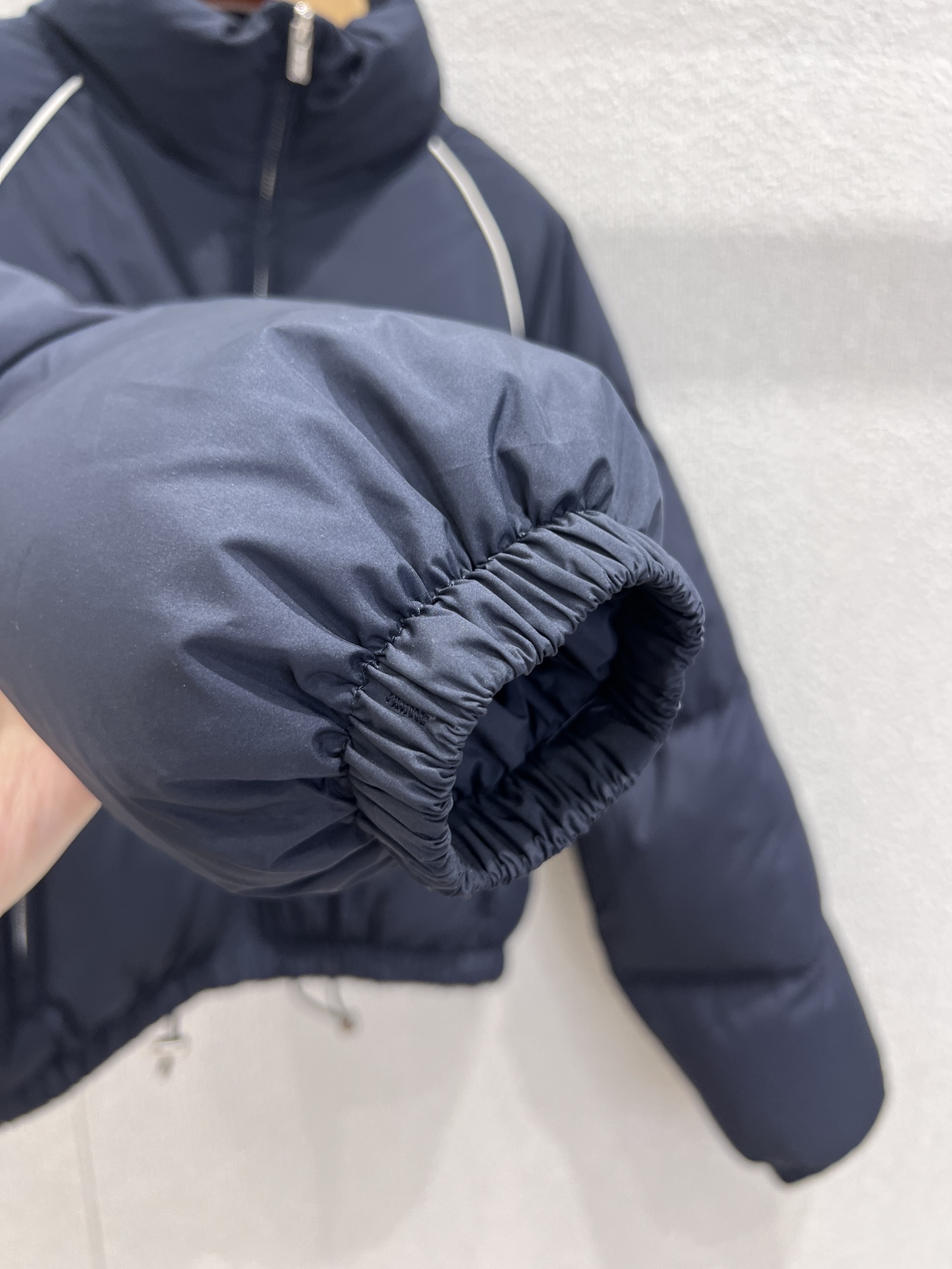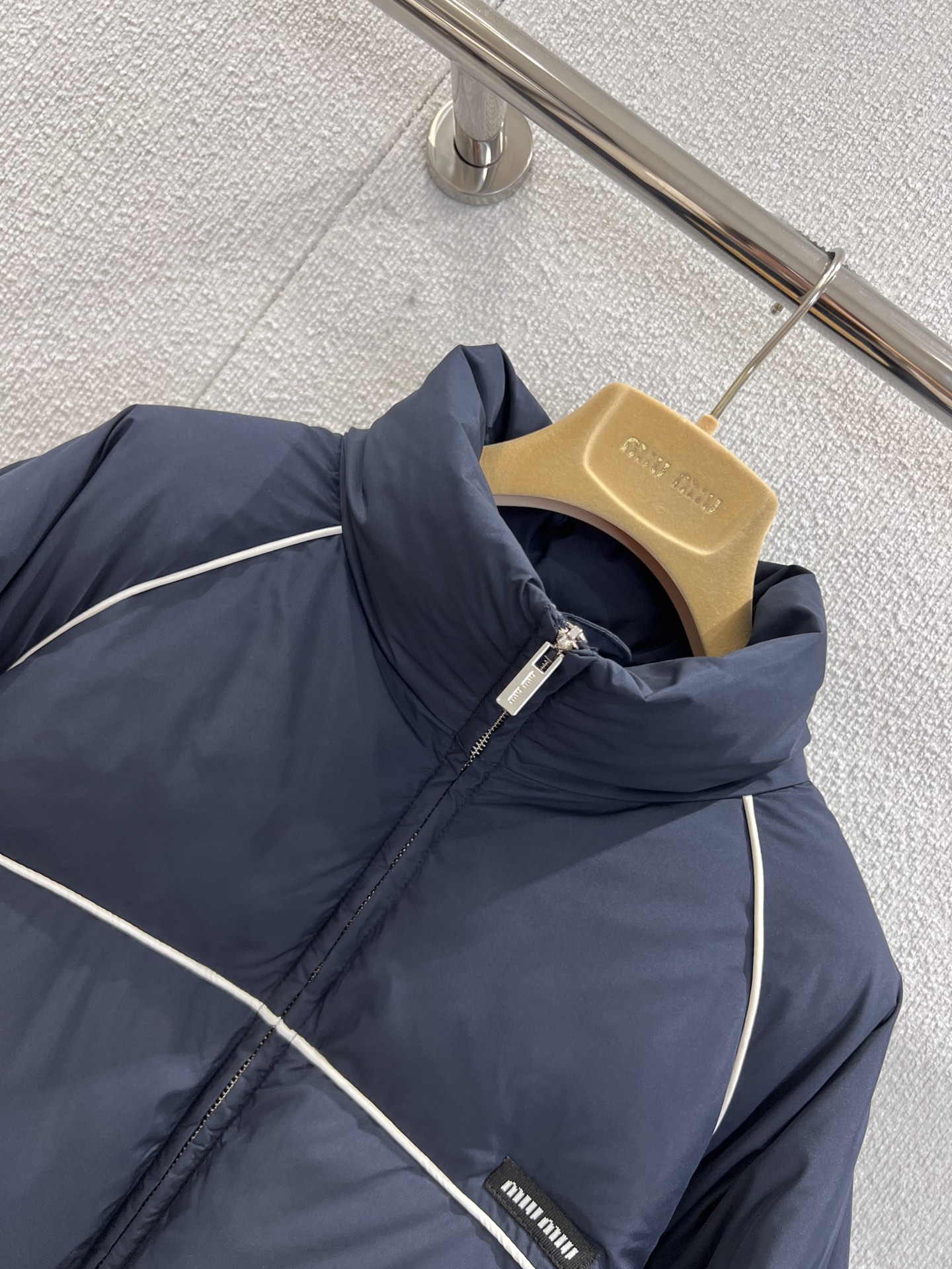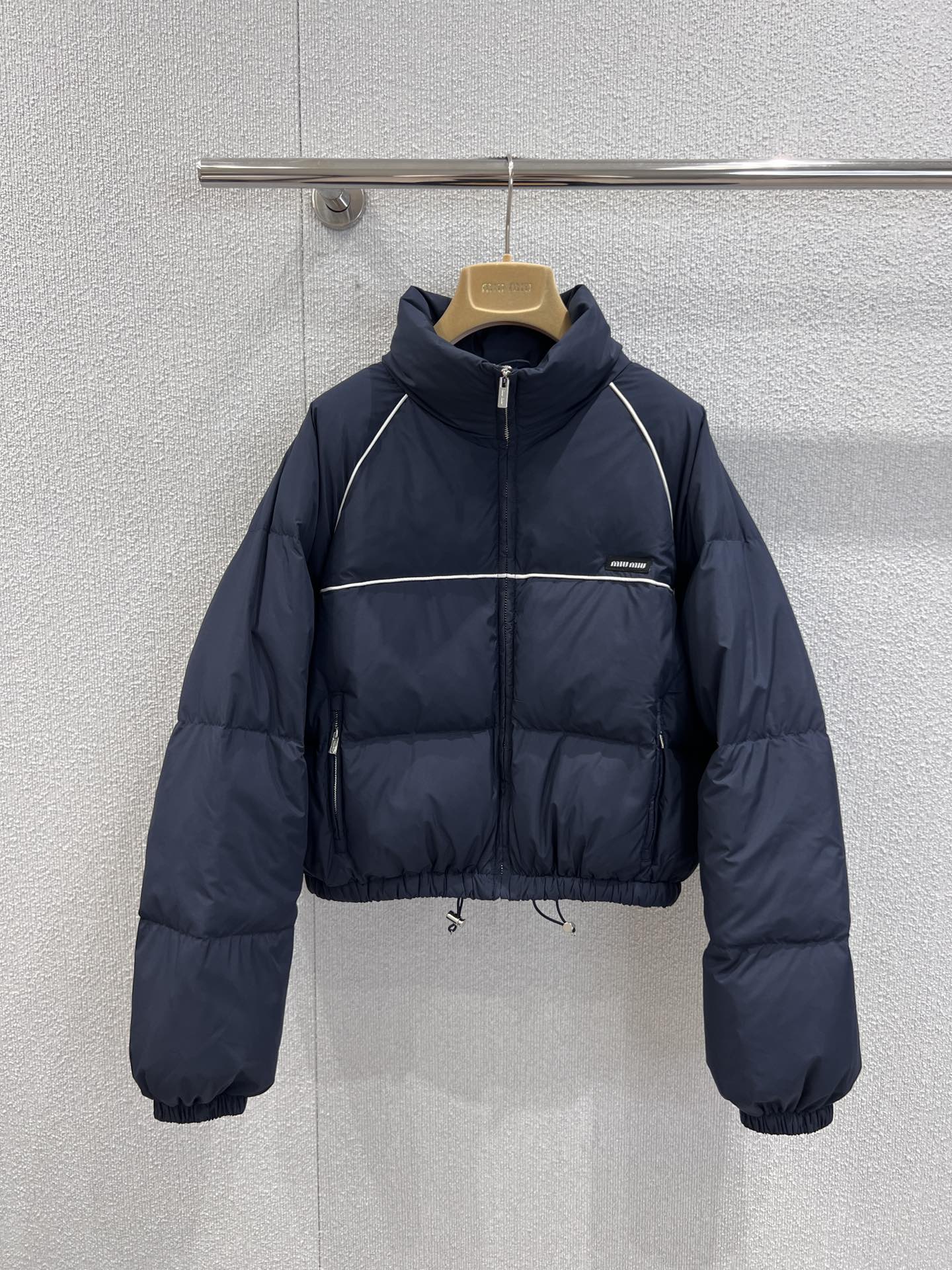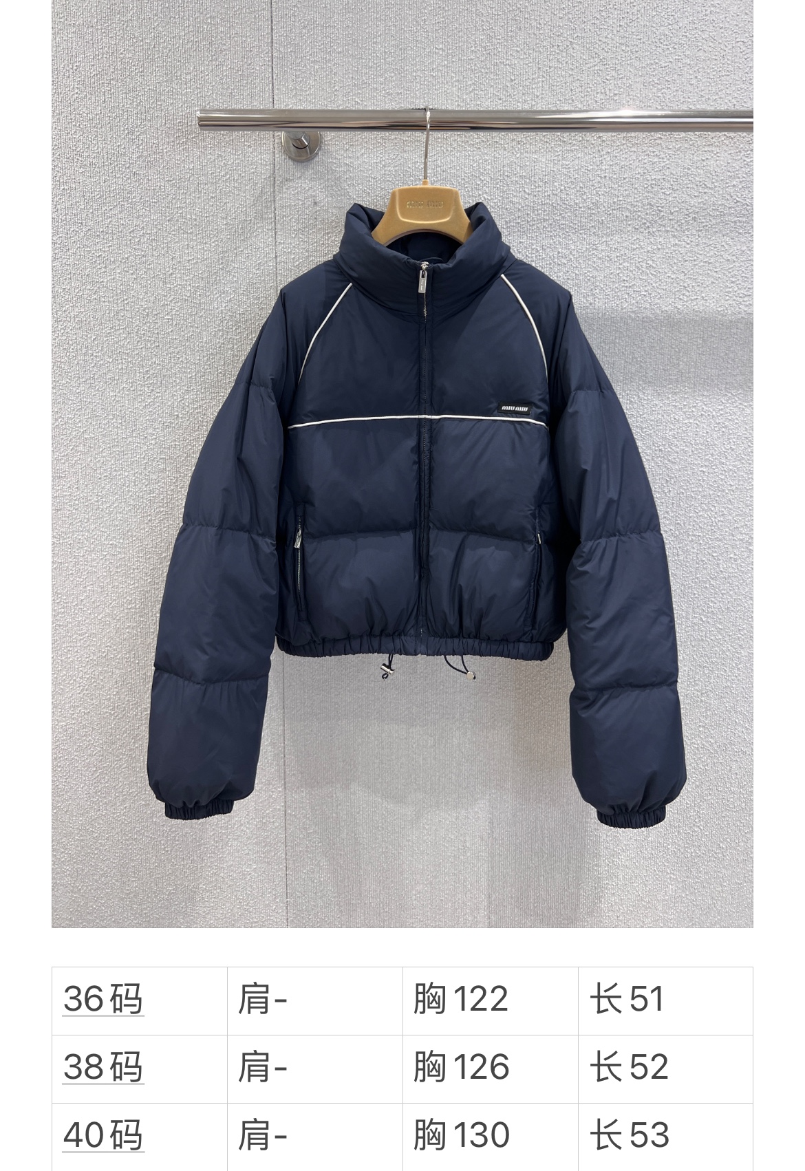 MiuMi* 25Fw早秋新款 短款鹅绒羽绒服丨⚠独家yb开发!高版出品!深蓝色主调+白色线条,简约又有运动感。高品质鹅绒填充,轻薄保暖,秋冬穿超合适!短款剪裁+收腰设计,显高显瘦,小个子友好~立领防风,袖口和下摆松紧收口,实用又时髦。日常通勤、休闲都能轻松搭配,舒适又百搭,是秋冬衣橱必备单品!