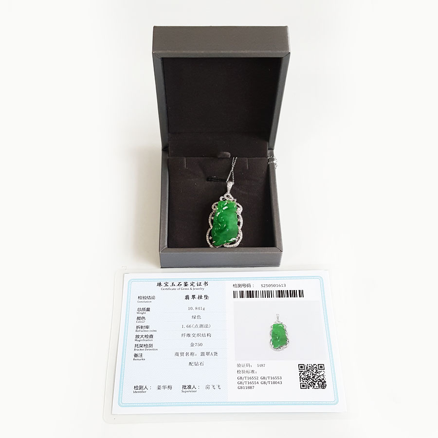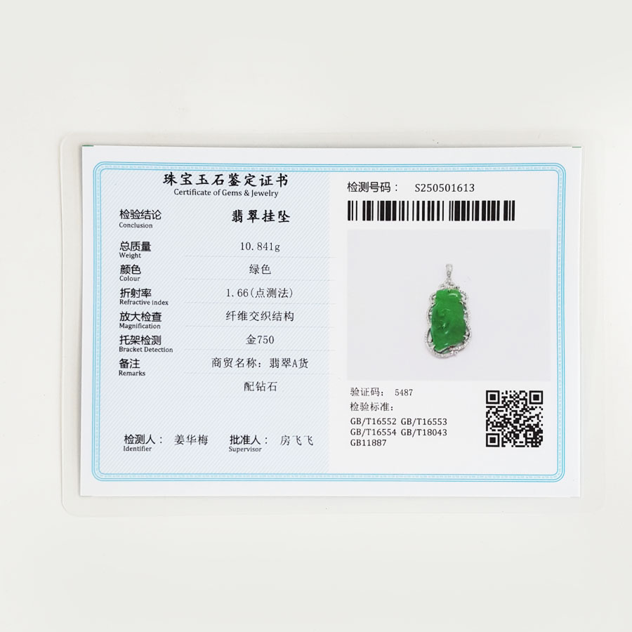 【天然正品】A货翡翠AU750收藏级白金豪镶钻镶天然细腻糯冰种满绿如意(万事如意)翡翠吊坠项链49.3*22.1*9.1MM(皆取最大值)250326NJM46