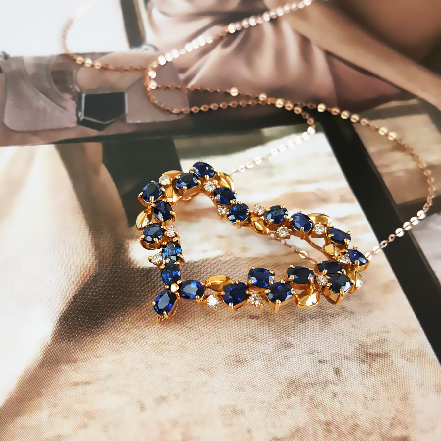名称 | AU750黄金镶钻群镶天然皇家蓝5.11克拉心型蓝宝石吊坠项链 |