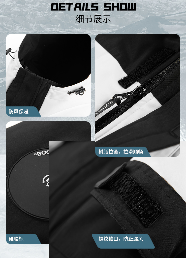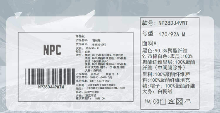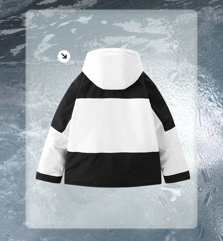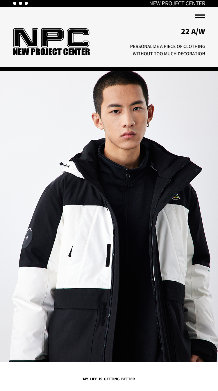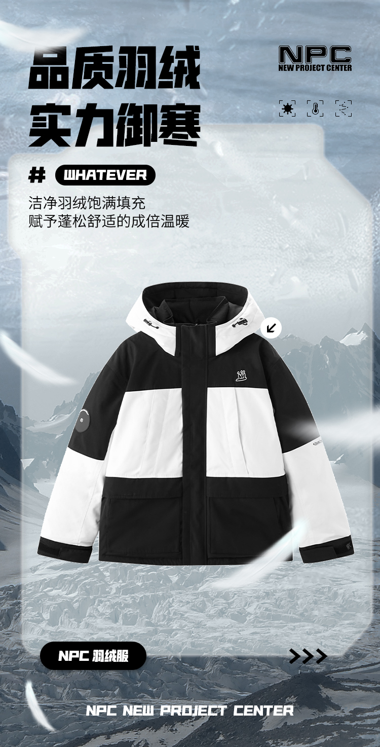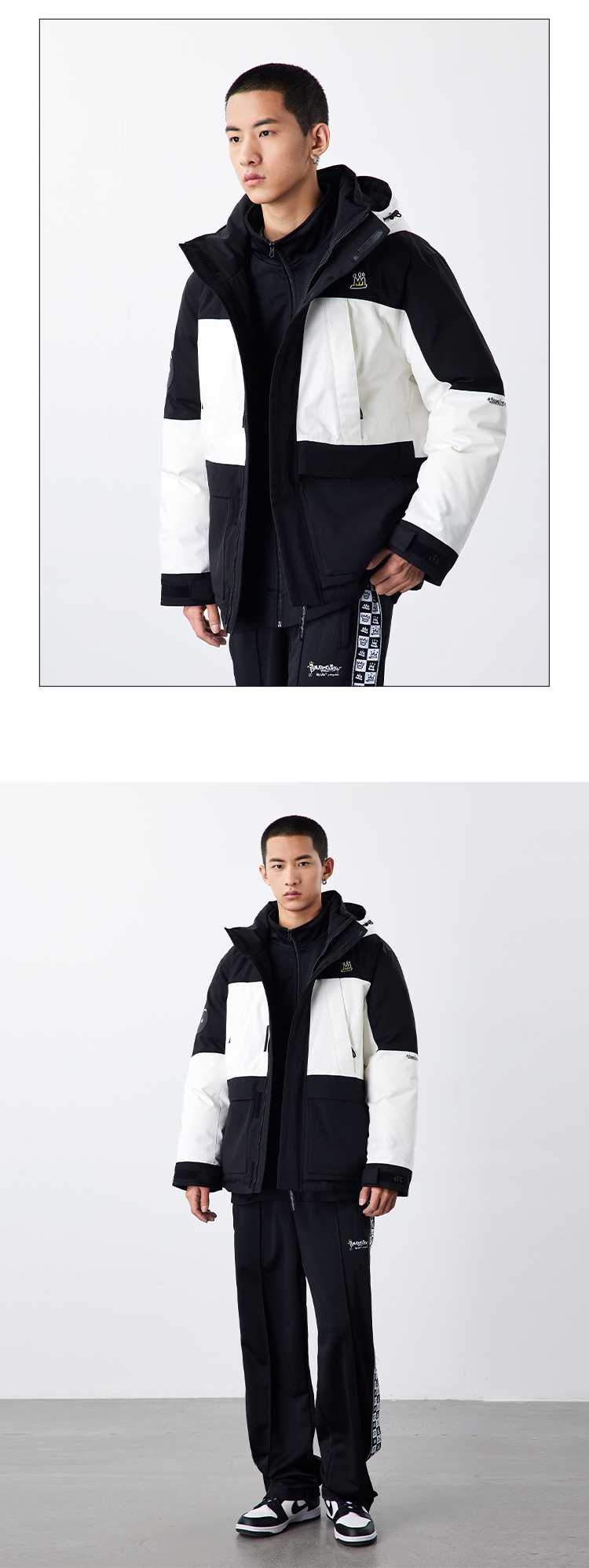 NPC潮牌左胸前小皇冠绣花黑白拼接连帽中长羽绒服NP28DJ49