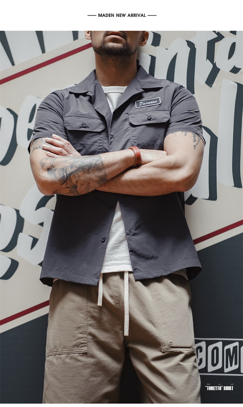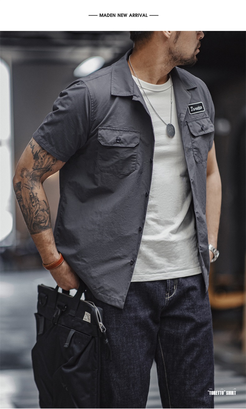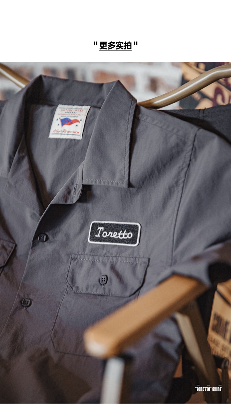 工装优选 美式复古Toretto硬汉短袖衬衫深灰色翻领薄款衬衣男夏季