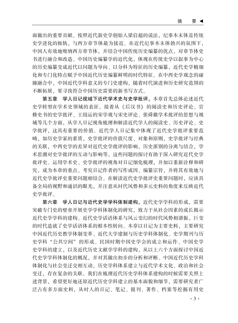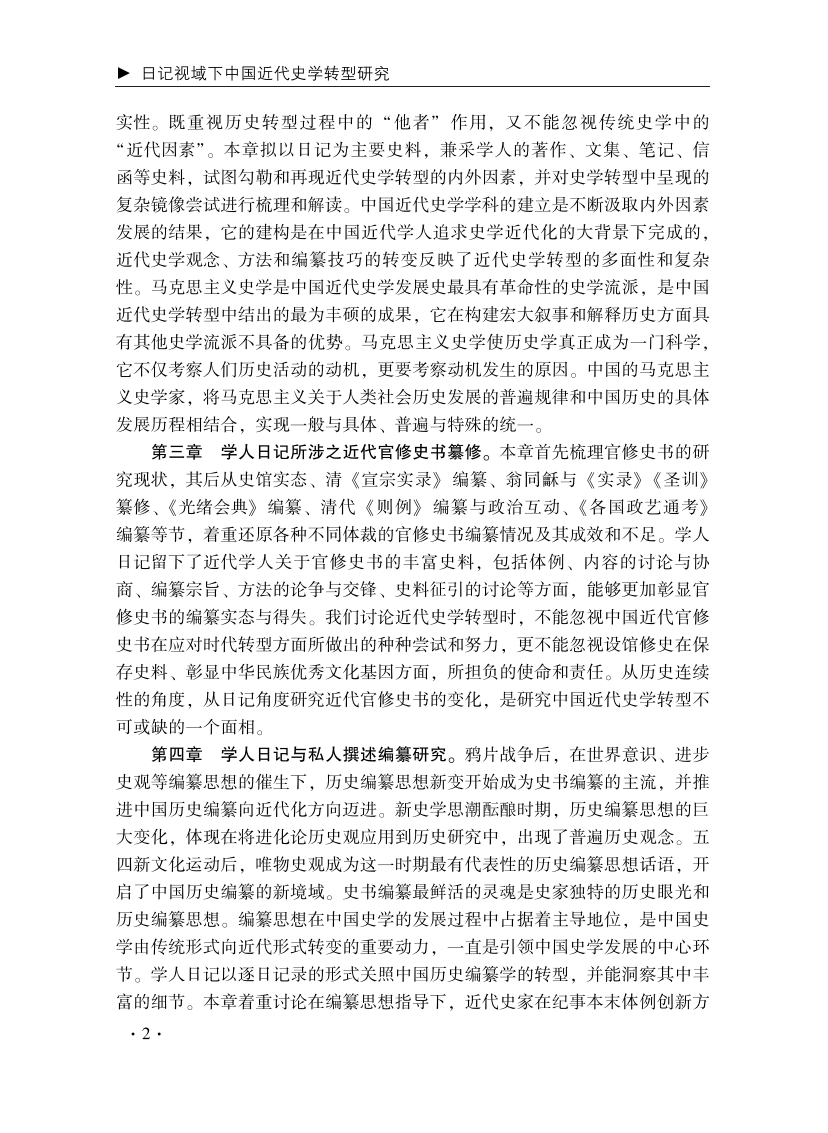 绪论一、研究现状梳理与分析二、研究意义、思路和研究方法三、利用学人日记需要注意其局限性第一章学人日记所见近代史学研究第一节近代史学学术史的细致演绎第二节学人日记与近代史学批评多重阐释第三节学人日记与近代官修史书结语第二章中国近代史学转型的;历史影像第一节;本土元素:近代史学转型的内在动力第二节;西方和日本元素:中国史学近代转型的推动力第三节中国历史编纂的近代转型第四节民国时期中国马克思主义史学演进与成就第三章学人日记所涉之近代官修史书纂修第一节近代日记所见的史馆态势第二节学人日记所见的《光绪会典》研究第三节翰林院编纂《各国政艺通考》考论第四章学人日记与私人撰述编纂研究第一节日记所见中国近代历史编纂转型与格局第二节近代纪事本末体编纂风格的转型第三节中国近代史书编纂的转型与民族风格的形成第五章学人日记视域下近代学术史与史学批评第一节学术史:近代史学转型之表征第二节近代日记所见学人对《后汉书》的阅读与评论第三节近代学人日记所见史馆修史的史学批评第四节王闿运的宋学观与宋史评论第五节张舜徽学术批评的思想与视域第六章学人日记与近代史学学科体制建构第一节清末民初中国近代历史教学体制变革第二节五四以后近代大学建制与历史学科体制化第三节史学期刊与历史学科;公共空间的形成第四节中国史学会的成立与运作第五节学人日记所见中国史学史学科的建立第六节日记所见张舜徽的历史文献学学科体制建构第七章近代学人日记所见的学术流派第一节湖湘学派与公羊学派的异趣与冲突第二节学派纷争与桐城派式微第三节史语所内外的矛盾与冲突第四节民国不同学派的对立与调适结语第八章学人日记对近代史学研究的价值和意义第一节近代史学转型的;历史影像第二节史学流派的精微记录第三节学人日记与学术史第四节学术价值和局限分析参考文献