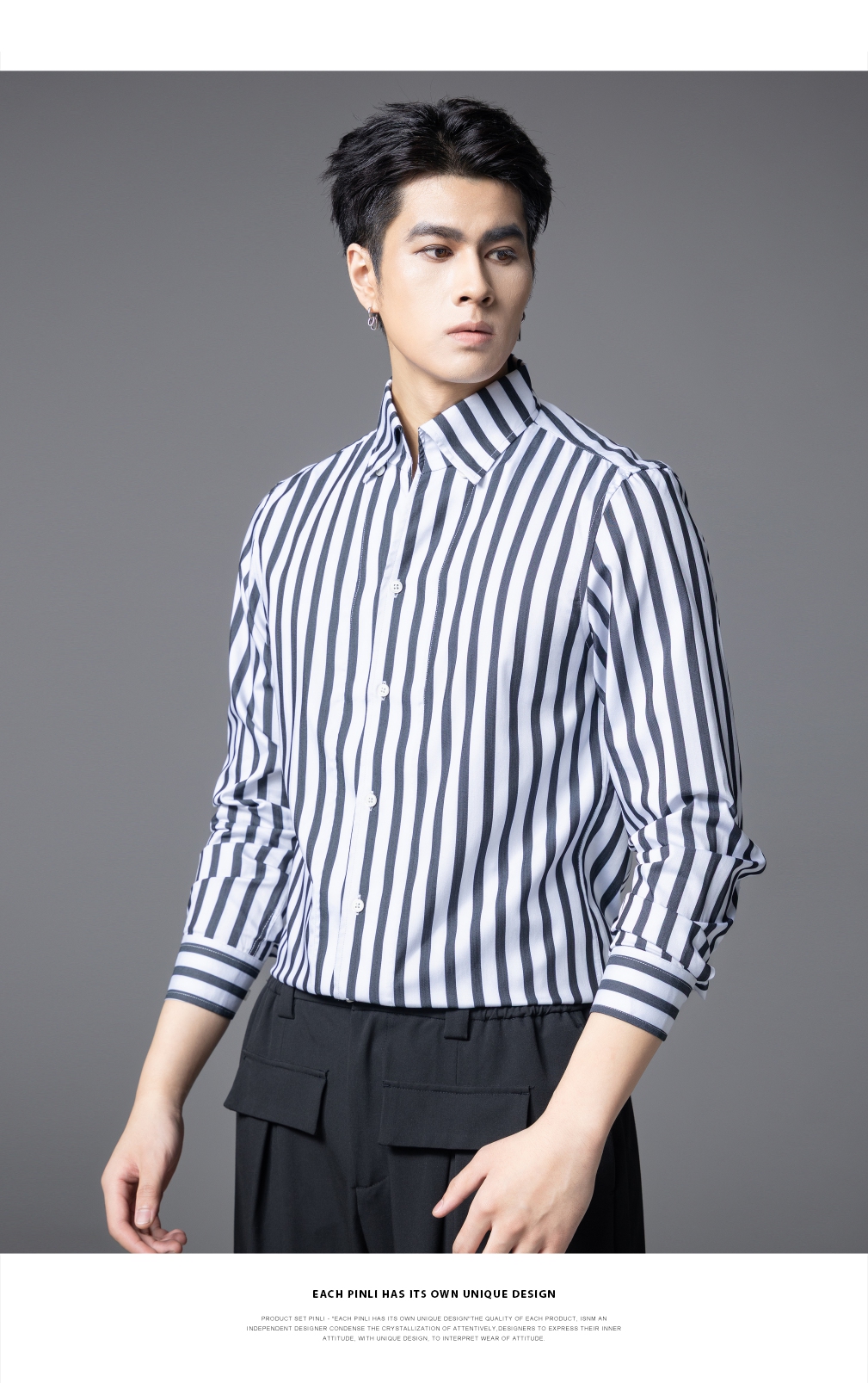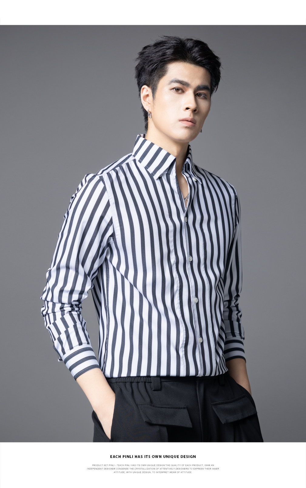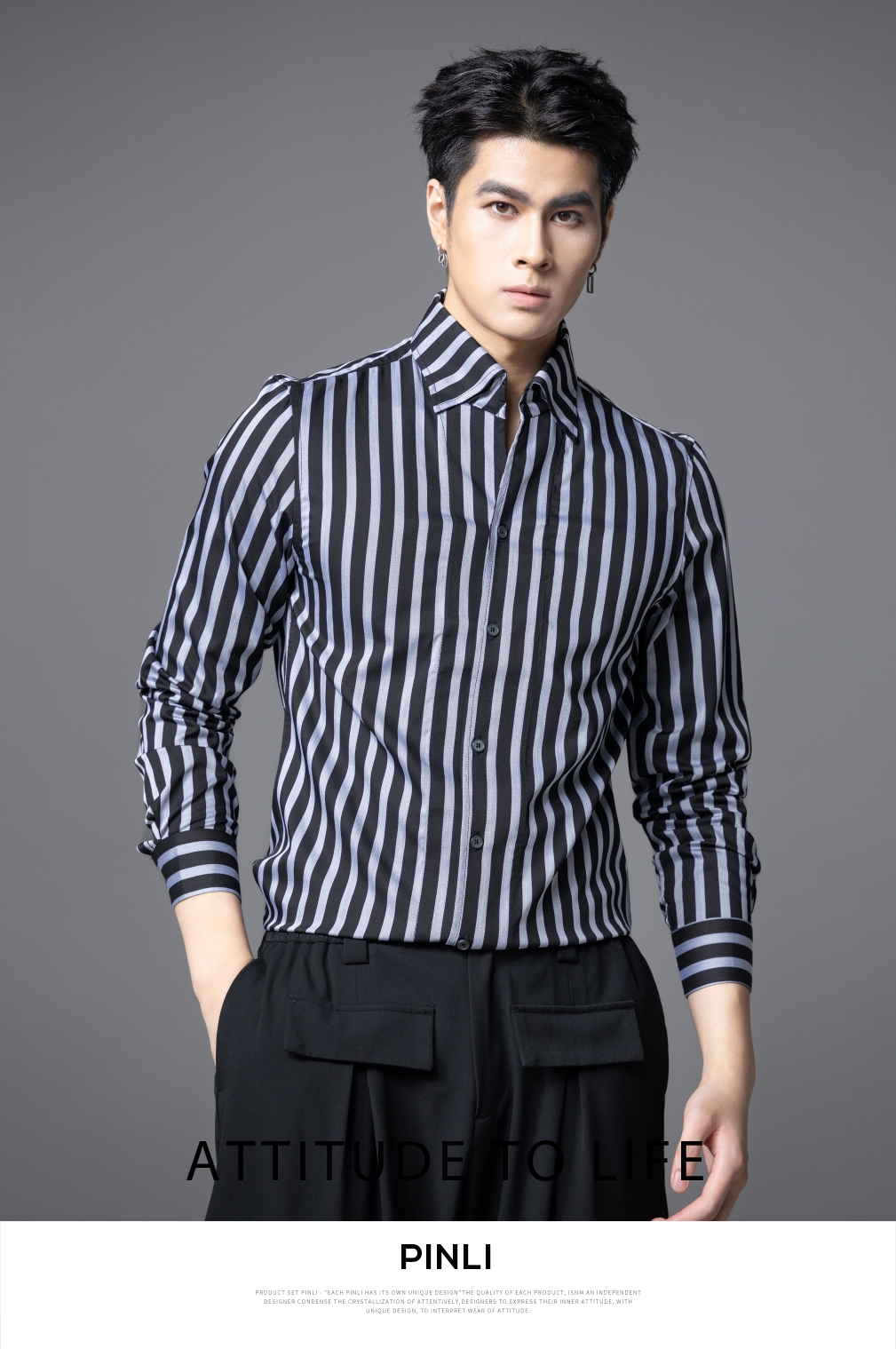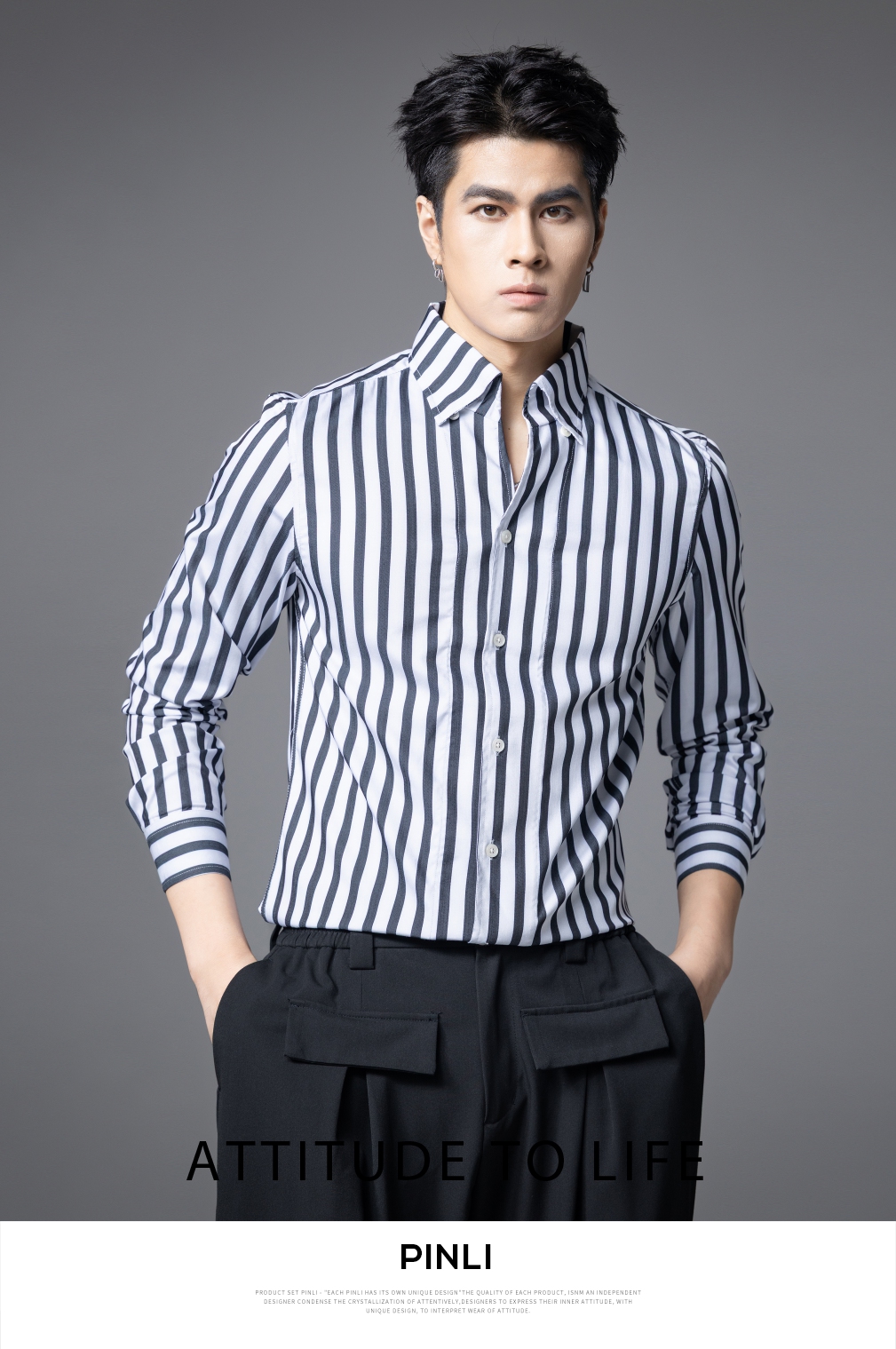 PINLI品立2025秋季新款修身尖领条纹长袖衬衫男商务休闲打底衬衣GD253113059