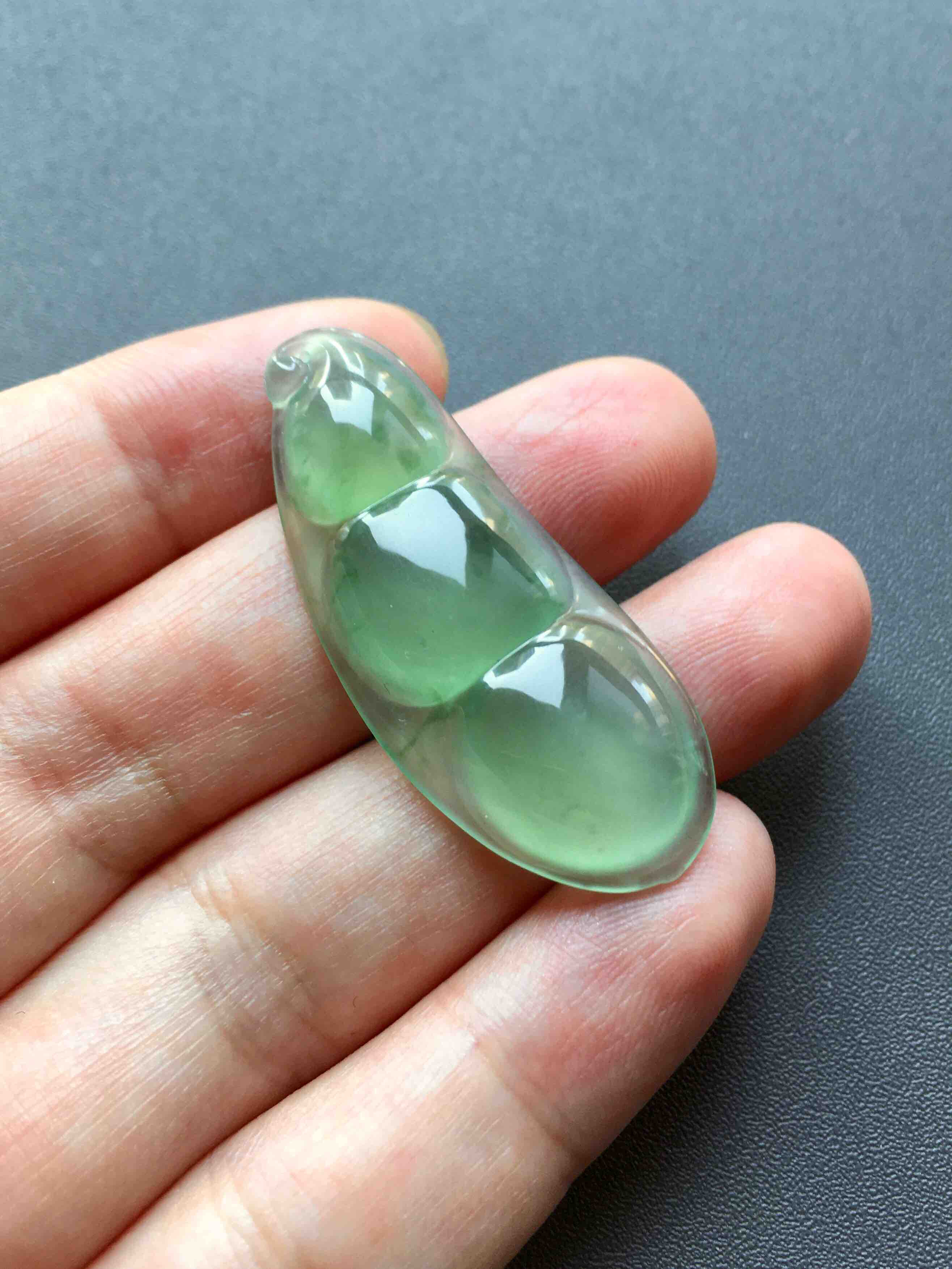 高冰种晴水飘花翡翠福豆,美爆了,小伙伴要求的,要平安寓意,种水要好,个头要大,要超高性价比哦,禄来真有,这件高冰种晴水飘花翡翠大福豆,43×17.7×5.9mm,超大,种水晶莹剔透,荧光四射,三颗豆粒代表连中三元,四季豆寓意四季平安,满满都是福报,高性价比推荐