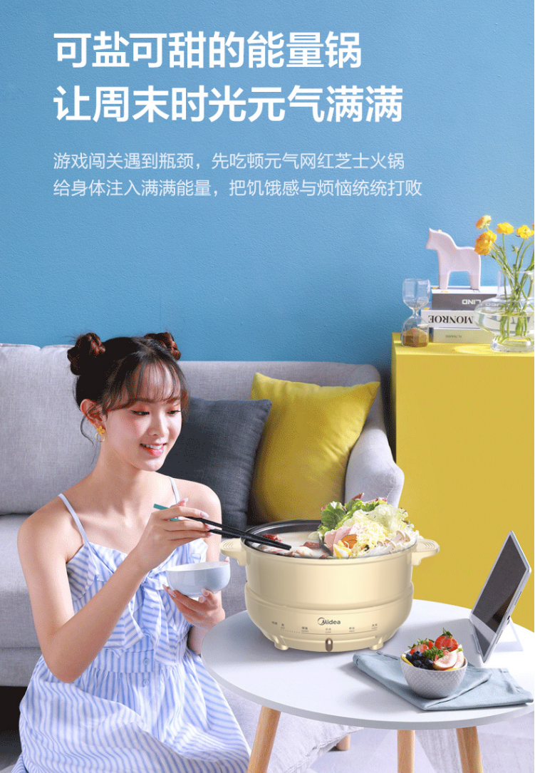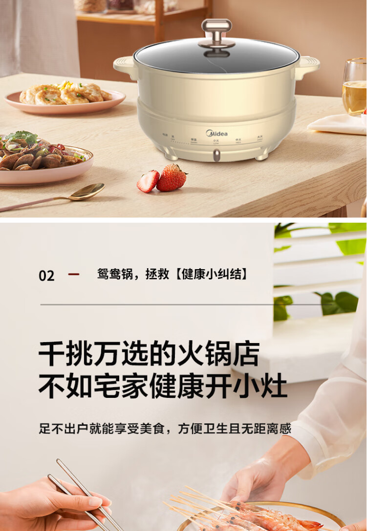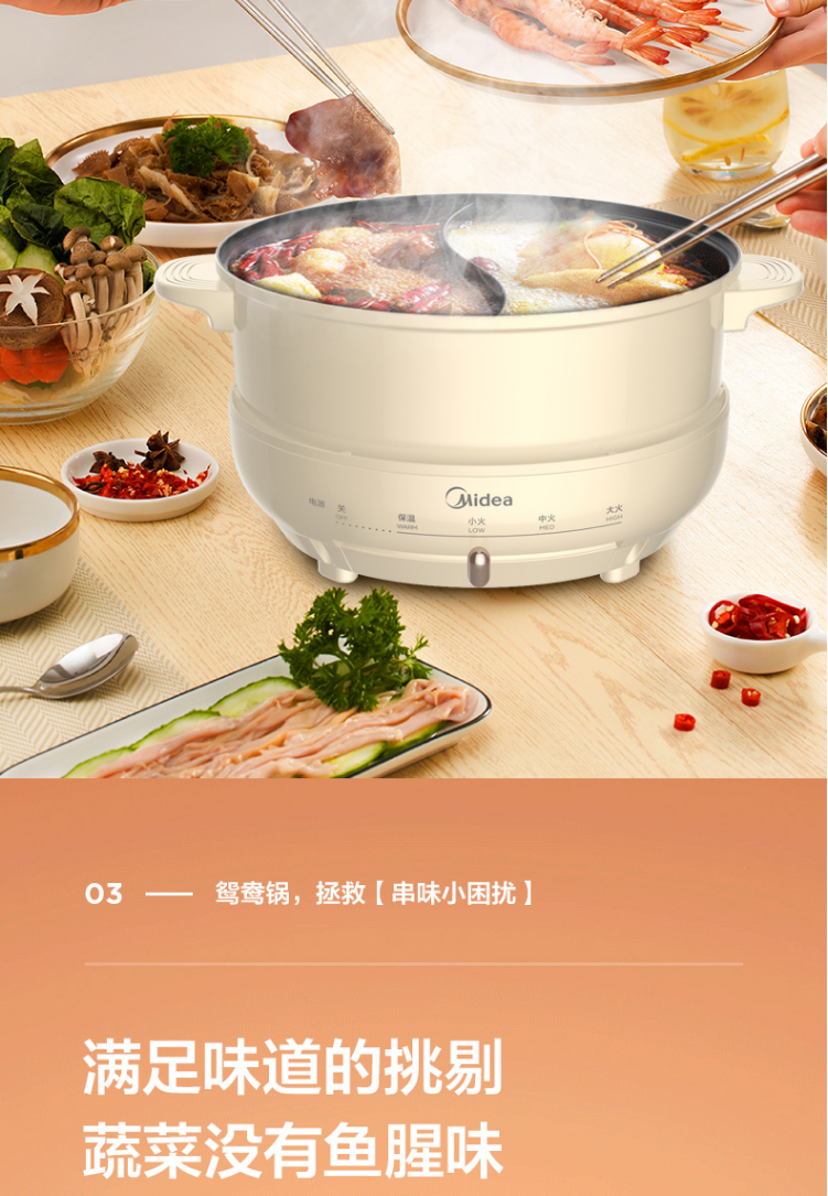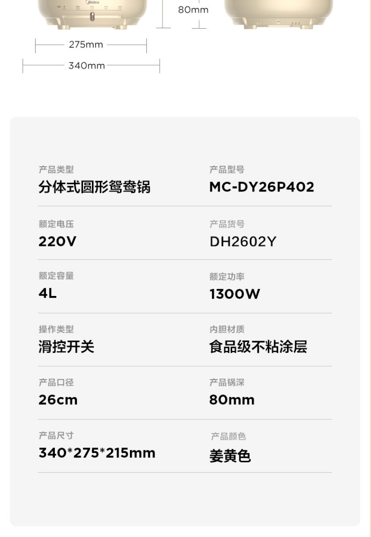 美的电火锅鸳鸯锅电热锅保温分离式家用4L不粘锅DH2602Y联保可换锅MC-DY26P402 浅黄色