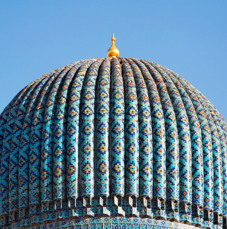 在撒马尔罕众多的建筑中,古尔-艾米尔无疑是最为引人注目的。古尔-艾米尔位于撒马尔罕市区内,建于15世纪。造型壮观,色彩鲜艳,有球锥形大圆顶,具有浓厚的东方建筑特色,是世界著名的中亚建筑瑰宝,大圆顶有64道圆形楞组成,象征穆罕默德在世64年。始建于1403年。古尔-艾米尔堪称贴木尔王朝建筑的经典之作! 外形精美绝伦,里面则金碧辉煌!