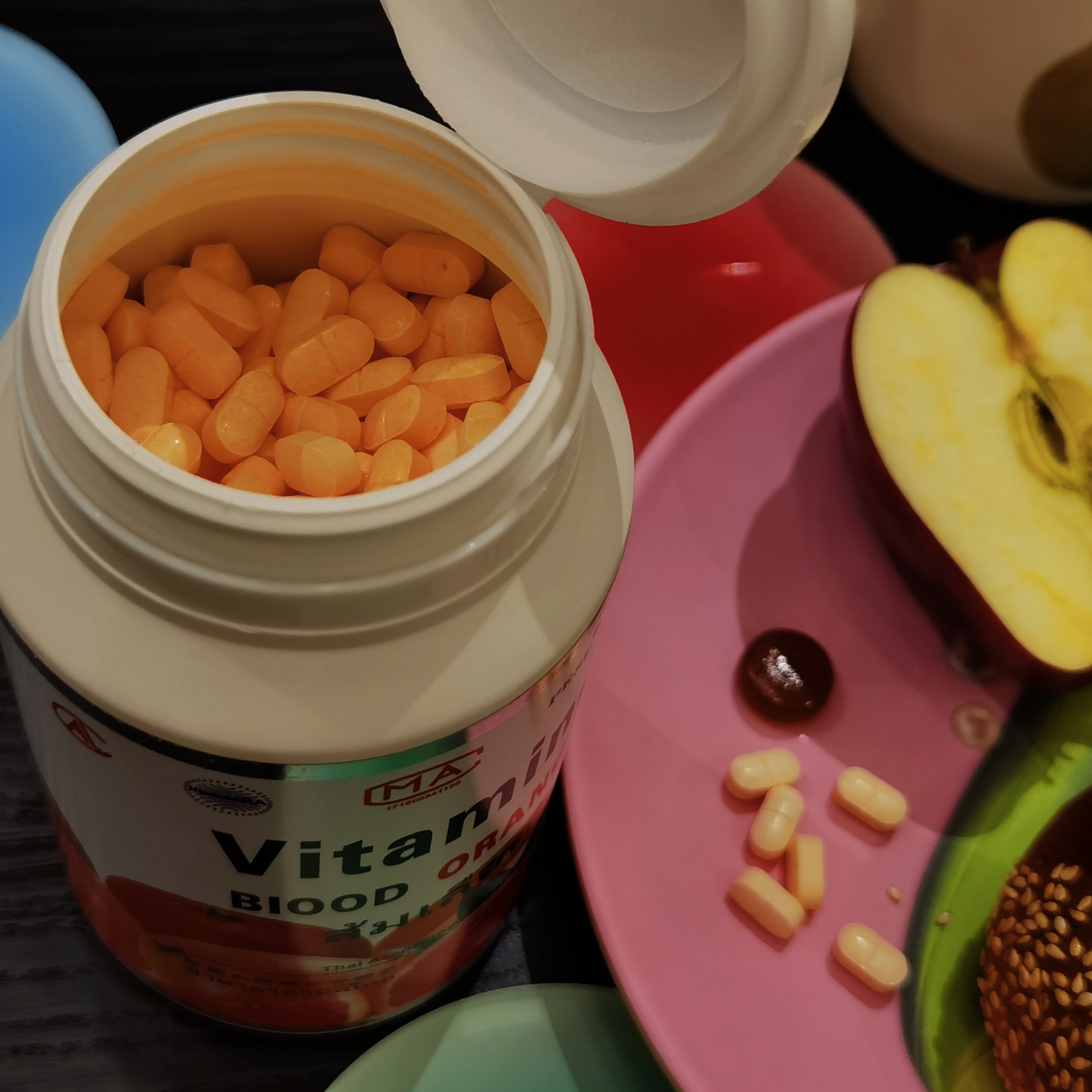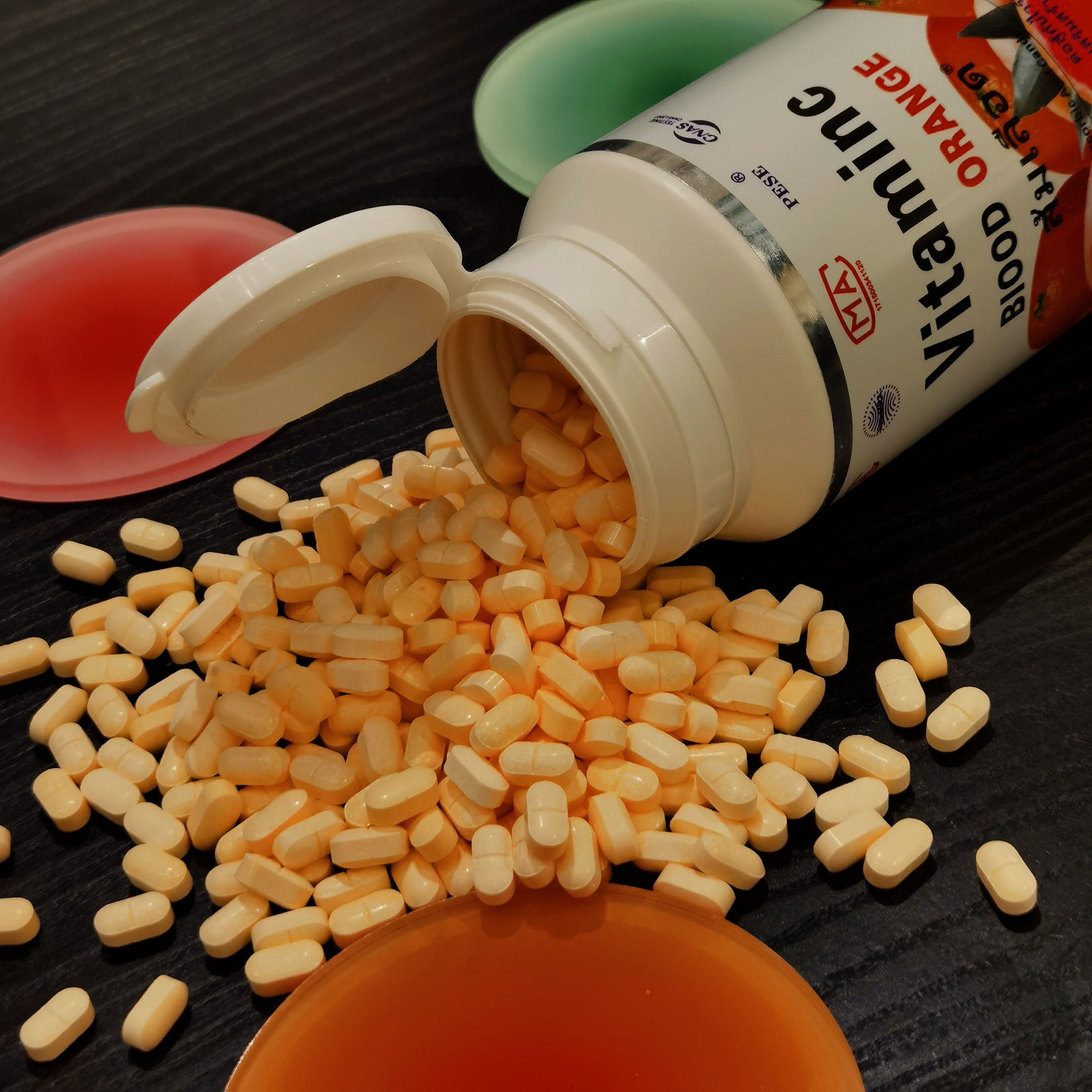 这次的维生素C片来自泰国,用的是维生素很丰富的血橙。1瓶足足有1100片那么多,超夸张,而且每片都添加了20mg的维C,需要330+颗橙子才能有这一瓶哎,真的是VC王!除了直接嚼,还可以放进温水里,融化后就变成一杯酸甜的维C汁,有着浓浓的鲜橙果味!每天坚持吃几颗,不仅提高免疫,皮肤也会变更好!