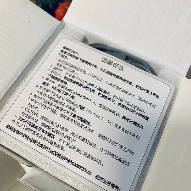 1、首用榨汁杯请先充电,榨汁杯出厂只有40%电量,建议首次充电满4小时,以提升电池的续航能力
