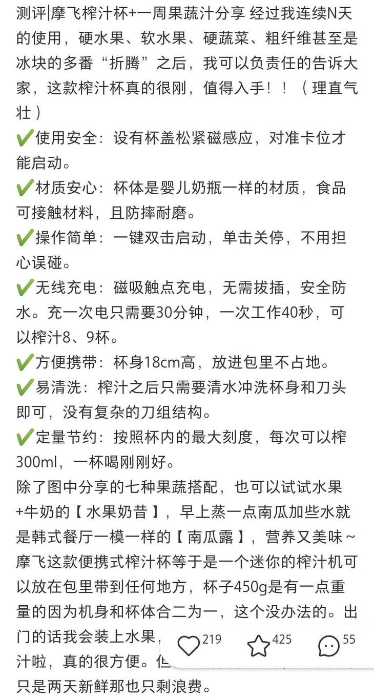 收到这个摩飞榨汁杯大概真的快一个月了吧,因为真的很火,所以品牌方都不敢让我上架,怕我一上他们自己日常供货不足,我,有那么可怕的嘛?
