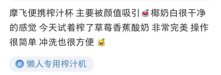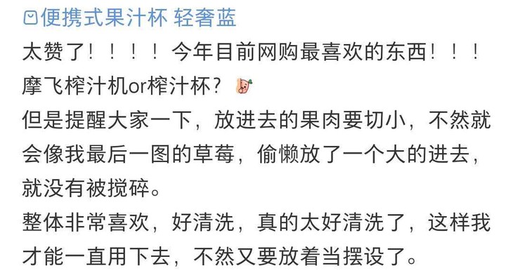 比起家用榨汁机,这款摩飞杯除了方便携带出门,也在一定程度上很好的防止了果汁榨好以后的氧化,新鲜榨一杯喝掉,需要就再榨,总能喝上新鲜口感的!