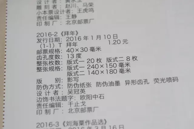 比如今年最具看点的邮票之一《刘海粟作品选》,3枚邮票用了三种不同的印刷方式,在这张详单上标注的一目了然。其他各套邮票自然也不在话下。