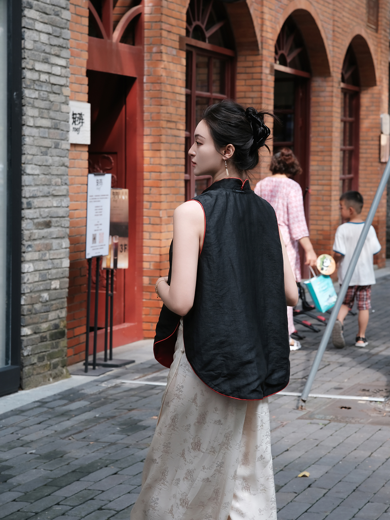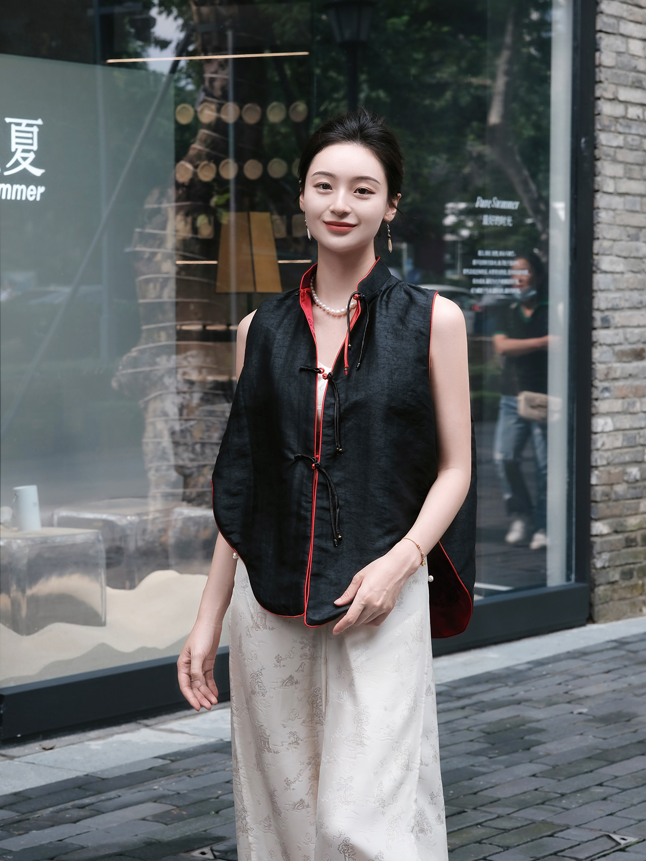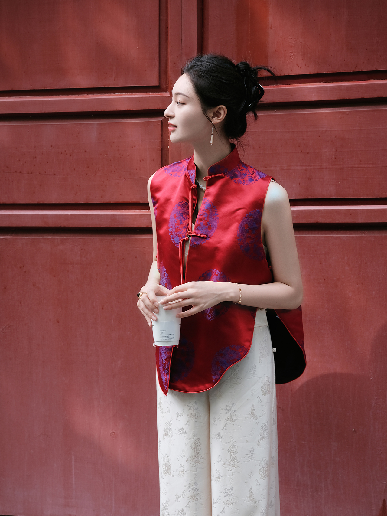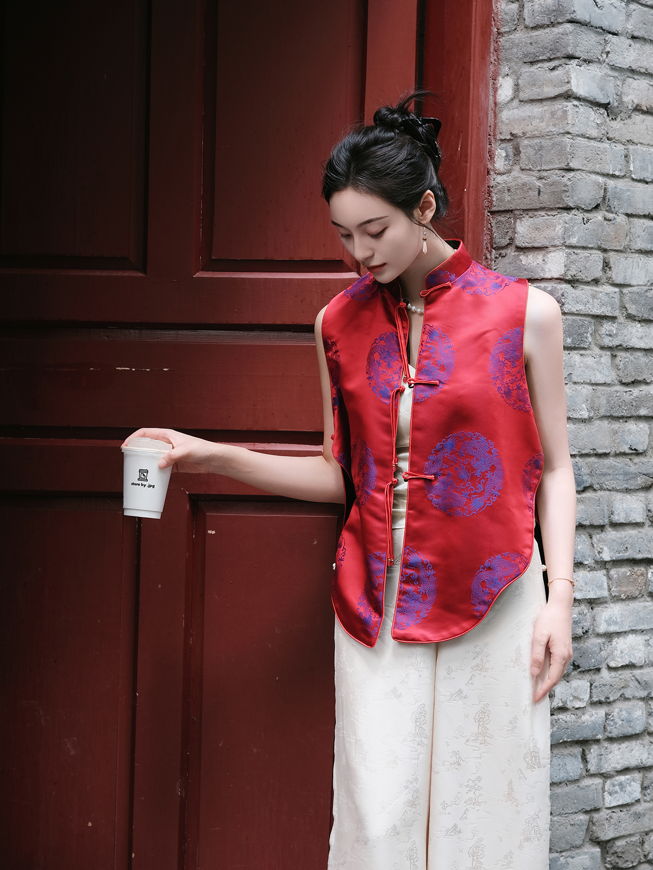 瑕疵|盛唐牡丹 |双龙团纹真丝花蕾缎马甲[特价品]