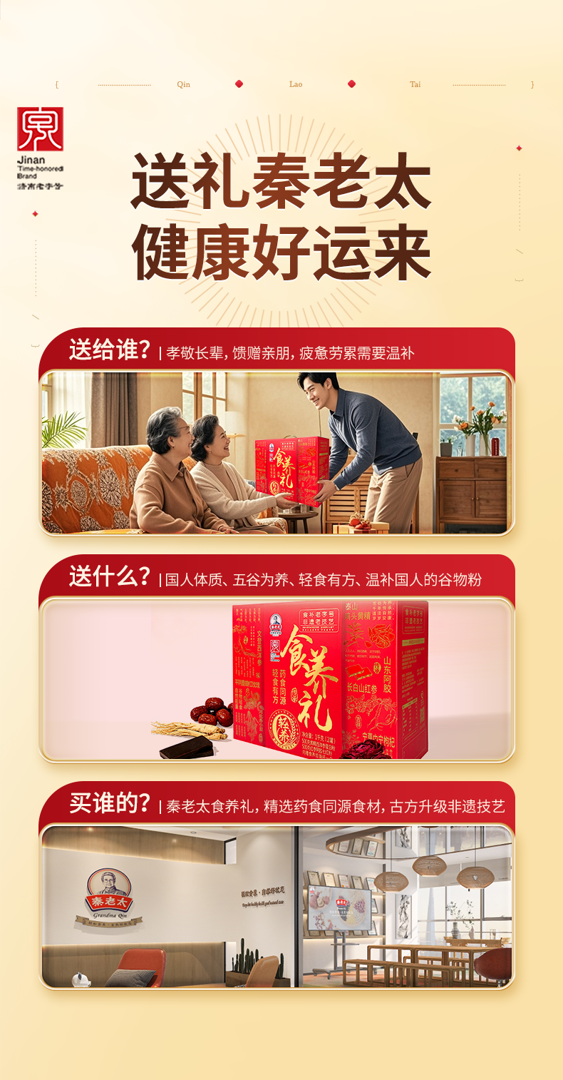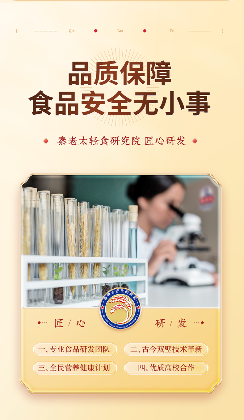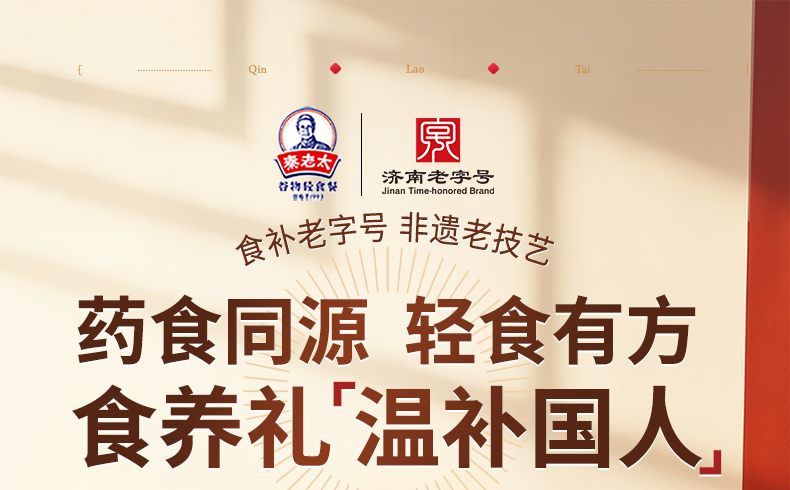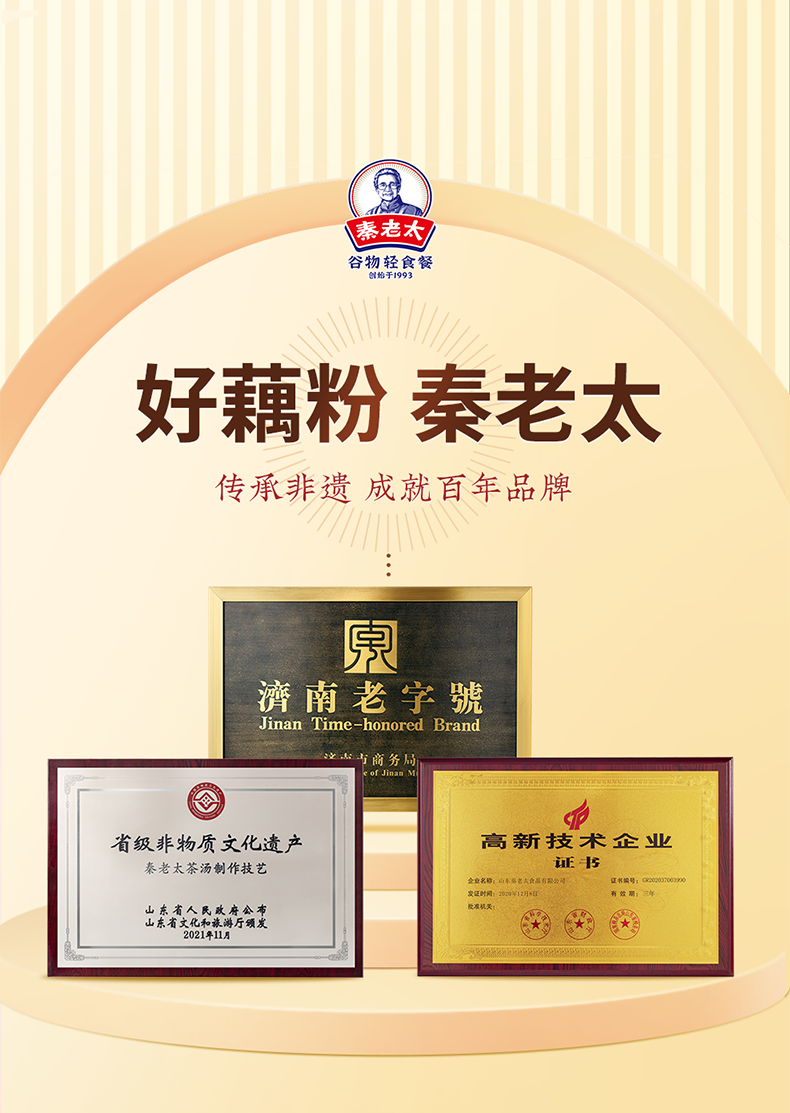 - 秦老太创始于1993年,专注谷物轻食餐。秦老太茶汤,2012年被正式授予非物质文化遗产。进入新时代,秦老太人怀揣匠心精神,以 “为家人制造食品”为理念,传承中华食养文化!