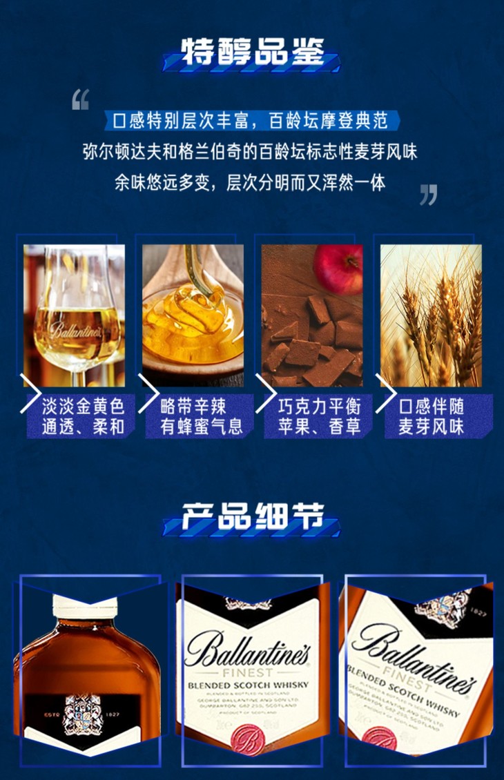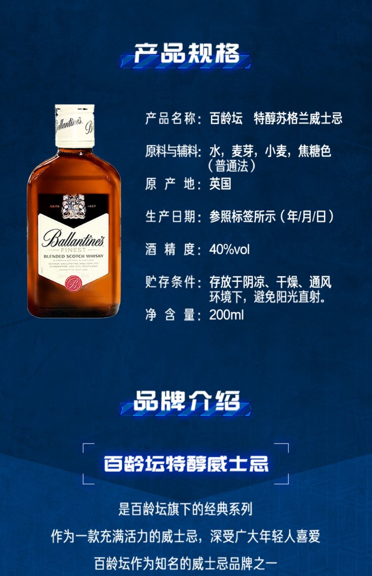 原装进口 Ballantine's百龄坛特醇威士忌洋酒特调200ml/瓶