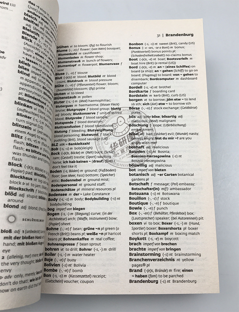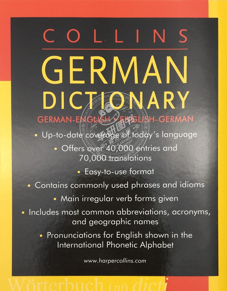Collins German Dictionary《柯林斯德语字典》是语言学习出版社柯林斯推出的简明英语-德语双语字典。该字典体积小巧,方便随身携带,随时使用,适合各阶段德语专业学习者、德语作为第二外语学习者及德语工作者使用。 推荐理由:1.分为英德和德英两部分,编排得当,方便使用; 2.收录四万多词条,约七万条翻译; 3.包含常用短语和习语; 4.提供主要不规则动词形式; 5.附常见缩写词、首字母缩写词和地理名称; 6.英语和德语词条都提供国际音标。 ·Up-to-date coverage of today’s language ·Offers over 40,000 entries and 70,000 translations ·Easy-to-use format ·Contains commonly used phrases and idioms ·Main irregular verb forms given ·Includes most common abbreviations, acronyms, and geographic names ·Pronunciations for English and German shown in the International Phonetic Alphabet