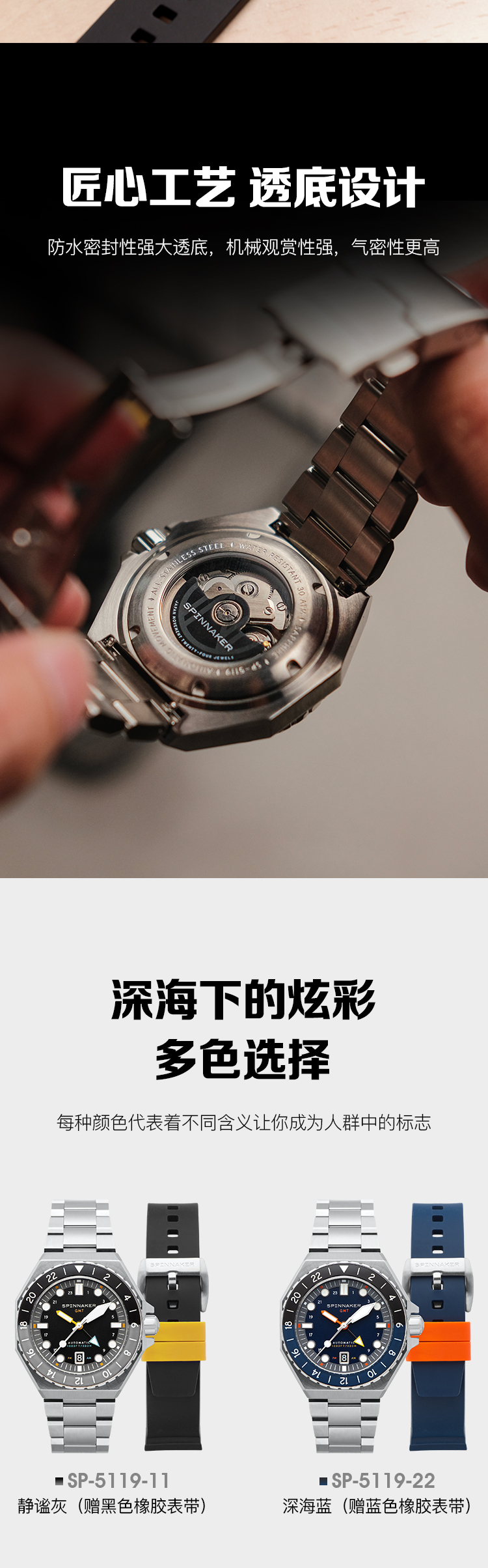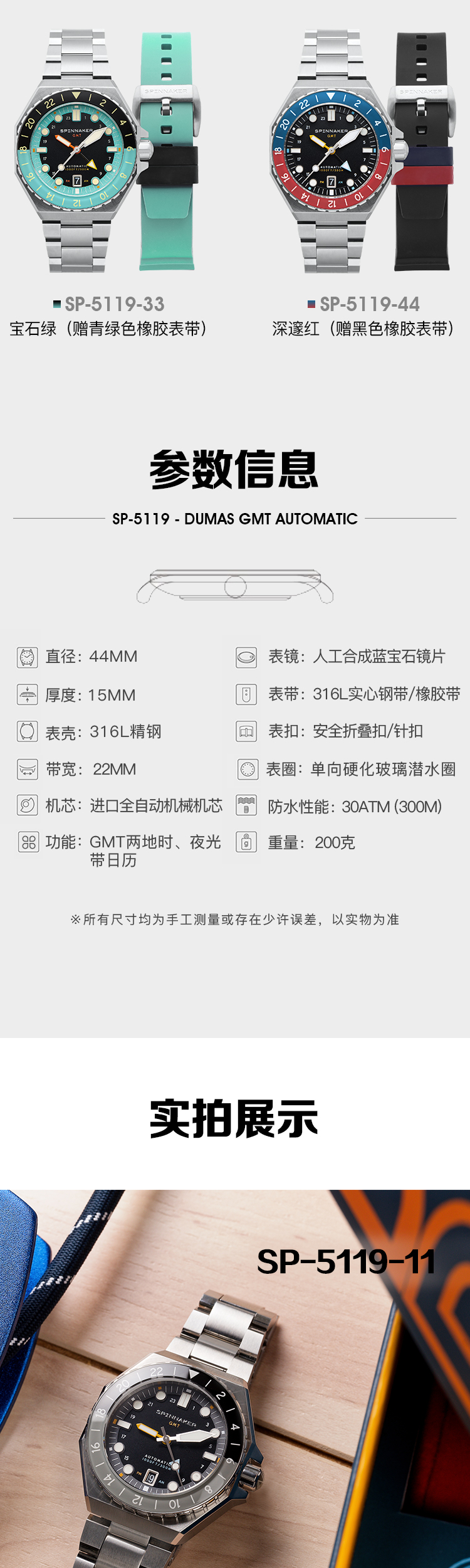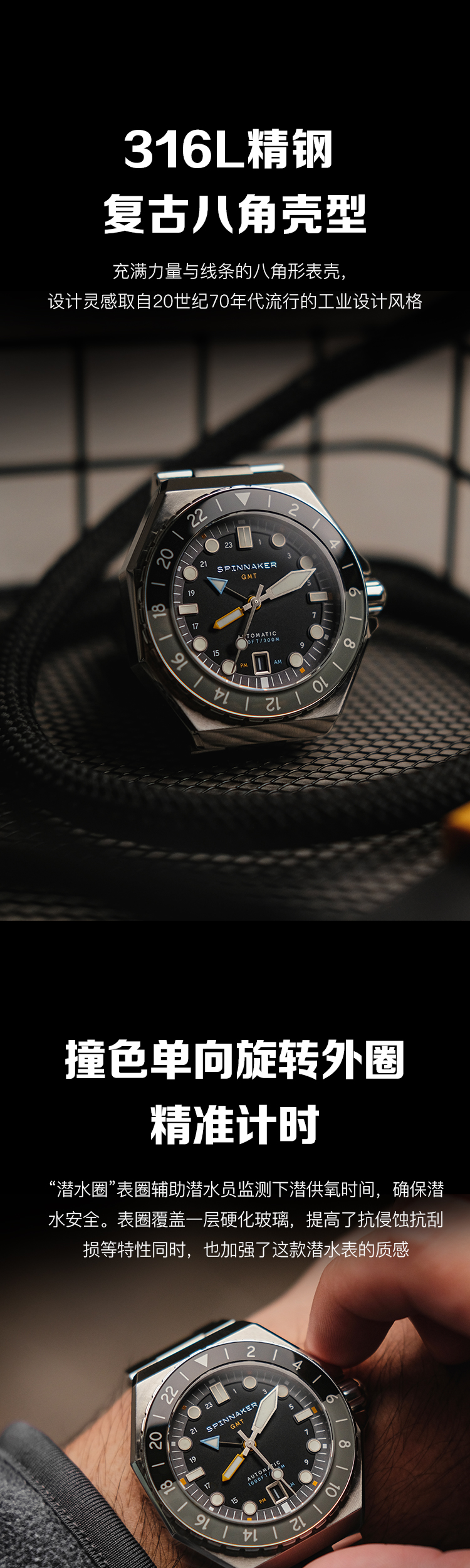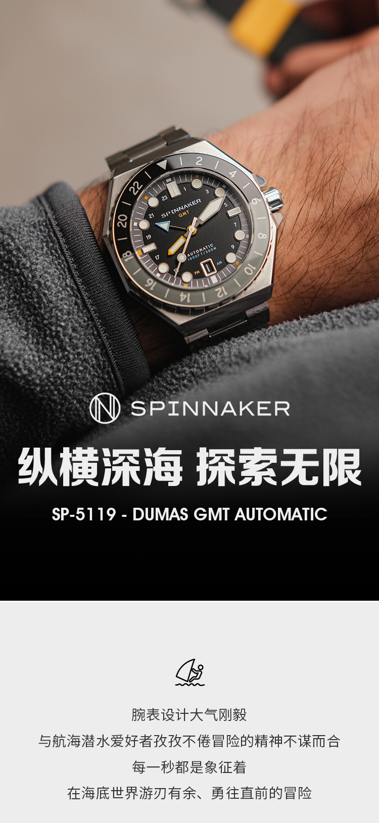 新款SPINNAKER三角帆GMT双时区八角壳自动机械表钢带防水夜光5119
