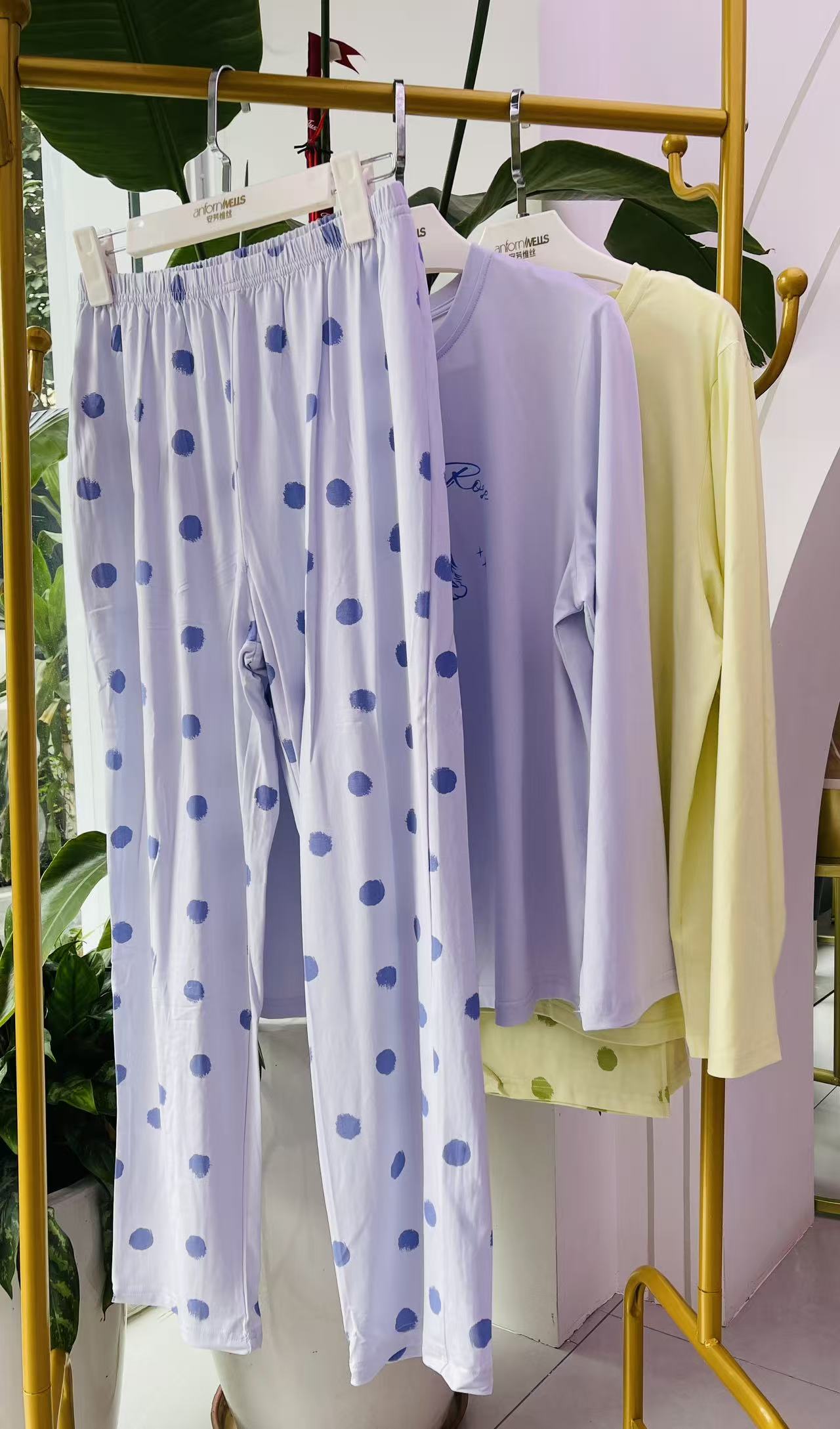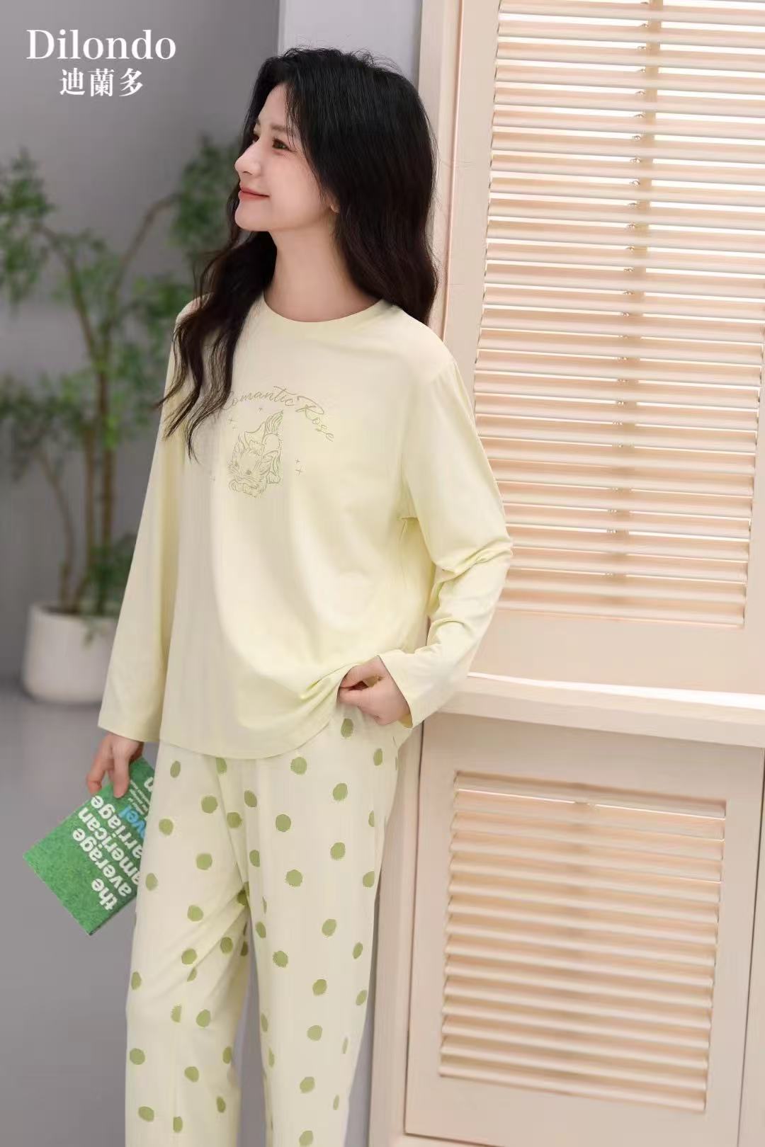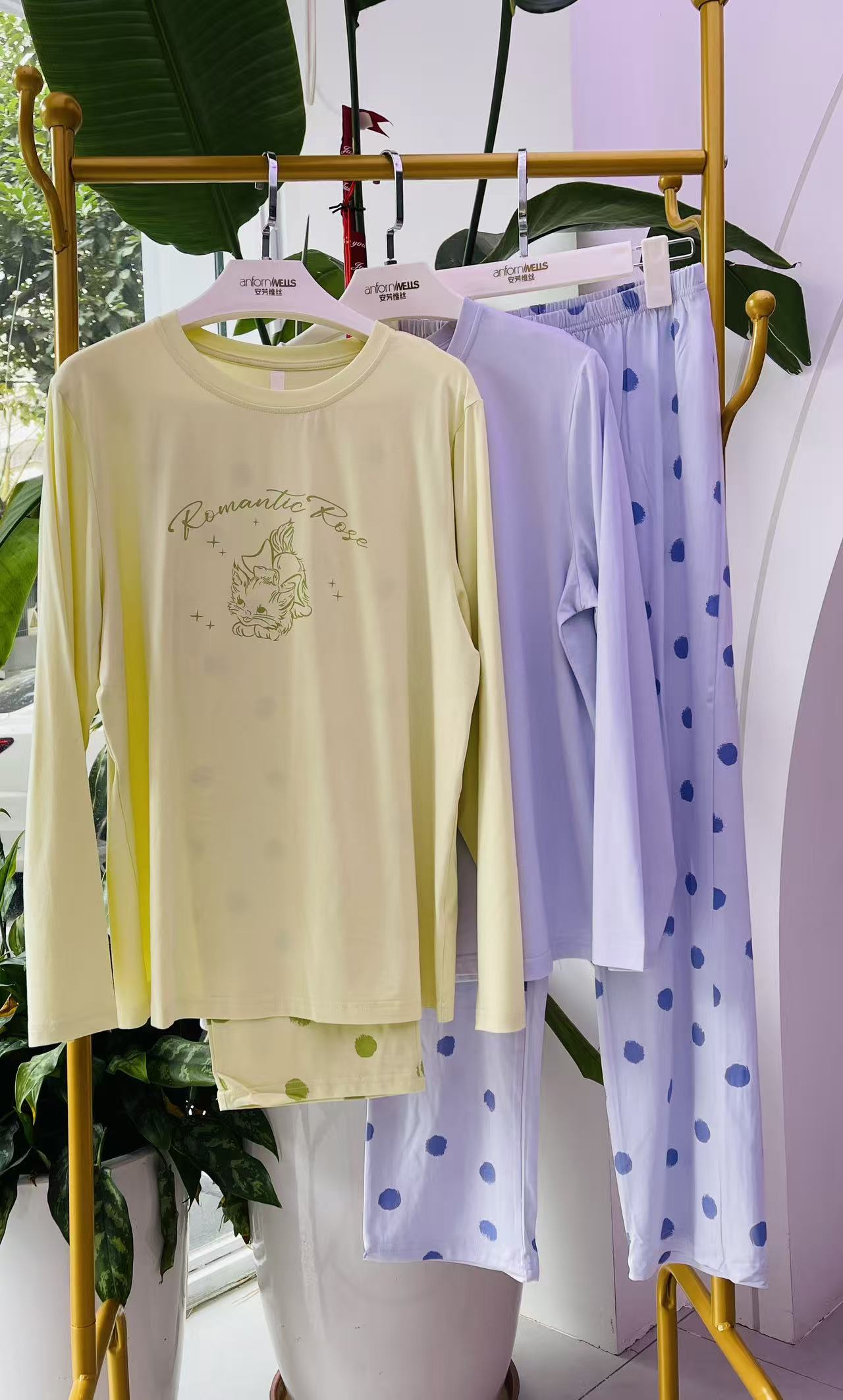 长袖长裤丝光棉圆领女款套装睡衣舒适透气