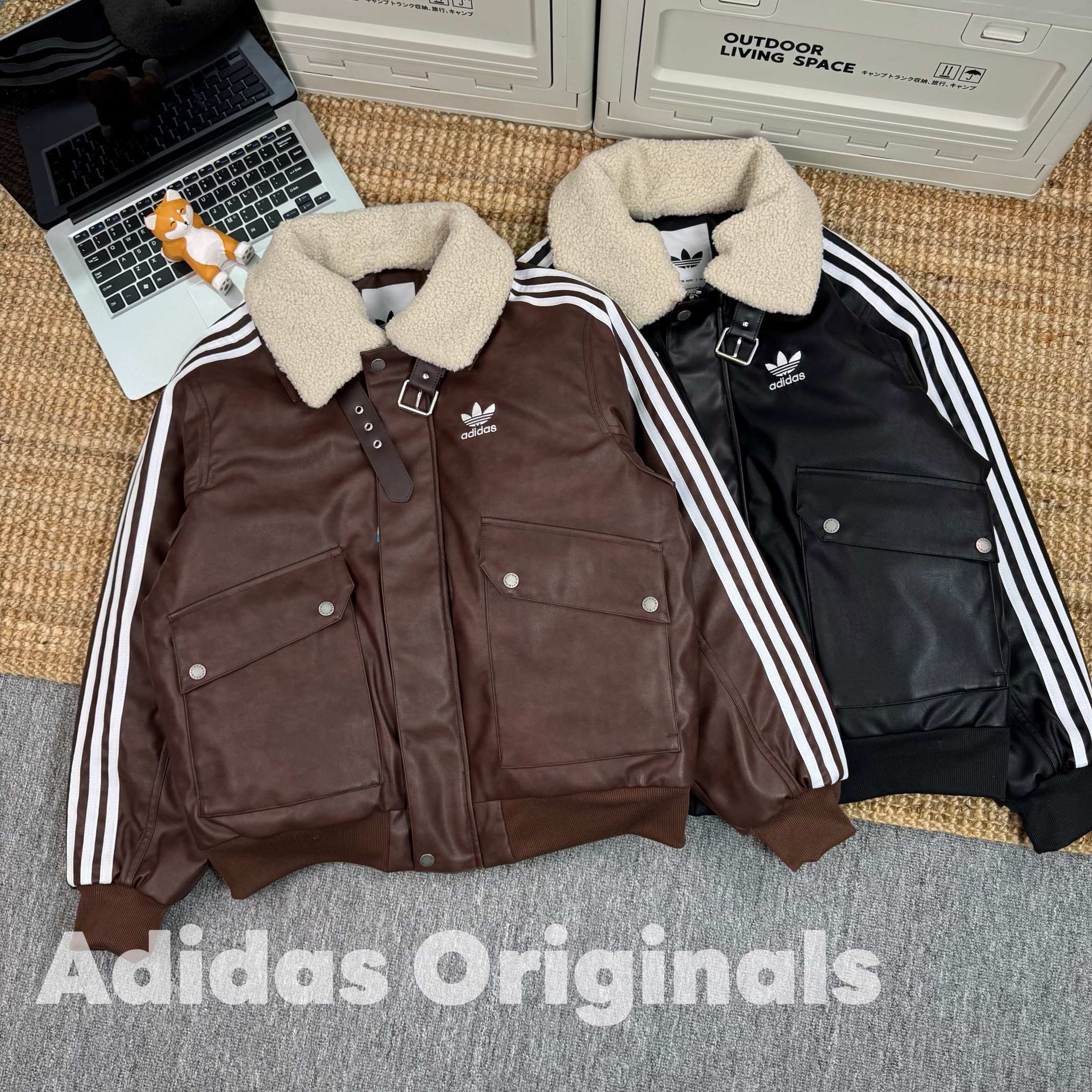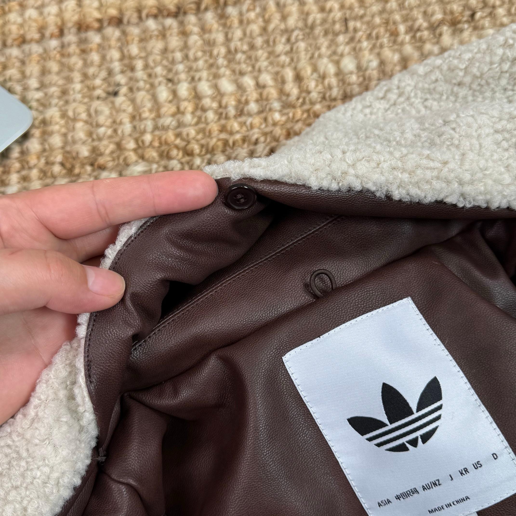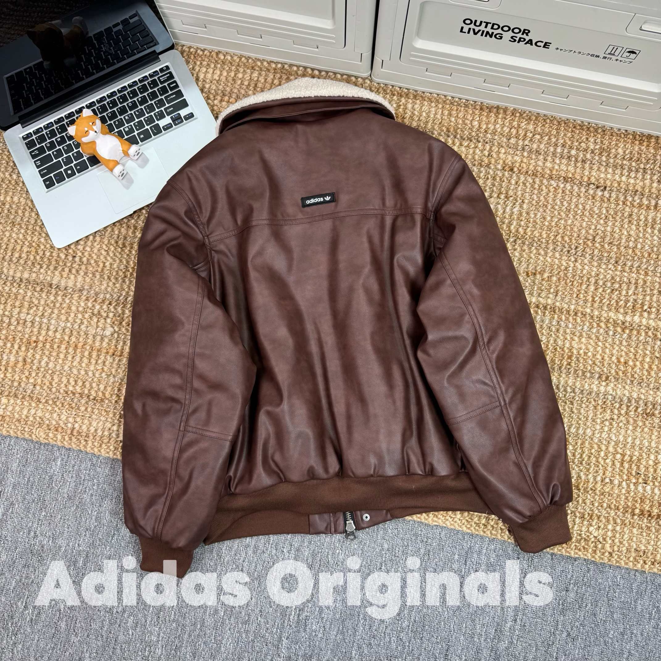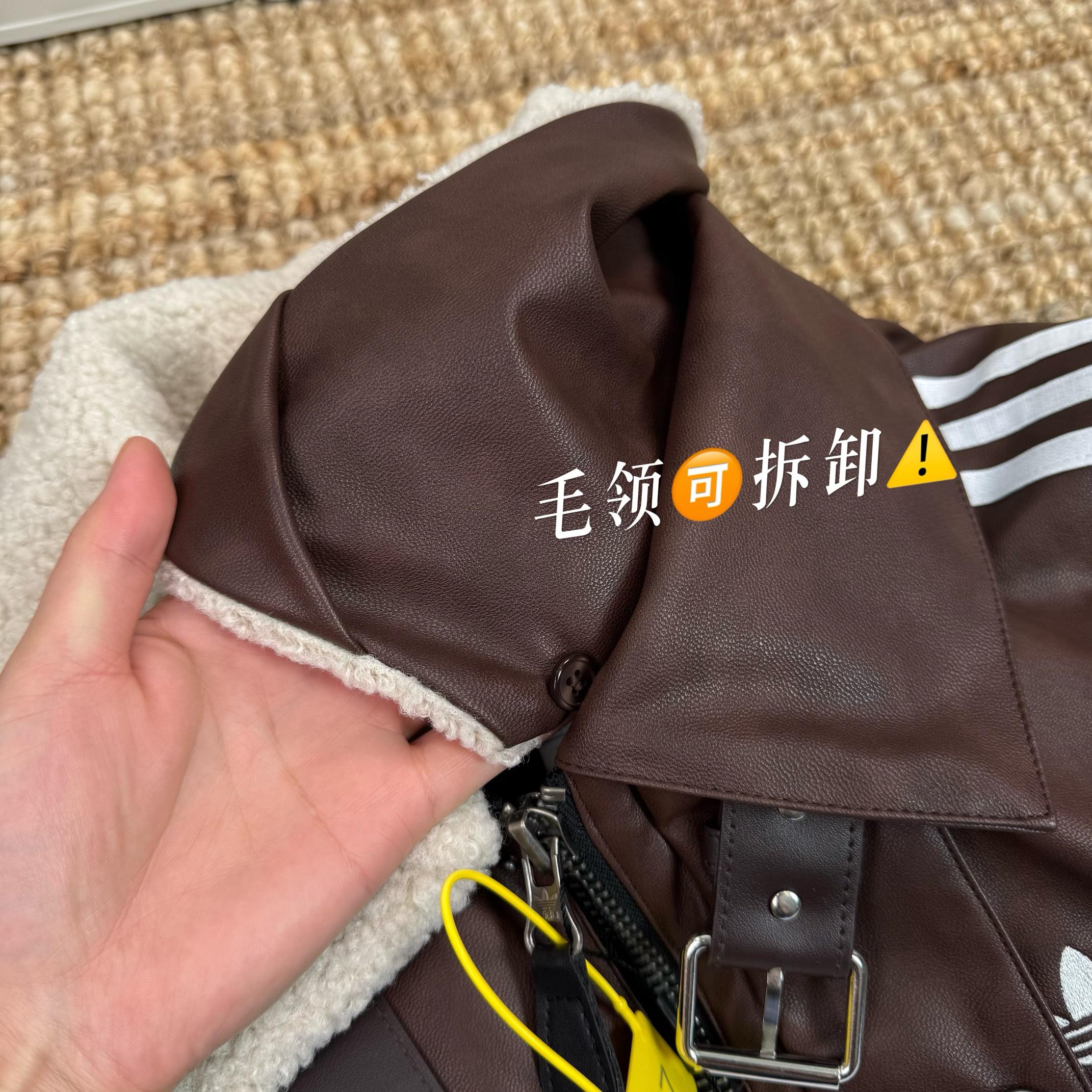 酷飒炸街,皮质软而有质感。棕皮+羊羔领+经典三道杠,把复古运动、甜酷机车、休闲日常这几个风格都捏稳了,搭牛仔裤是街拍感,搭黑裤是酷飒风