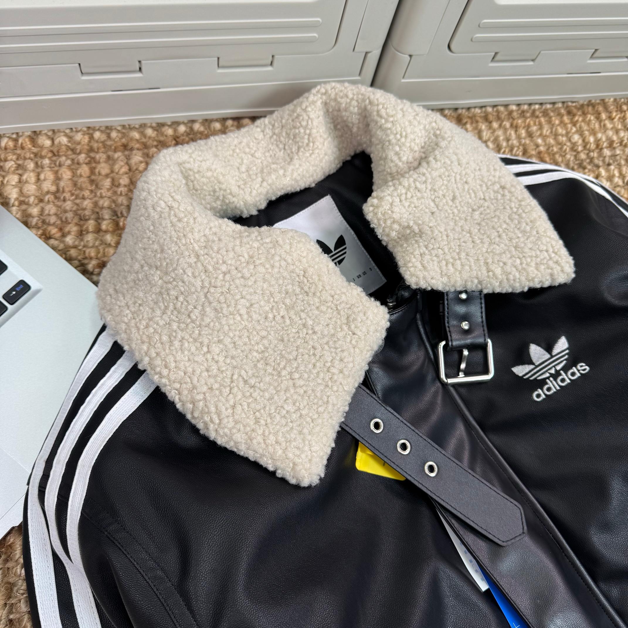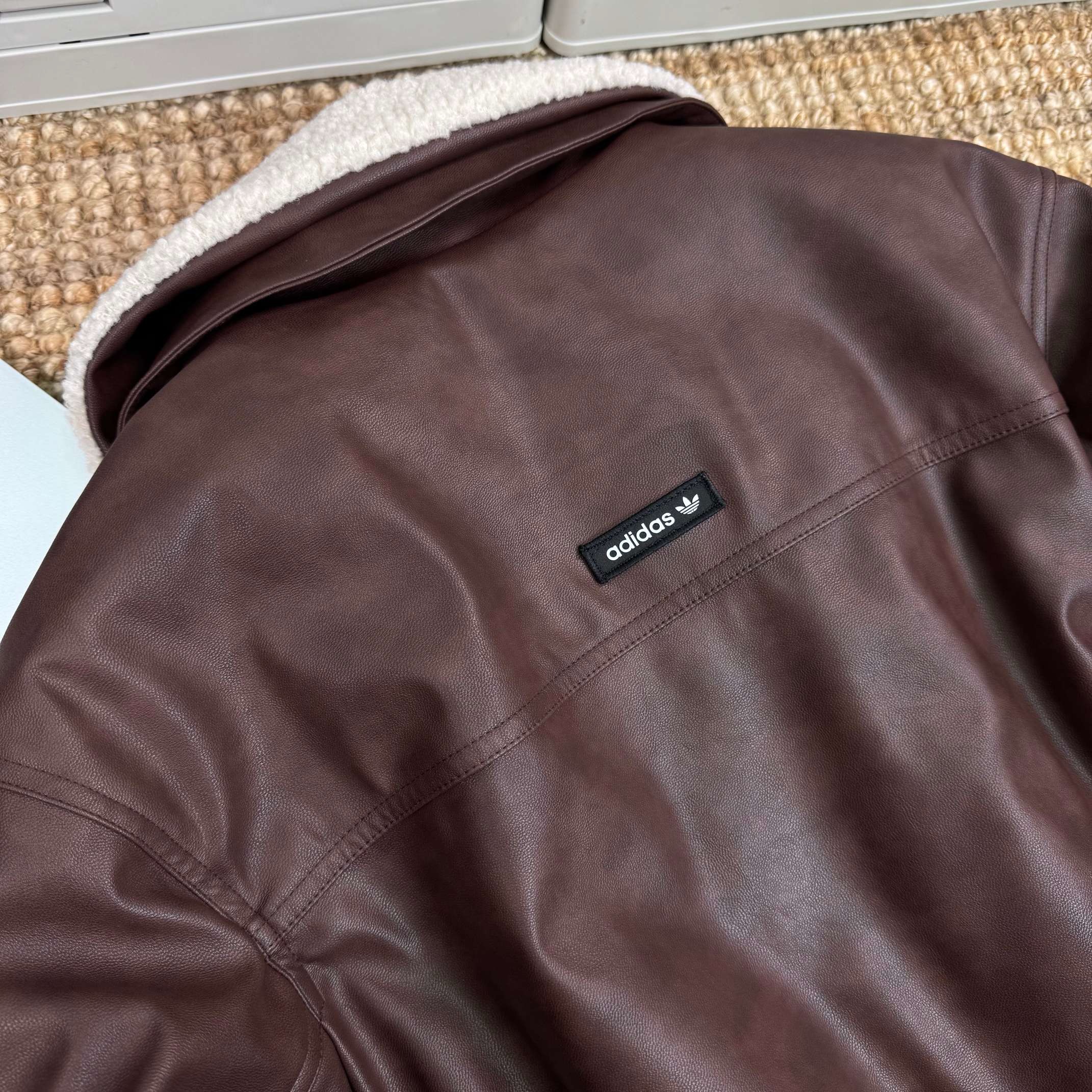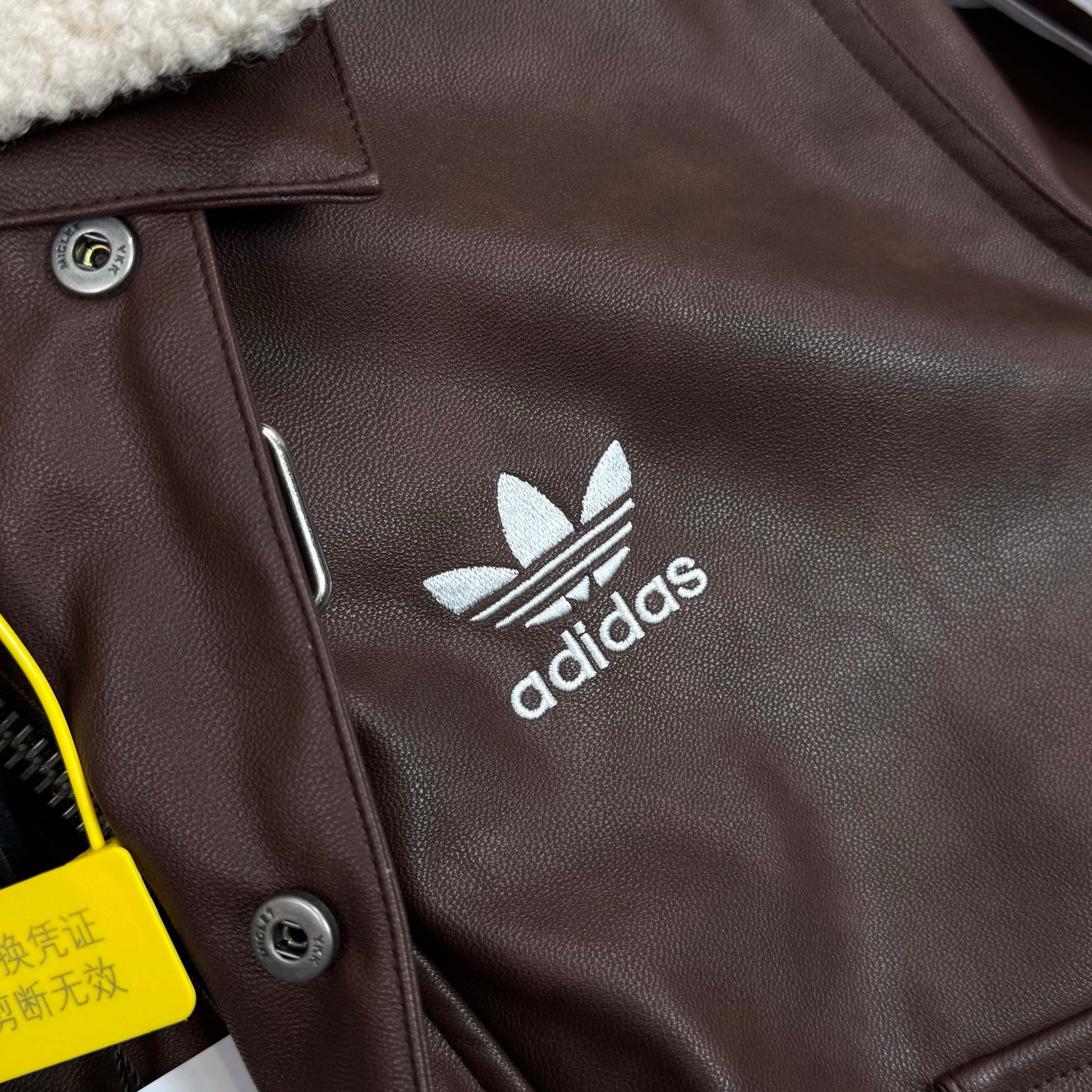 酷飒炸街,皮质软而有质感。棕皮+羊羔领+经典三道杠,把复古运动、甜酷机车、休闲日常这几个风格都捏稳了,搭牛仔裤是街拍感,搭黑裤是酷飒风