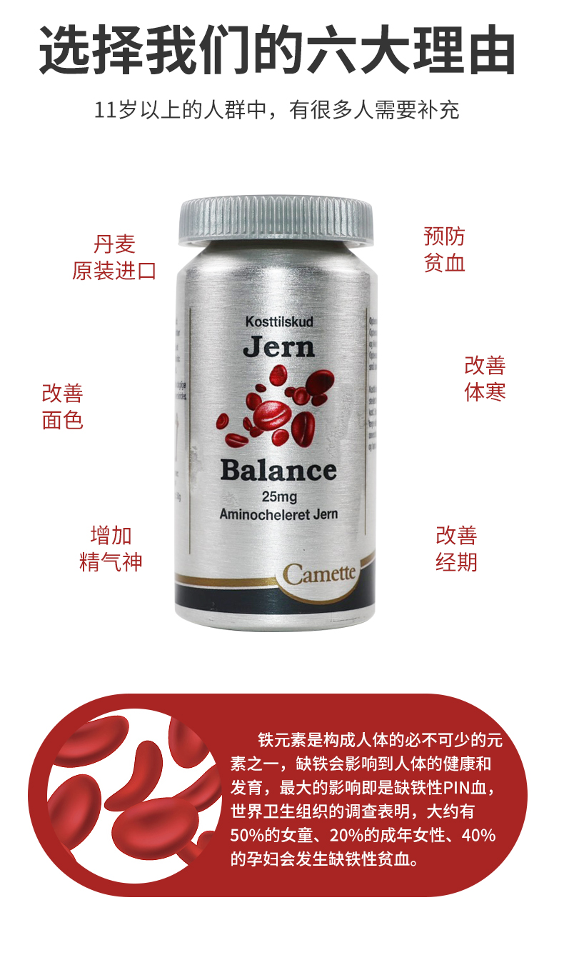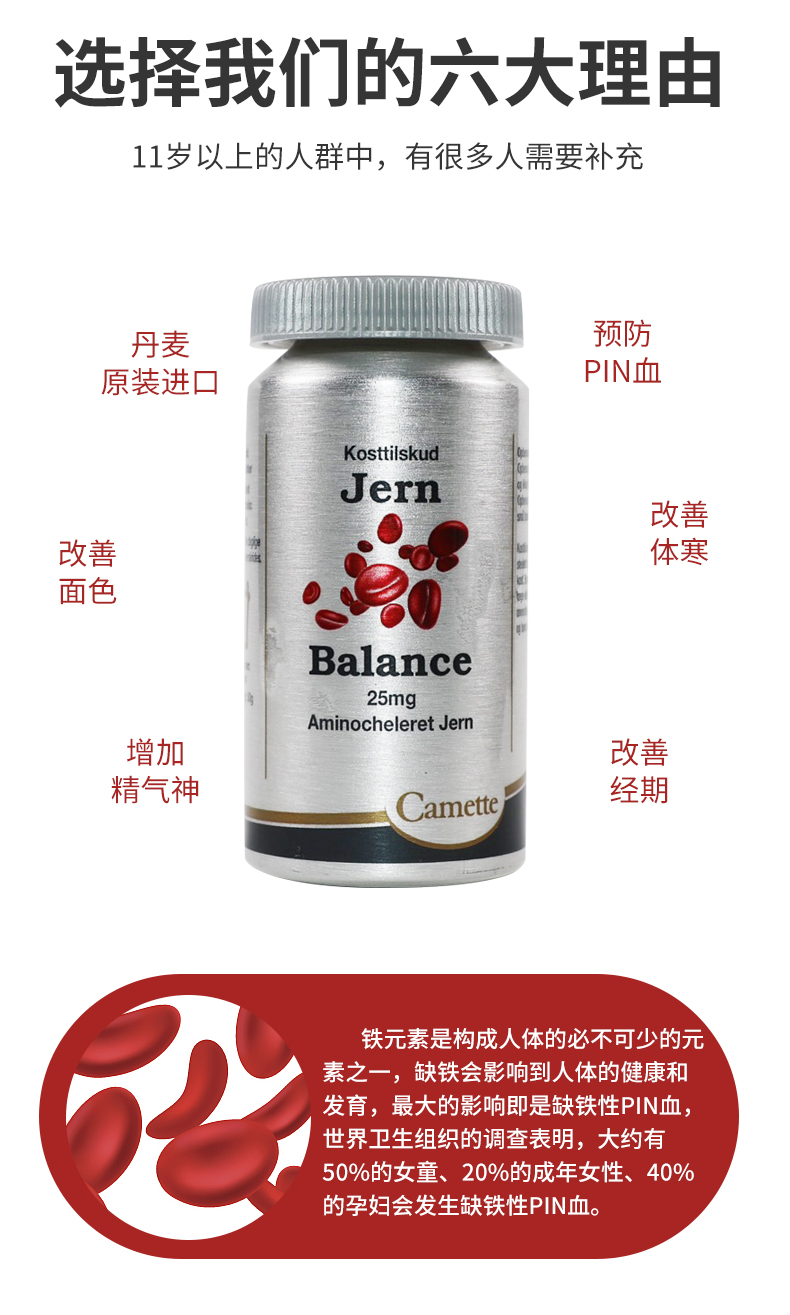 丹麦Camette 氨基酸复合铁片100粒|保税