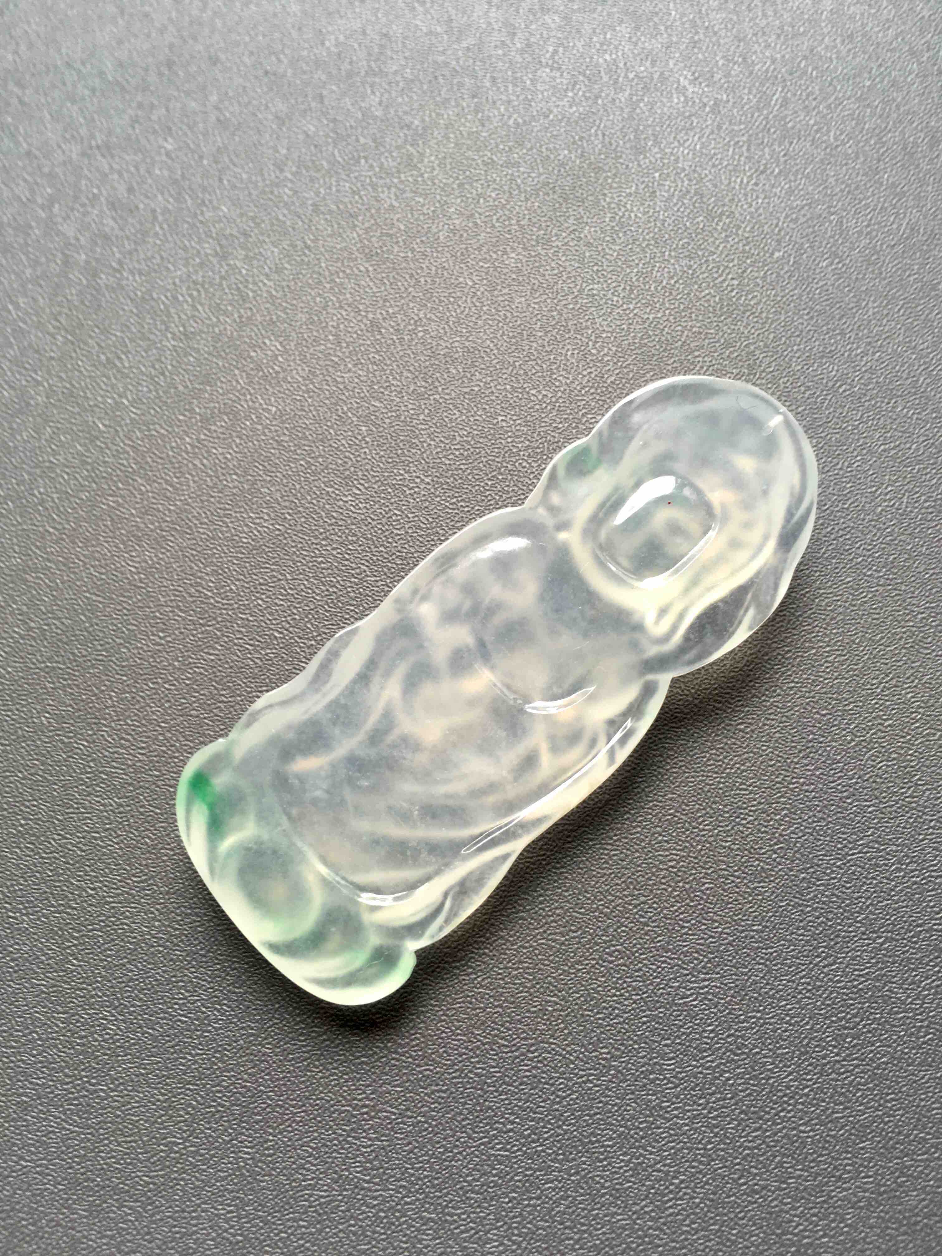高冰到玻璃种飘阳绿翡翠文殊菩萨,57.6×23.1×6.6mm,属兔的本命佛,种水晶莹剔透,荧光四射,阳绿巧雕莲花座,尺寸很大气,立体饱满,雕工精美,雕刻形象特别做得萌一点,更具现代感,这么漂亮的文殊菩萨不好找,是缘分别错过了