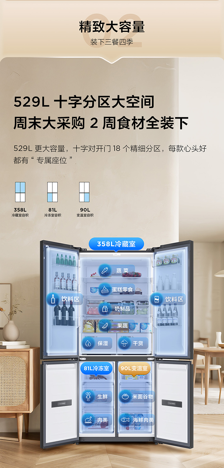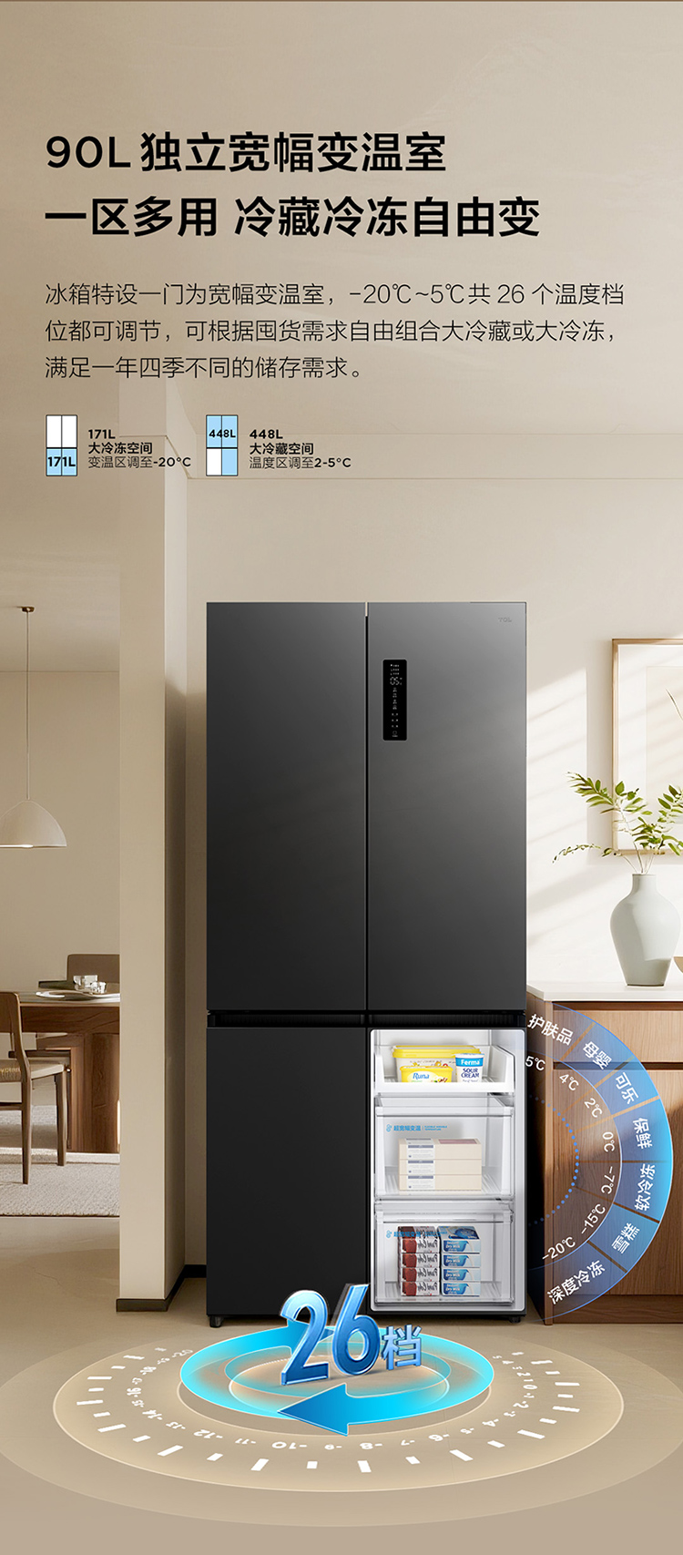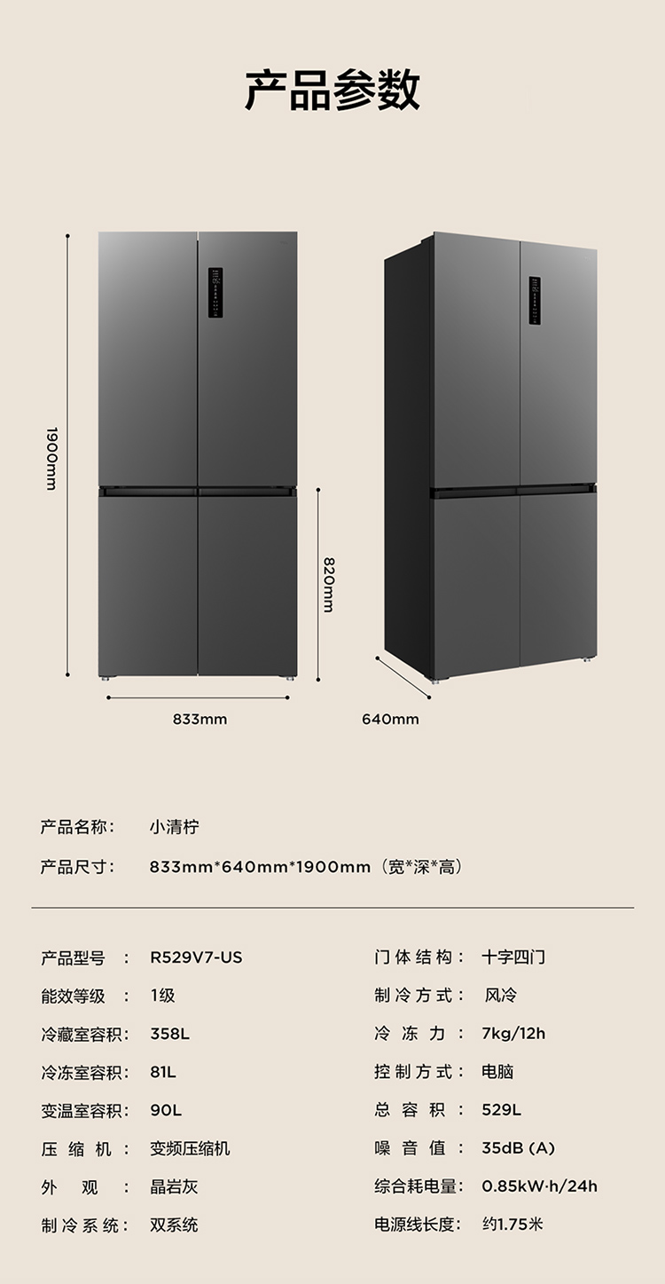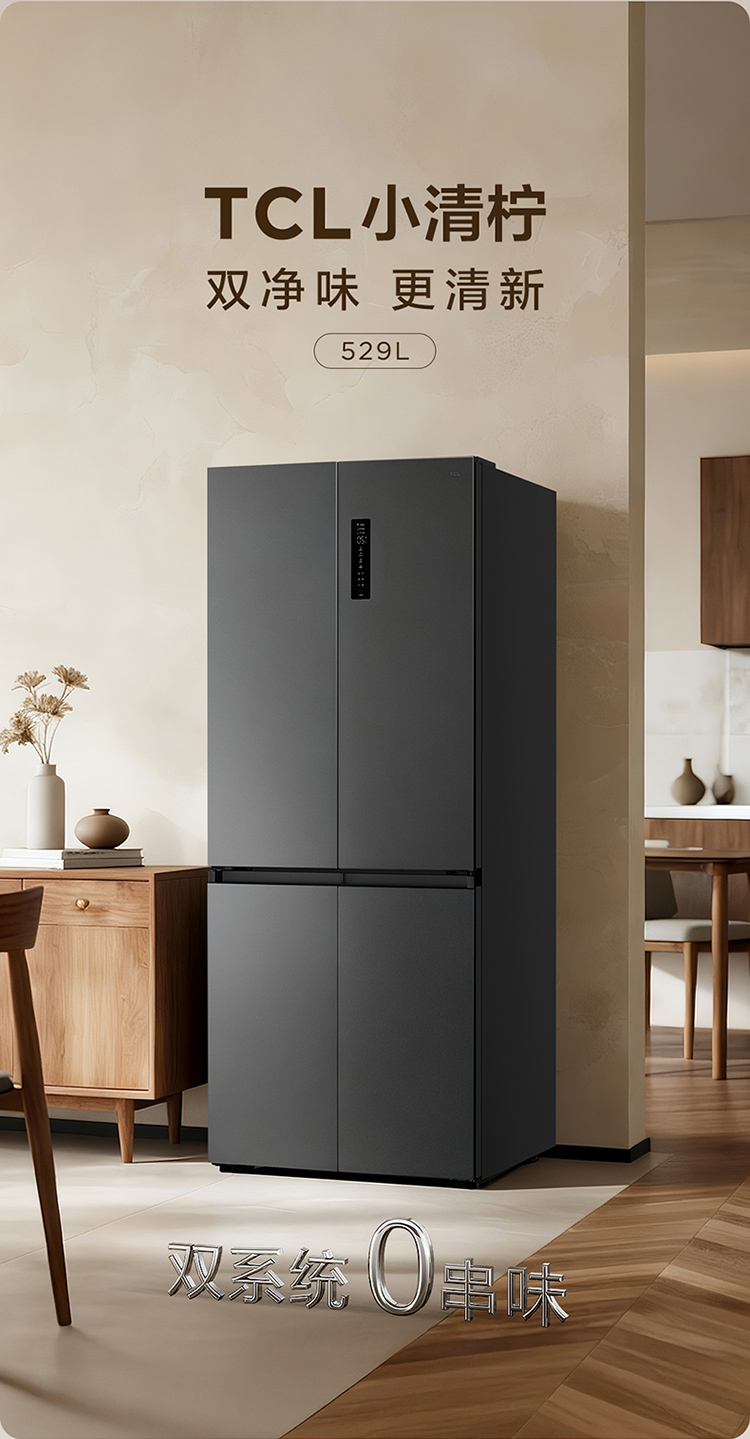 【新品上市】TCL 小清柠529升十字对开四开门双系统双净味大容量宽幅变温冰箱 R529V7-US